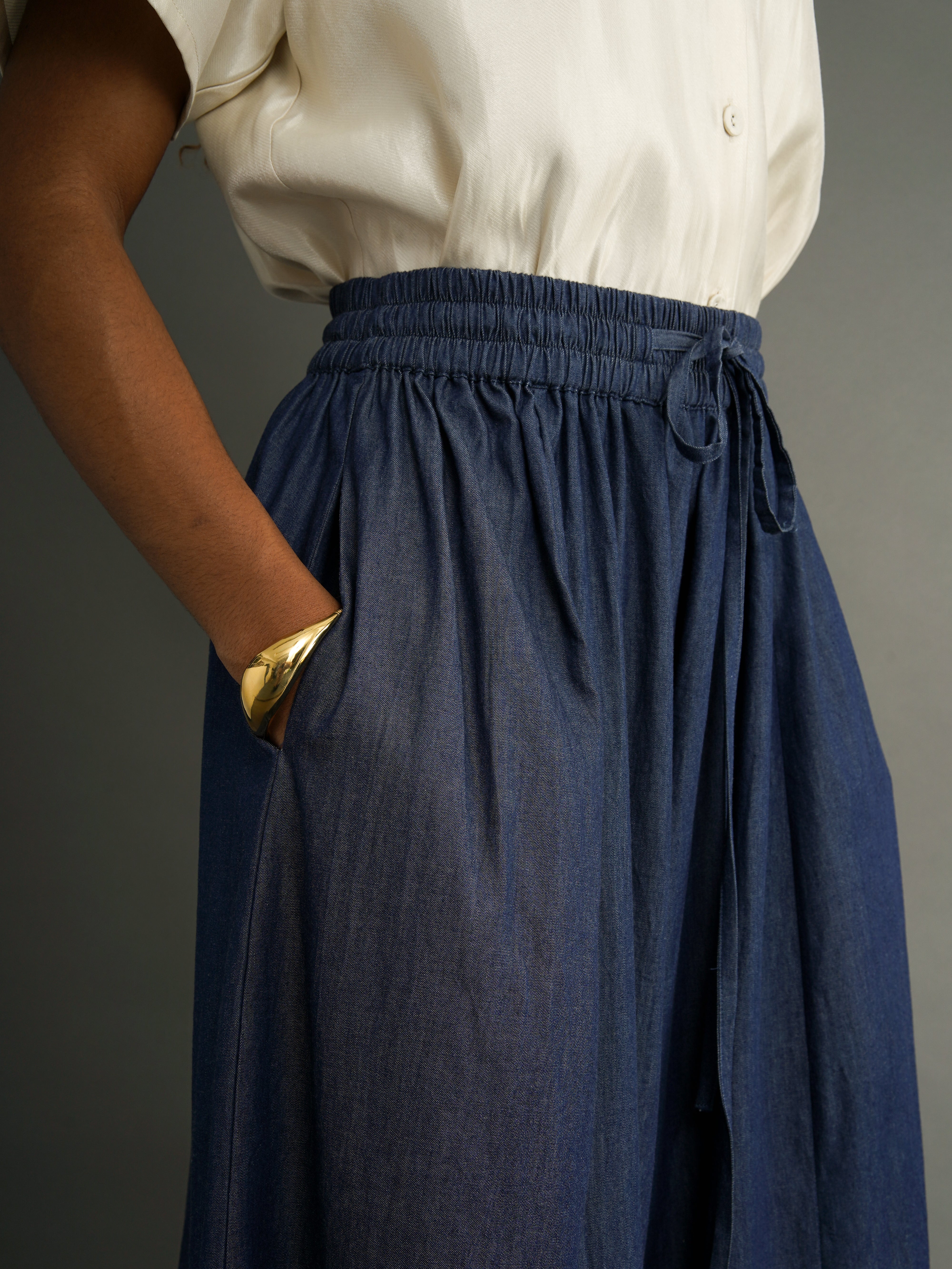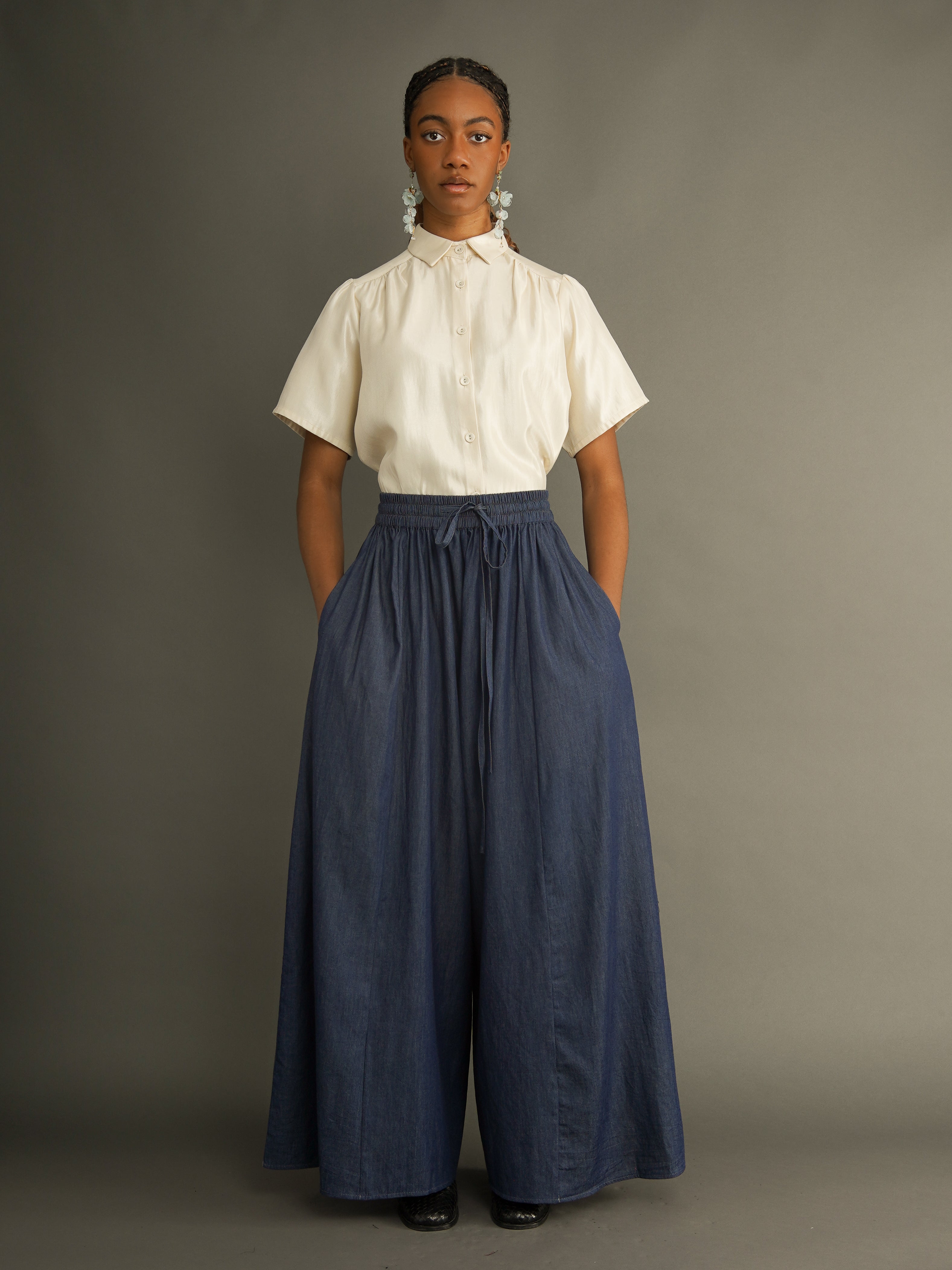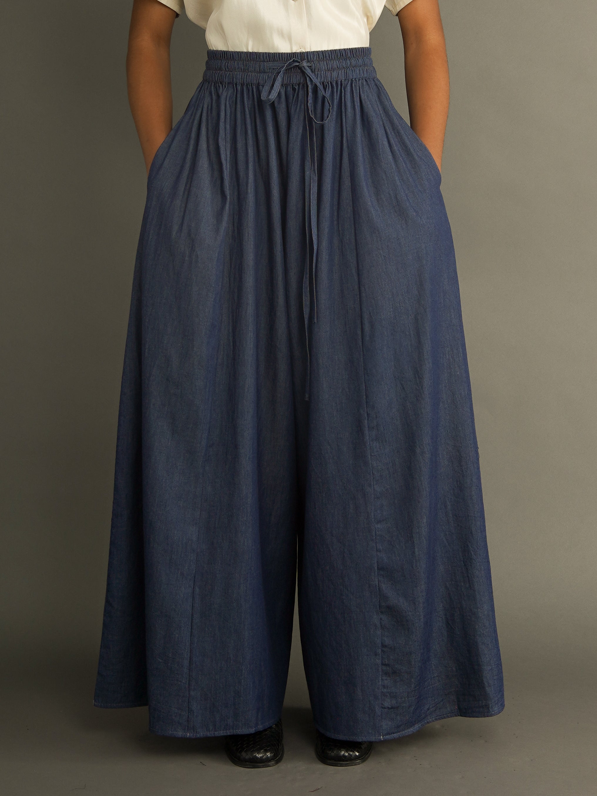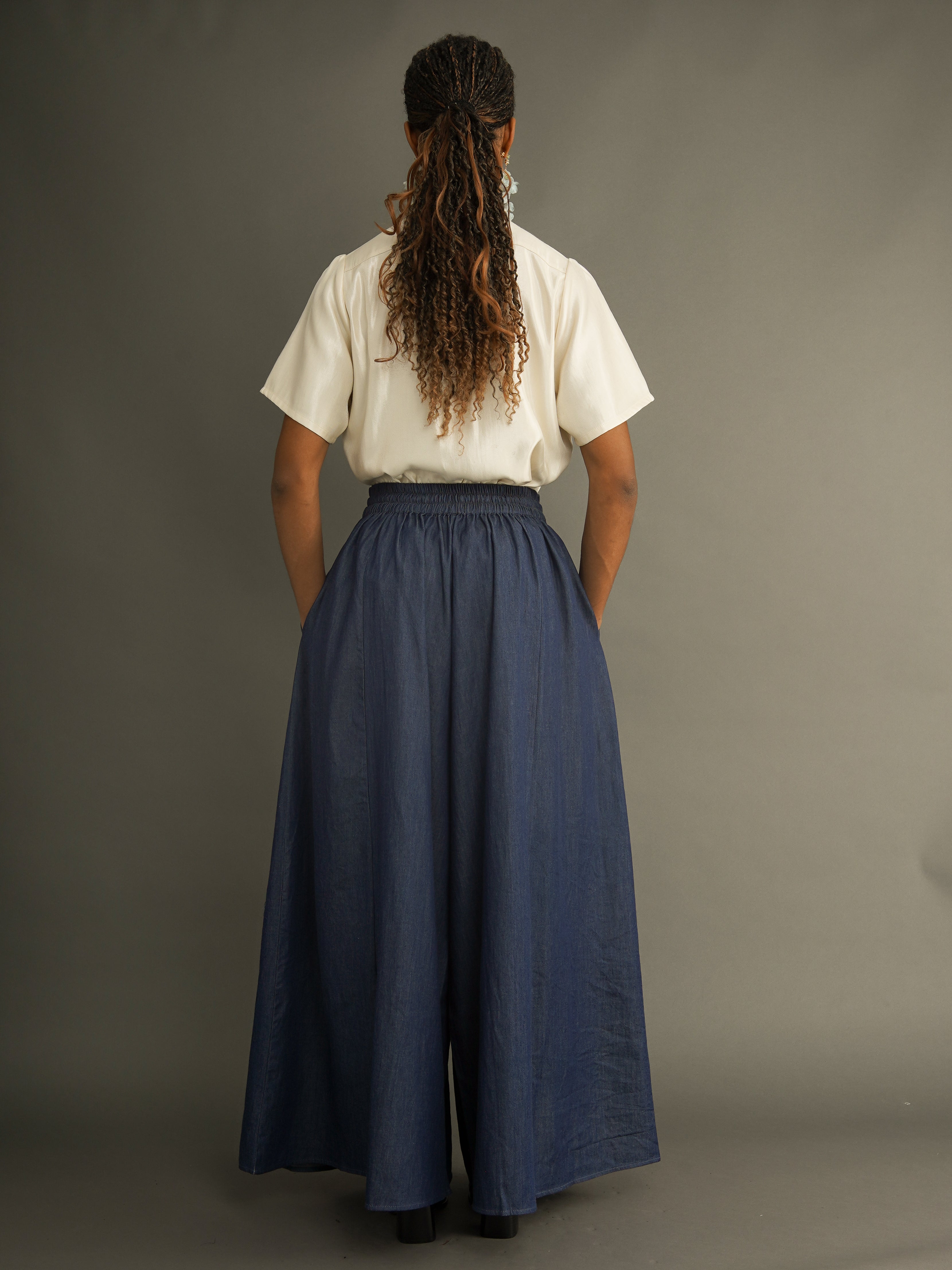 Relaxed, full-length palazzo trousers cut from soft-washed, 100% cotton denim. Lightweight yet structured, they move easily through your day with a wide-leg silhouette that balances ease and intention.