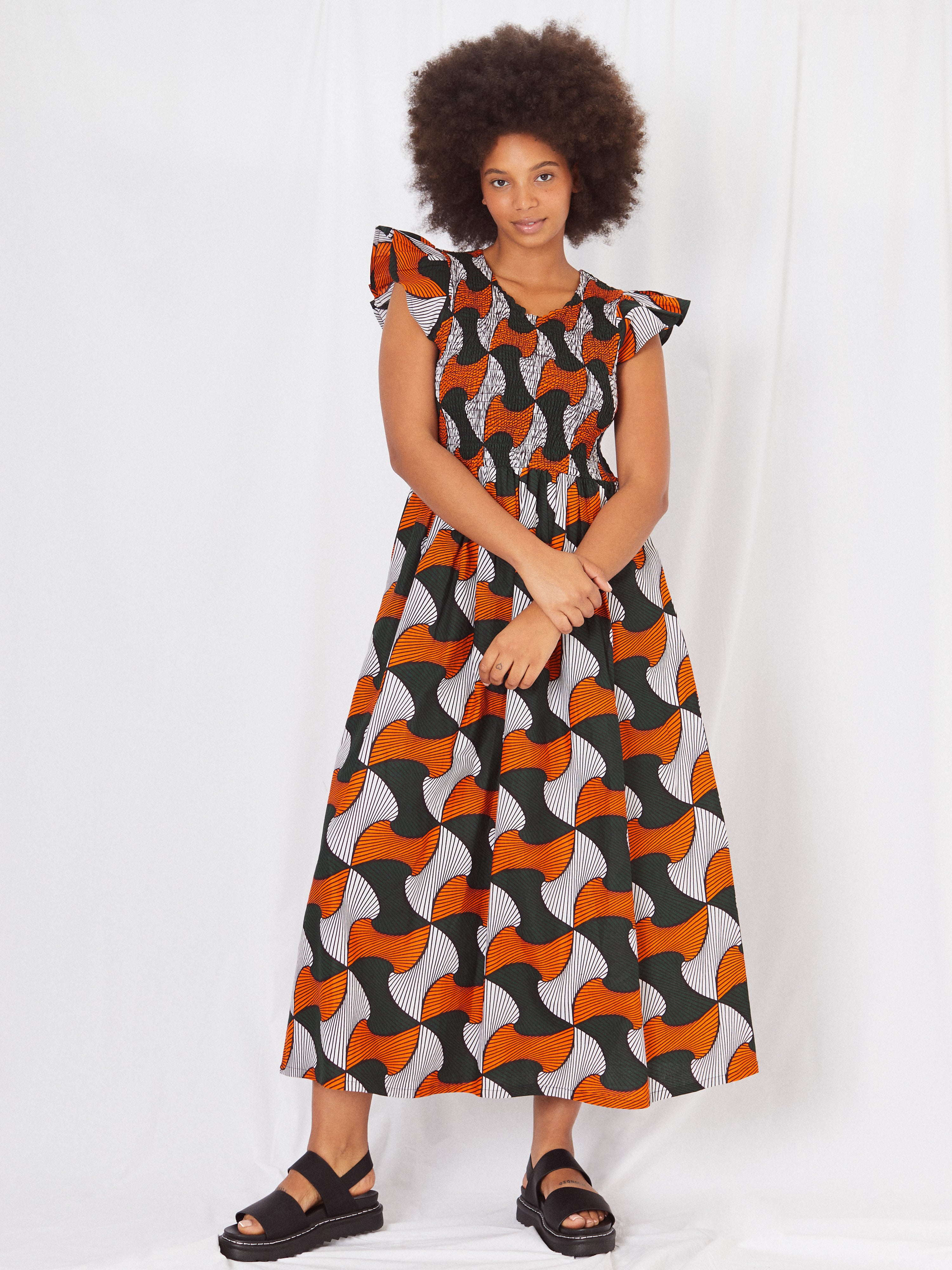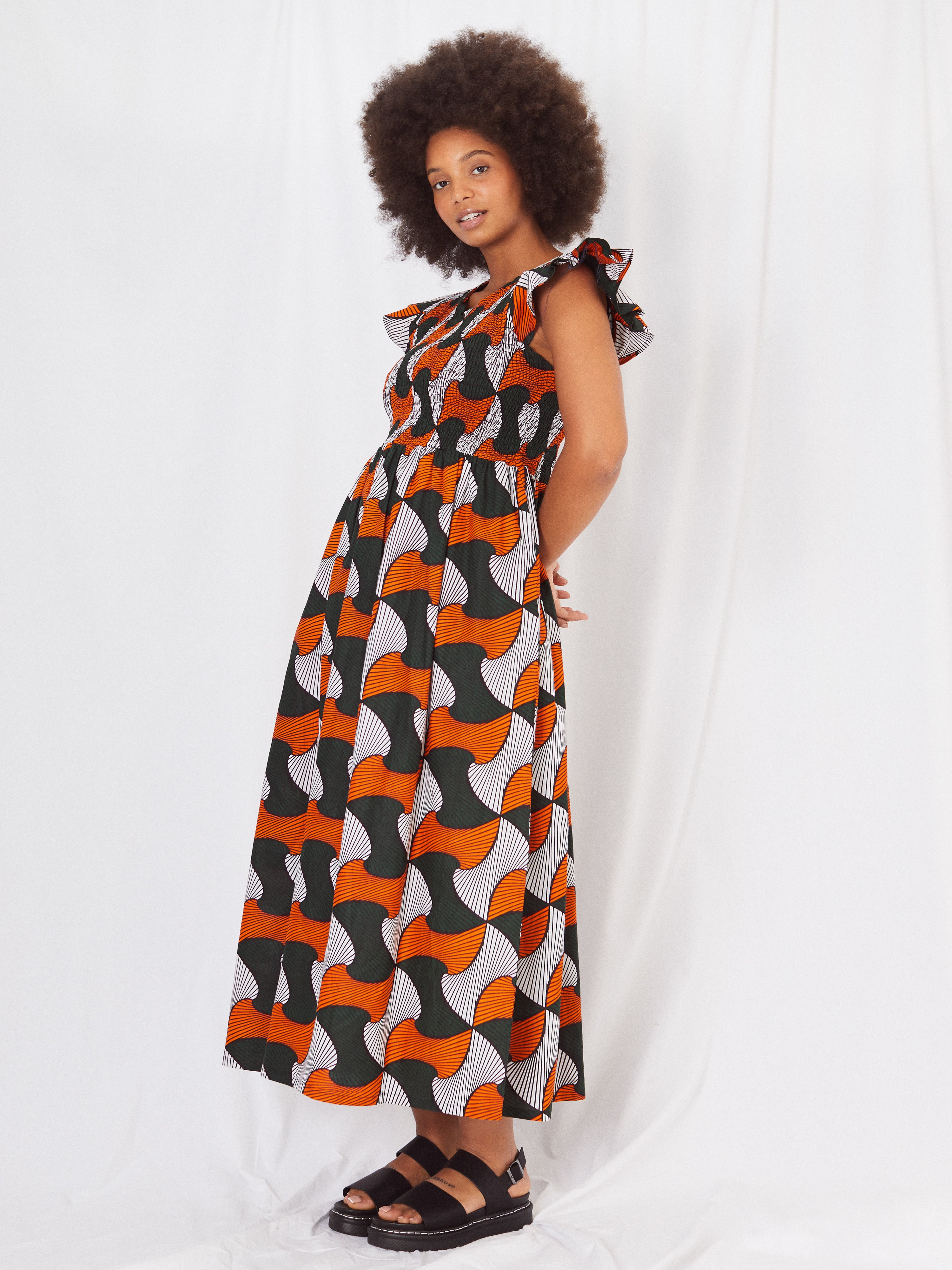 The smocked bodice gently shapes the upper body without feeling restrictive, making it easy to wear and forgiving on different body shapes. Frilled umbrella sleeves add softness and movement, balancing the clean lines of the skirt. The result is a relaxed silhouette that still feels considered and pulled together.
