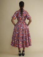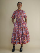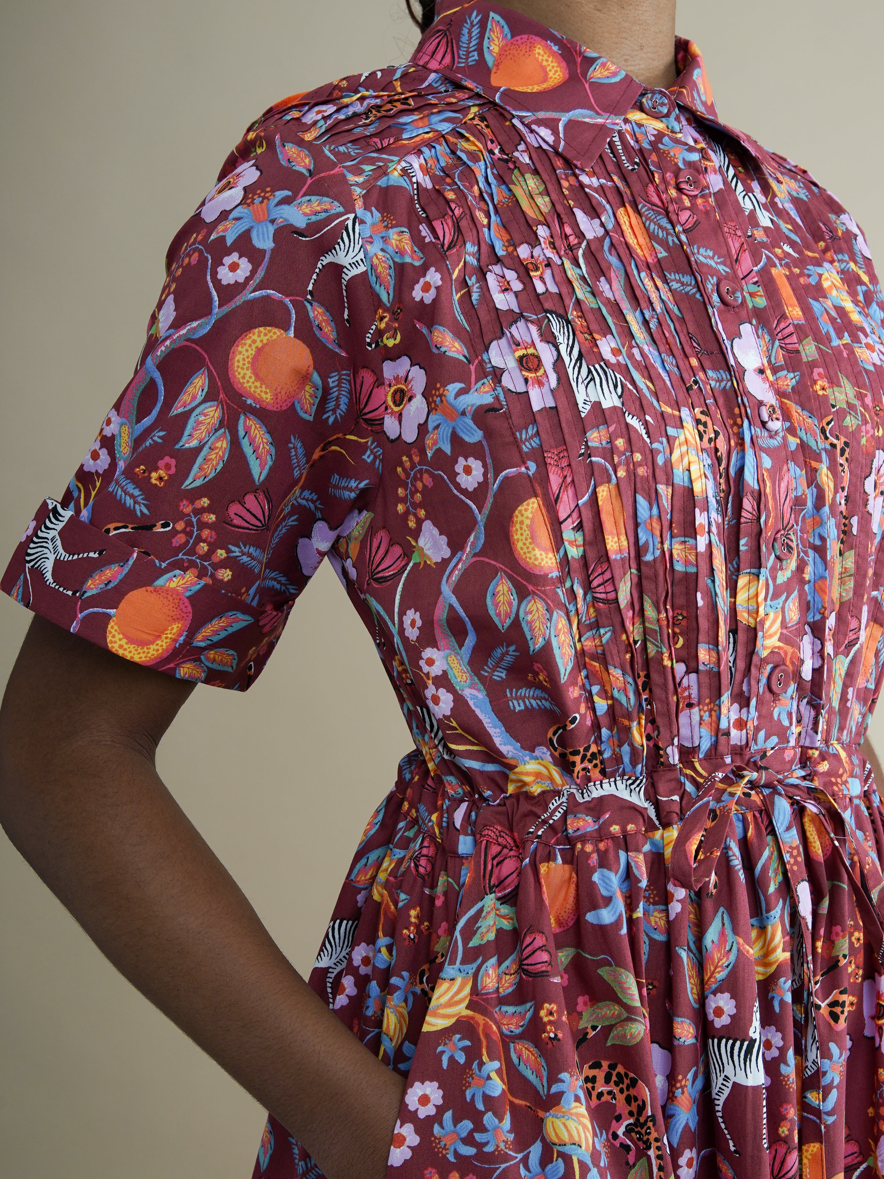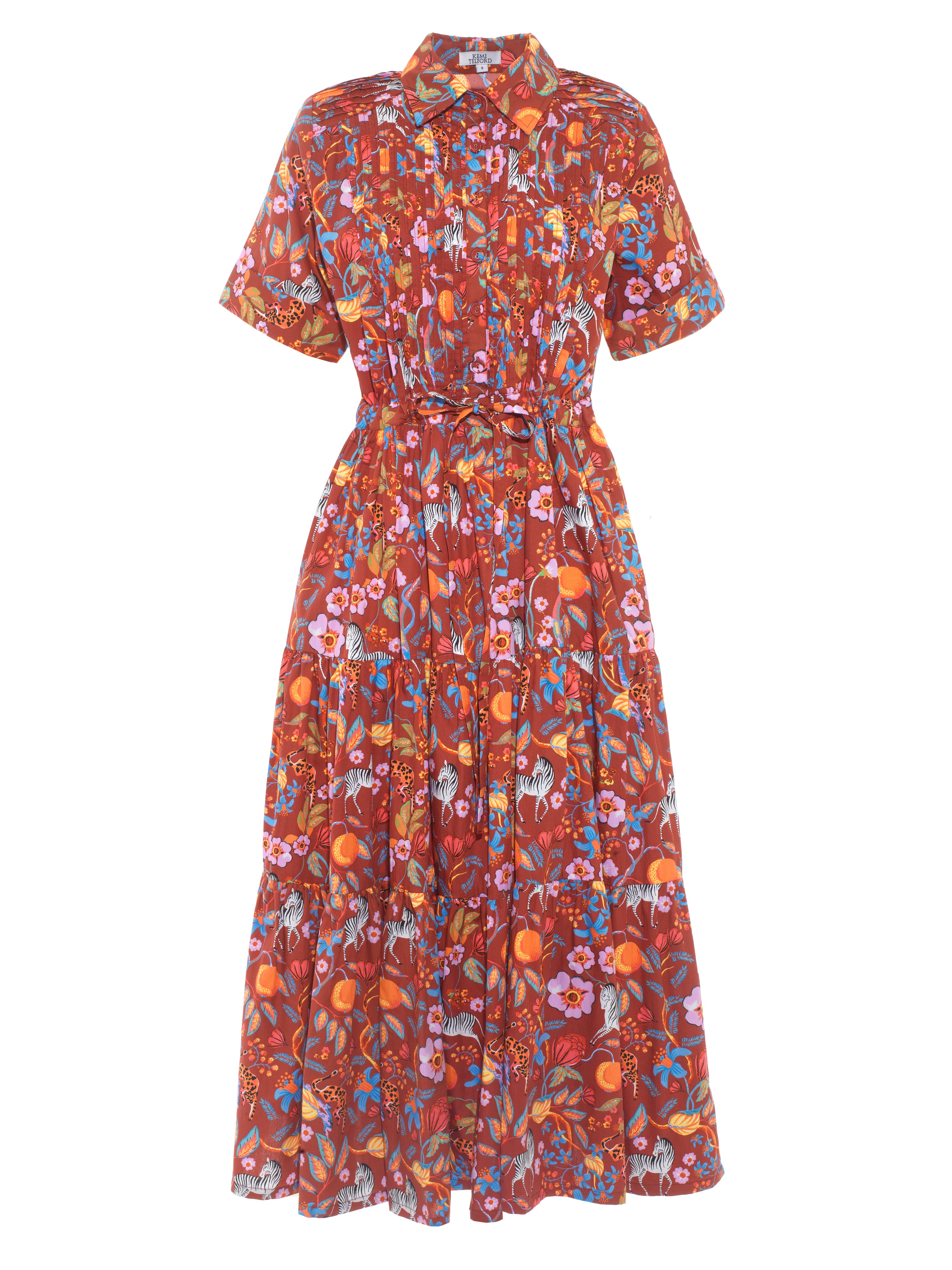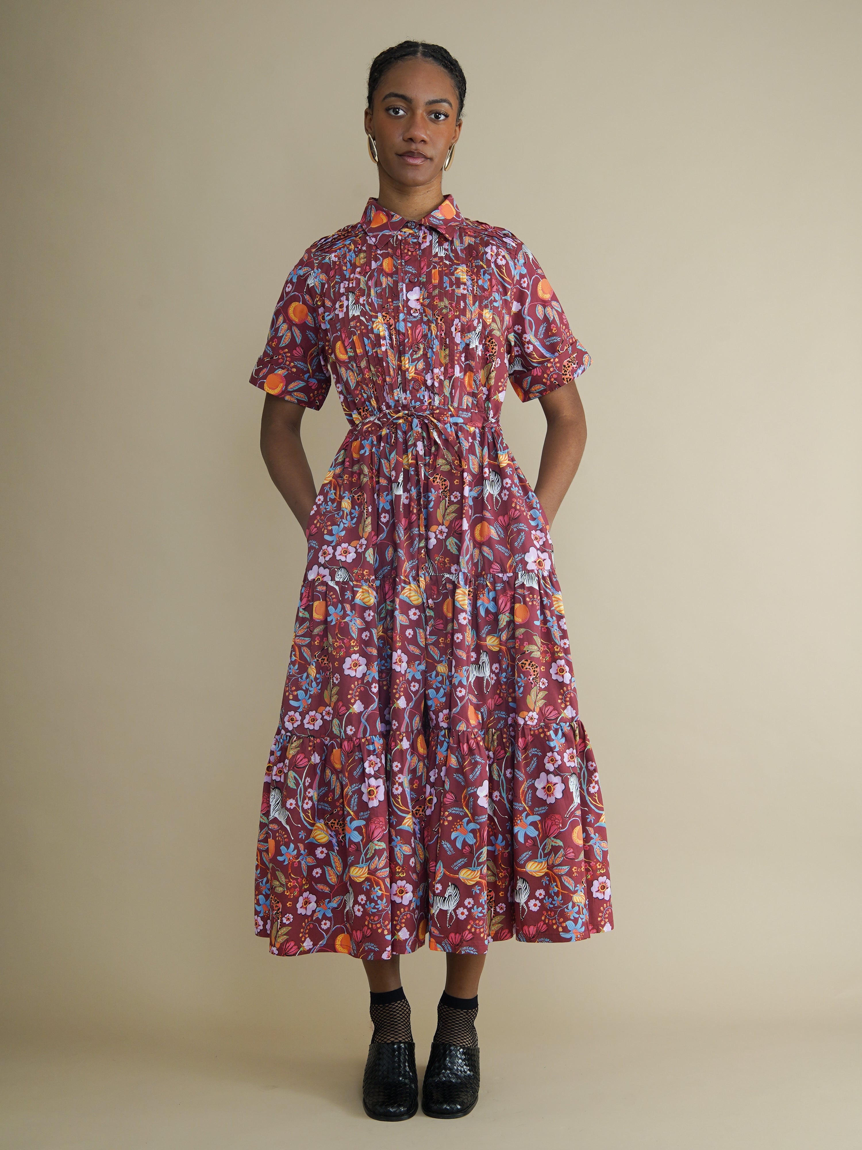 Details matter. A shirt collar neckline frames the face, while hand-stitched pintuck pleats and an adjustable drawstring waist give you control over the fit. The tiered skirt moves freely as you walk, covered buttons add subtle drama, and deep pockets keep it grounded in real life.
