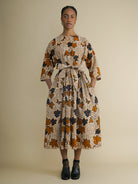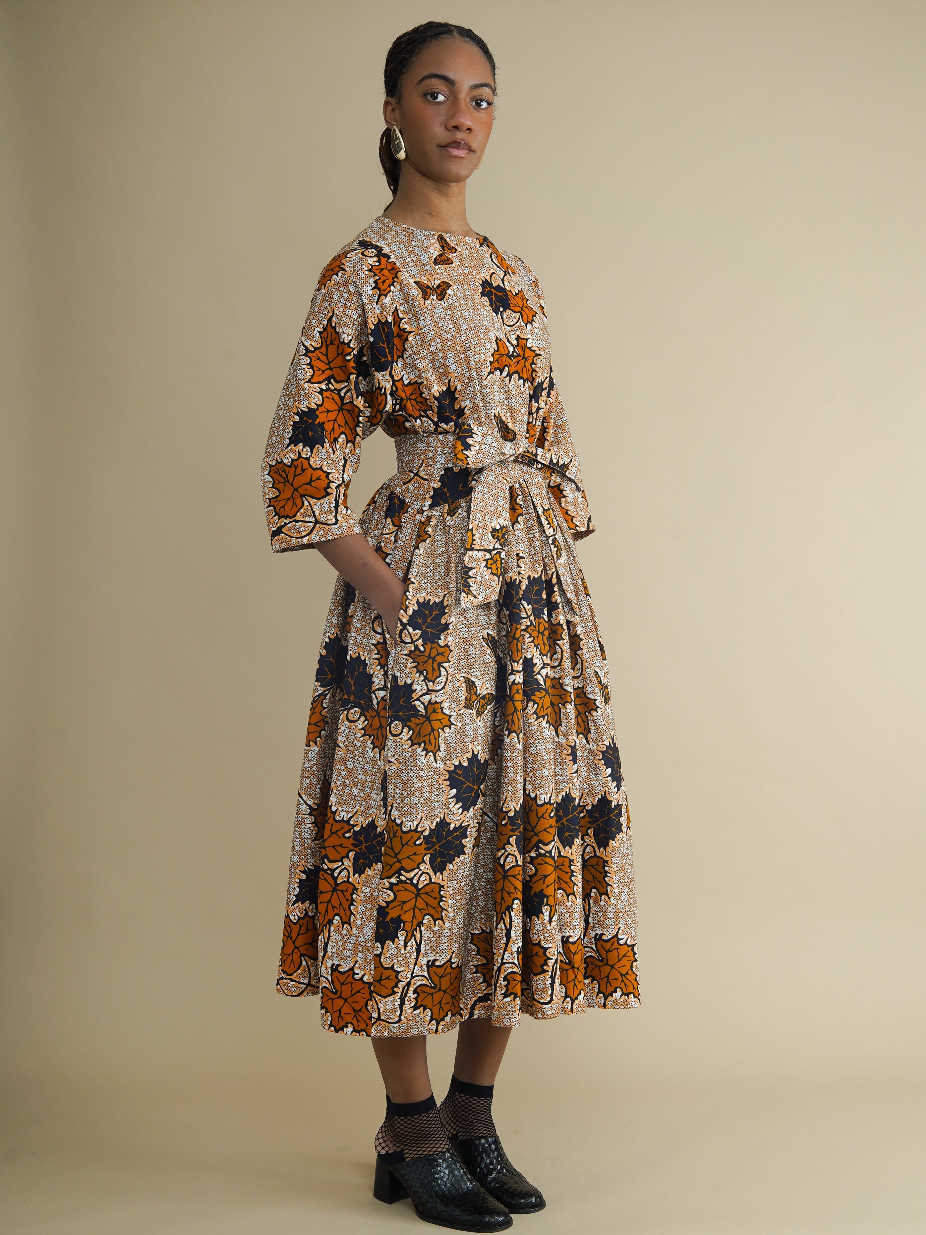 Mid-weight Dutch wax cotton with bold structure and shape. An easy, generous fit with the option to cinch at the waist. Finished with side pockets.