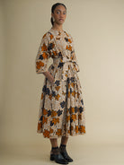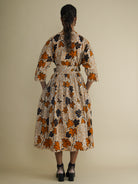 With three-quarter sleeves, a gathered skirt, and an adjustable belt, it’s versatile enough to wear on its own in warmer months or layered with a shirt or bodysuit when the weather turns colder. Deep side pockets add practicality to the bold print and flowing shape.