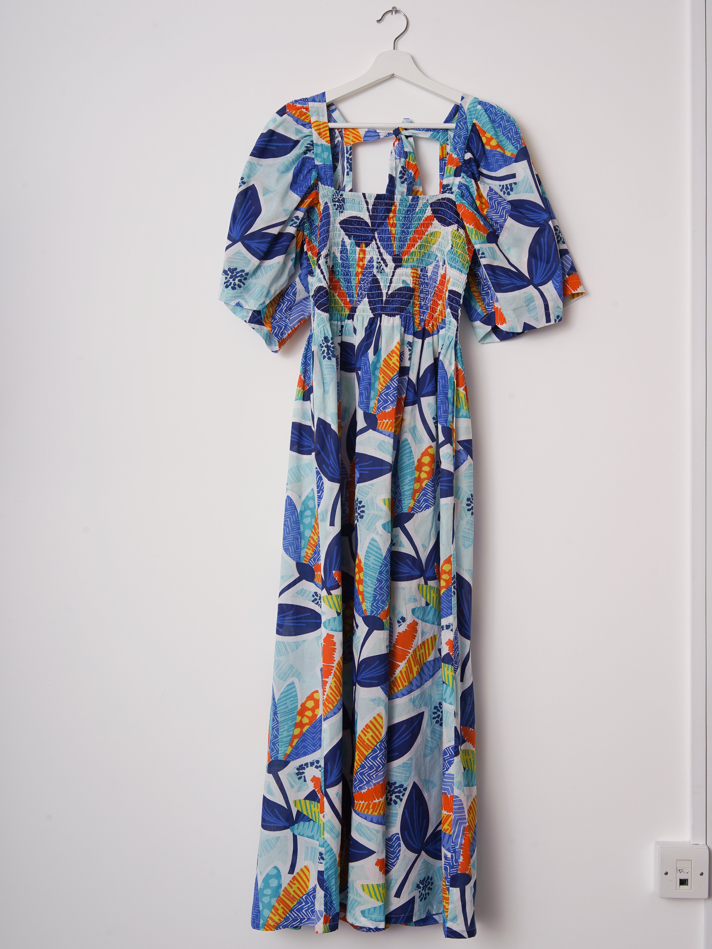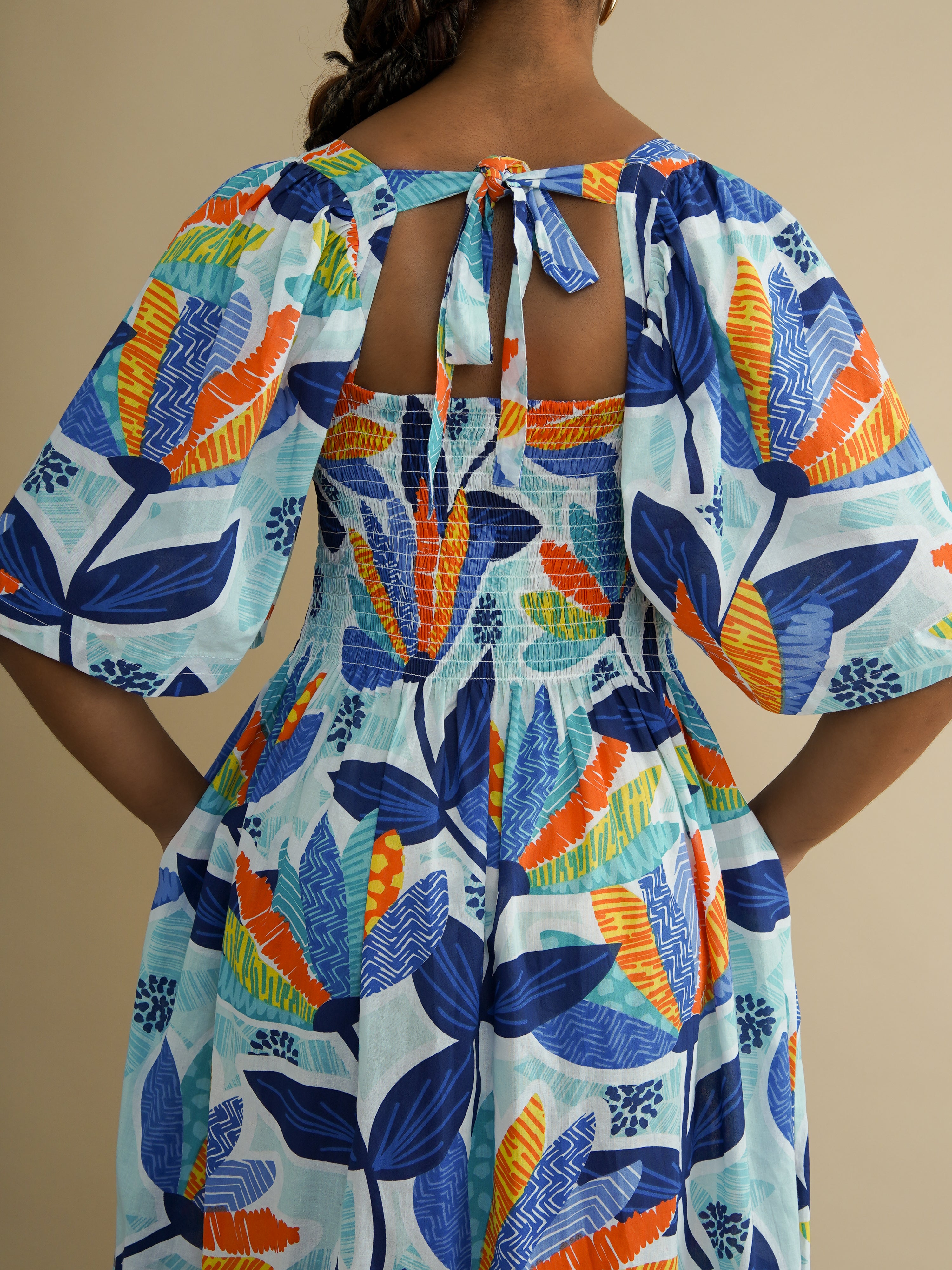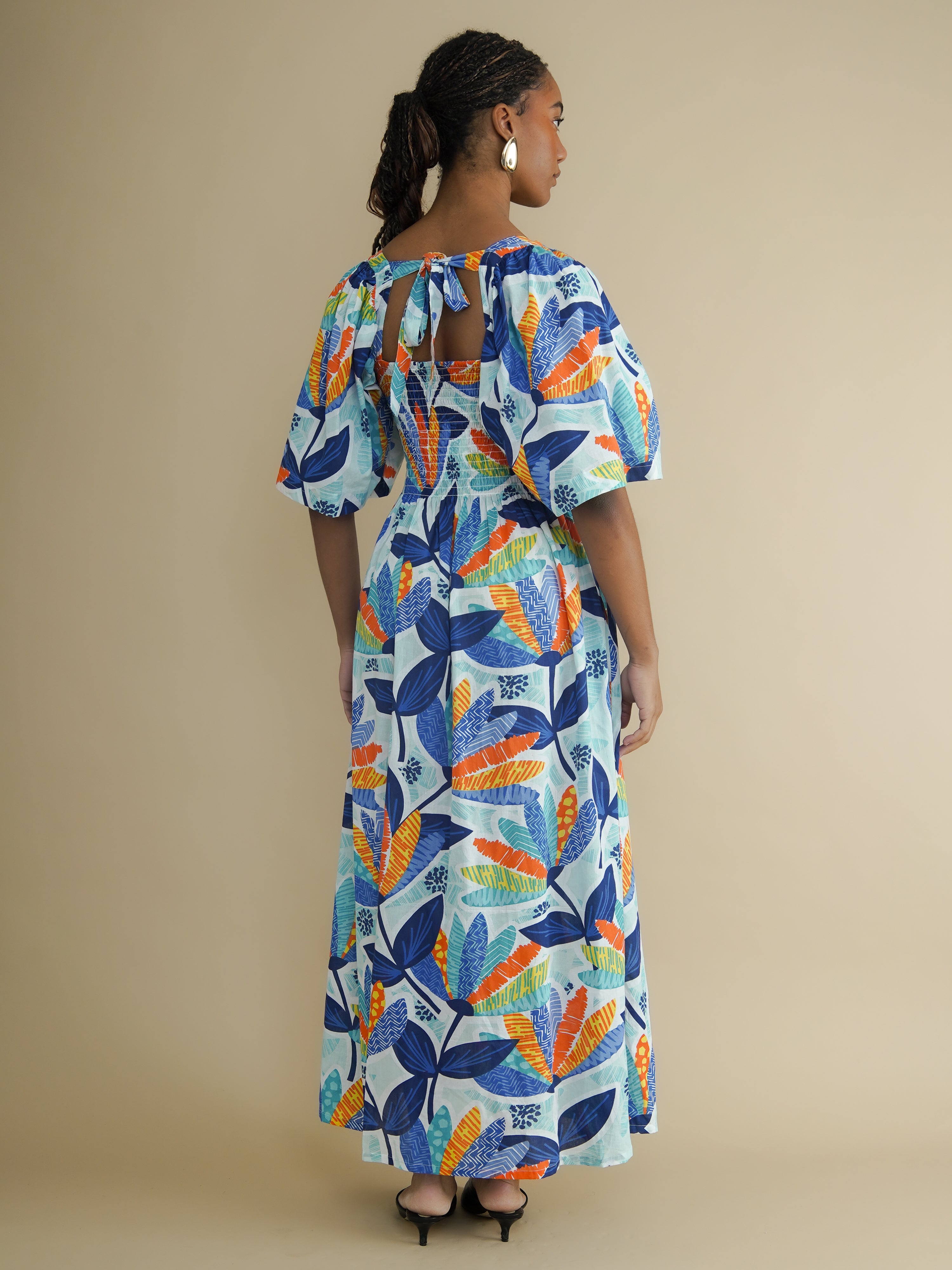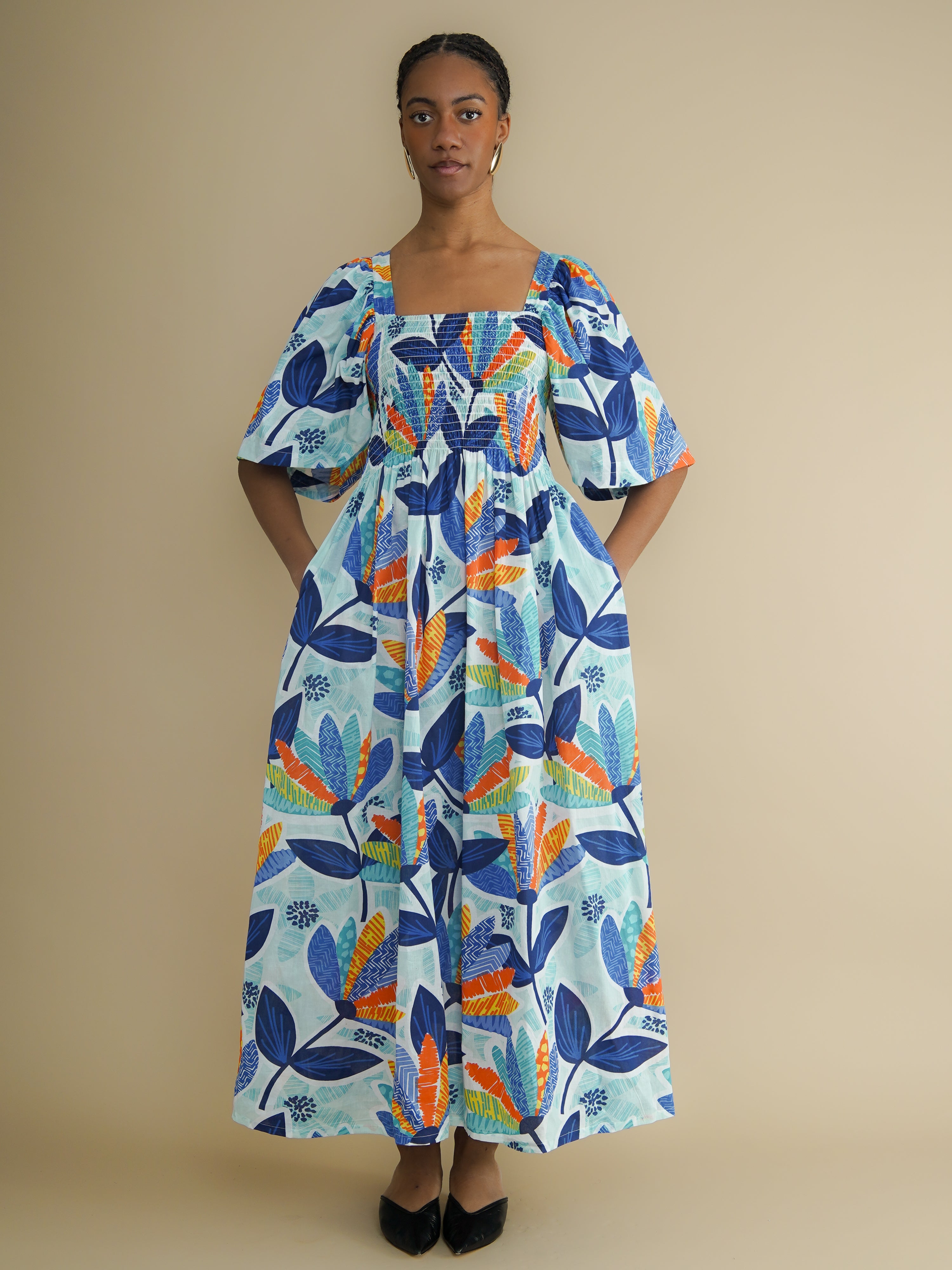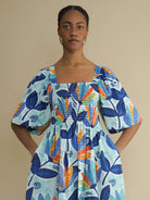 An airy cotton dress in a bright leaf print. The Nicole Dress in Sky Leaf features a smocked bodice for shape and comfort, wide elbow-length sleeves, and a softly gathered skirt. Made from 100% cotton that feels light and breathable. Slightly sheer in sunlight. Perfect for summer, or layering in winter.
