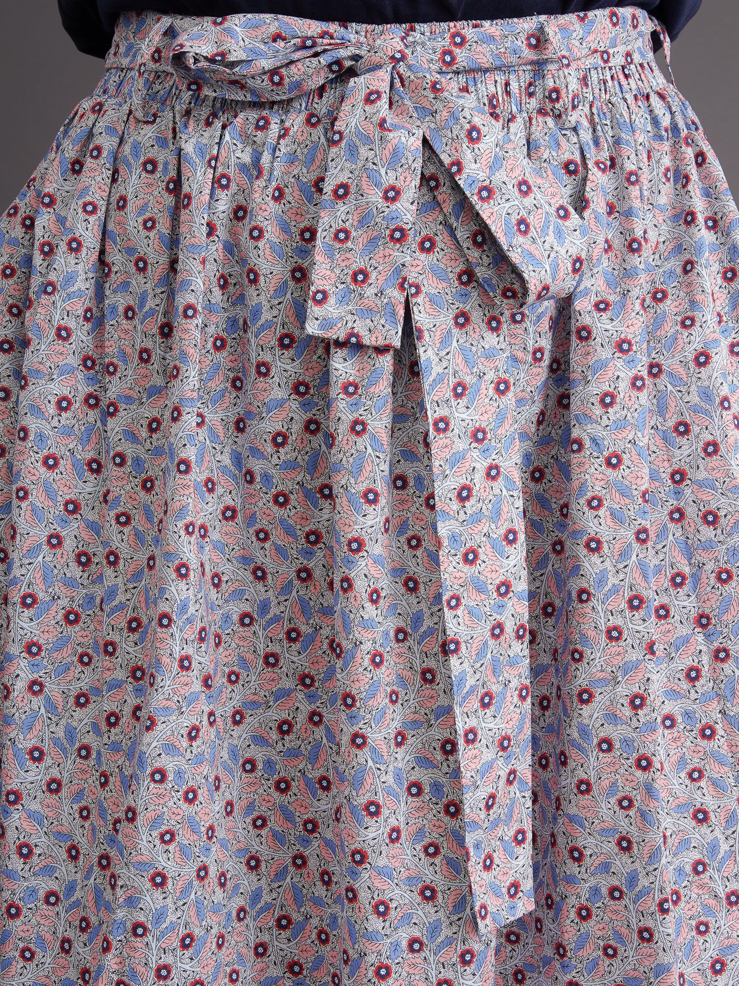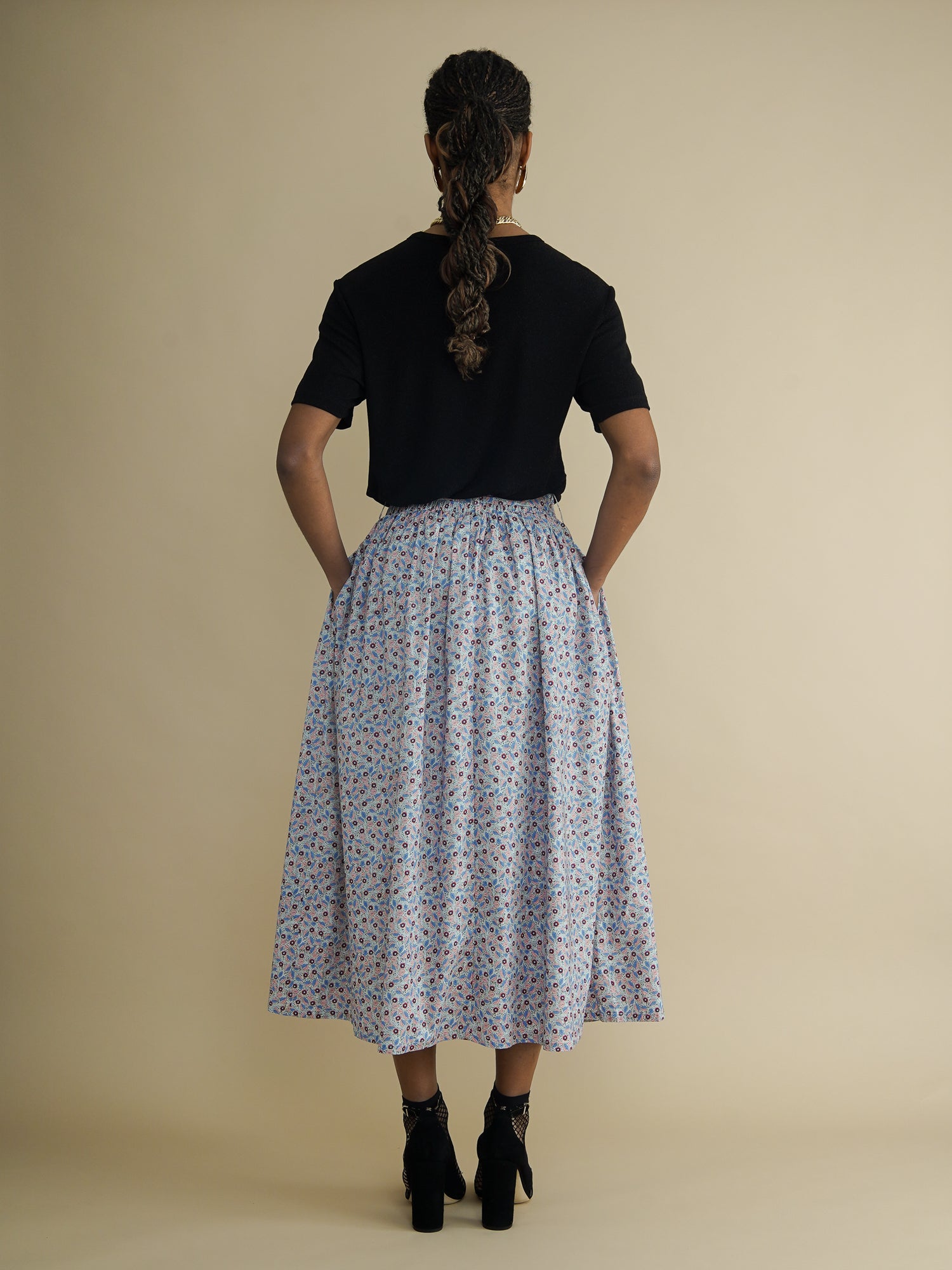 The Penelope Midi Skirt is made from a floral printed cotton poplin and shaped with a full, gathered silhouette. The elasticated band sits comfortably on the body and comes with a matching belt and includes side pockets.