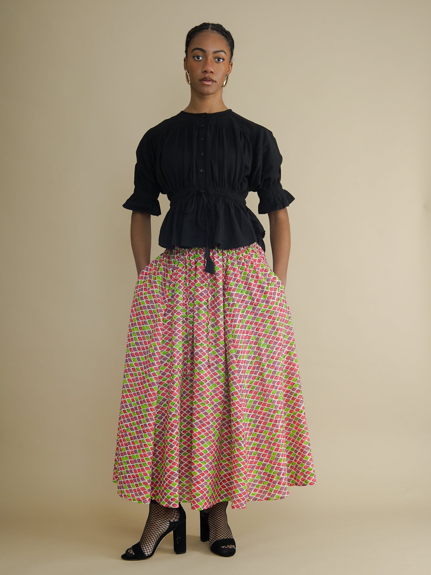 The Sade Cotton Bold Midi 8 Panel Maxi Skirt is all about movement, ease, and impact. Cut from lightweight 100% cotton, this skirt swishes beautifully as you walk, thanks to its generous 8-panel construction that creates volume without heaviness.