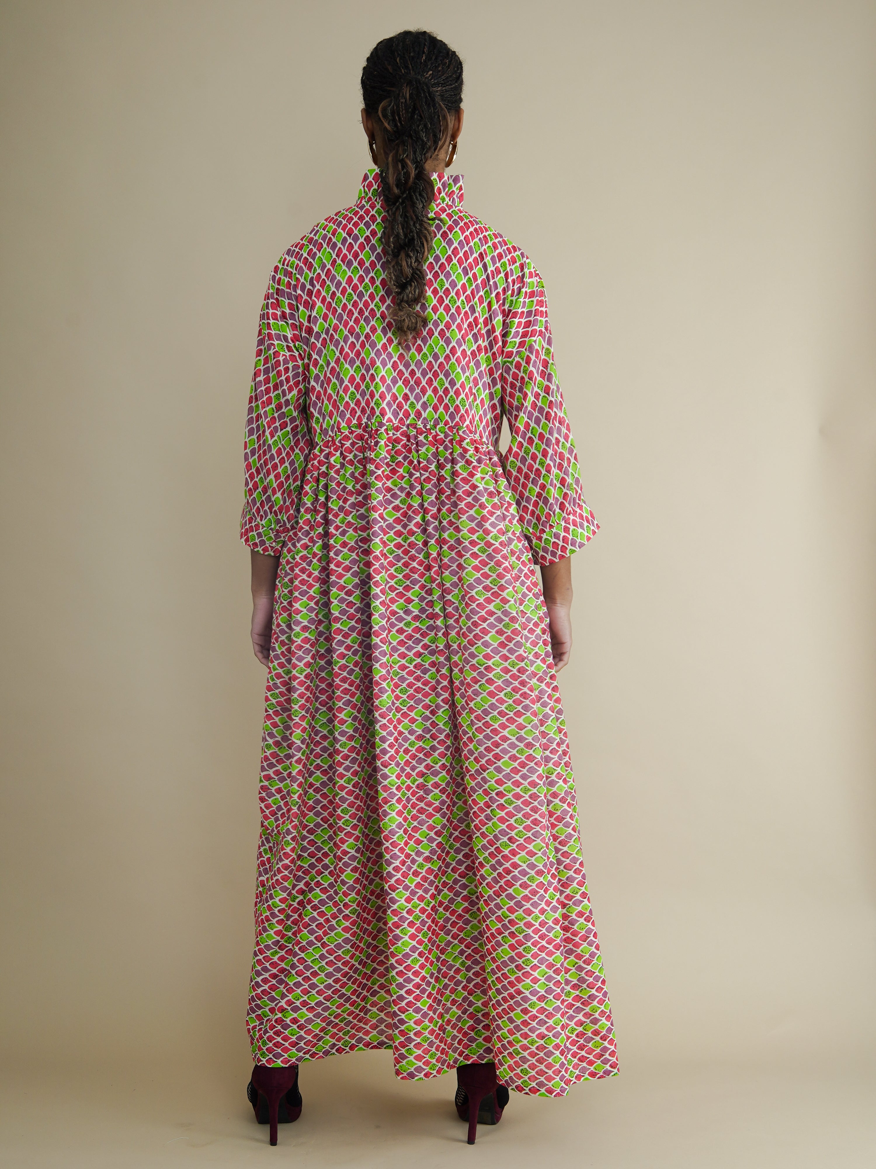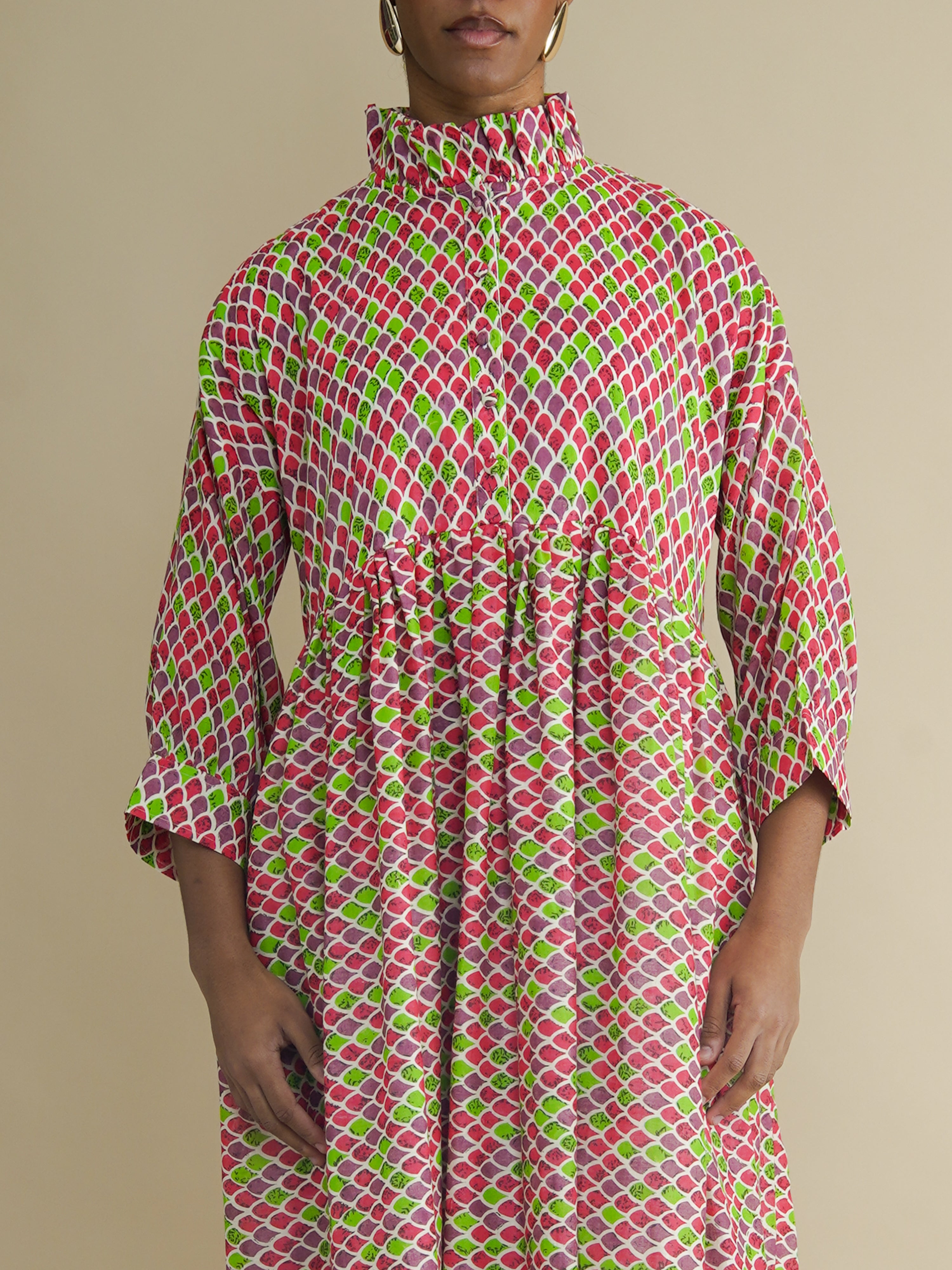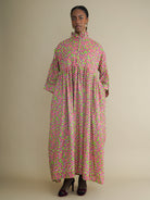 Cut from 100% lightweight deadstock cotton, the dress has a soft, airy feel and is fully lined for comfort and coverage. A vintage-style high frilled collar and voluminous sleeves bring presence and character, while the half-placket button front keeps the look understated and wearable.