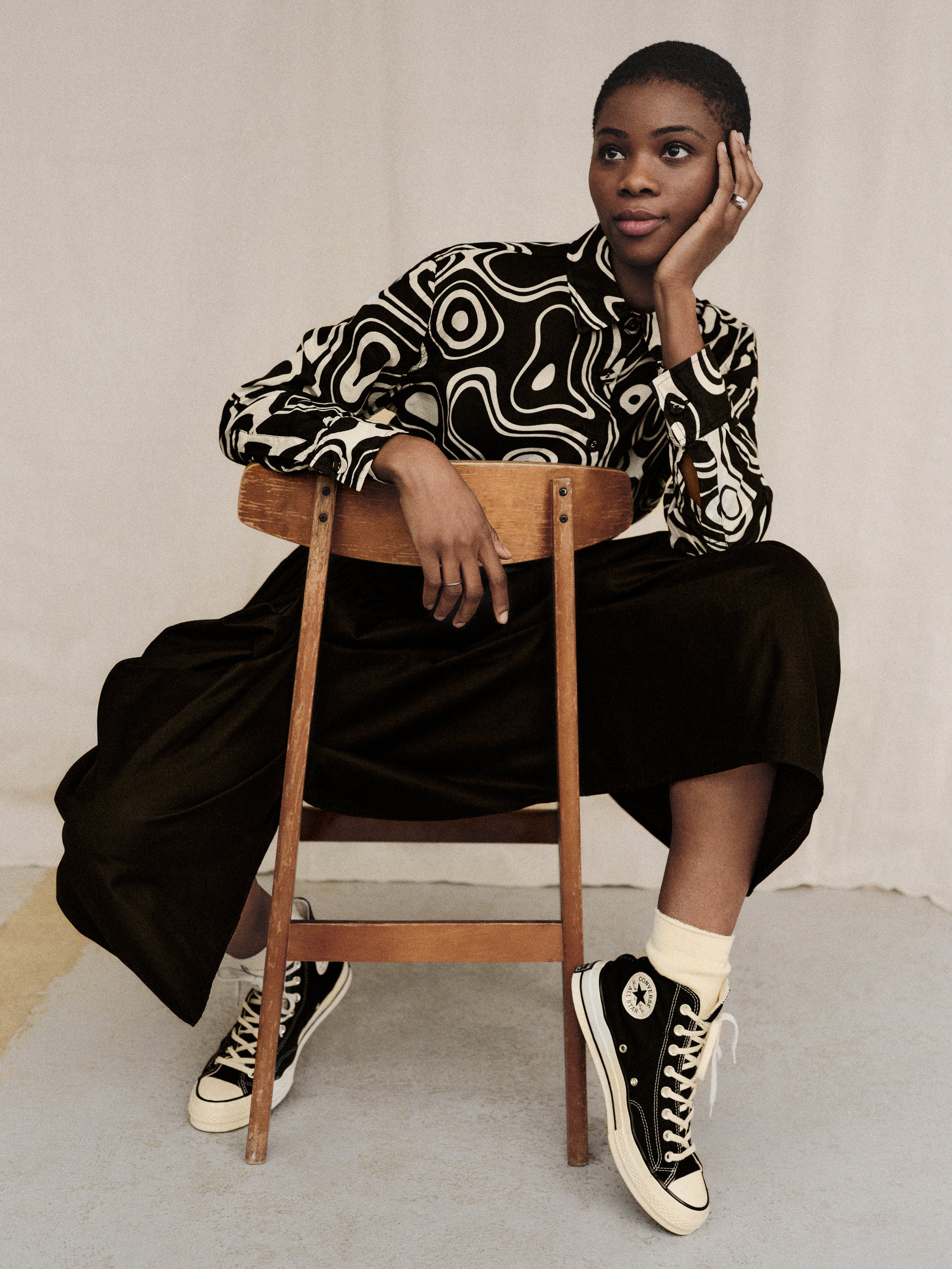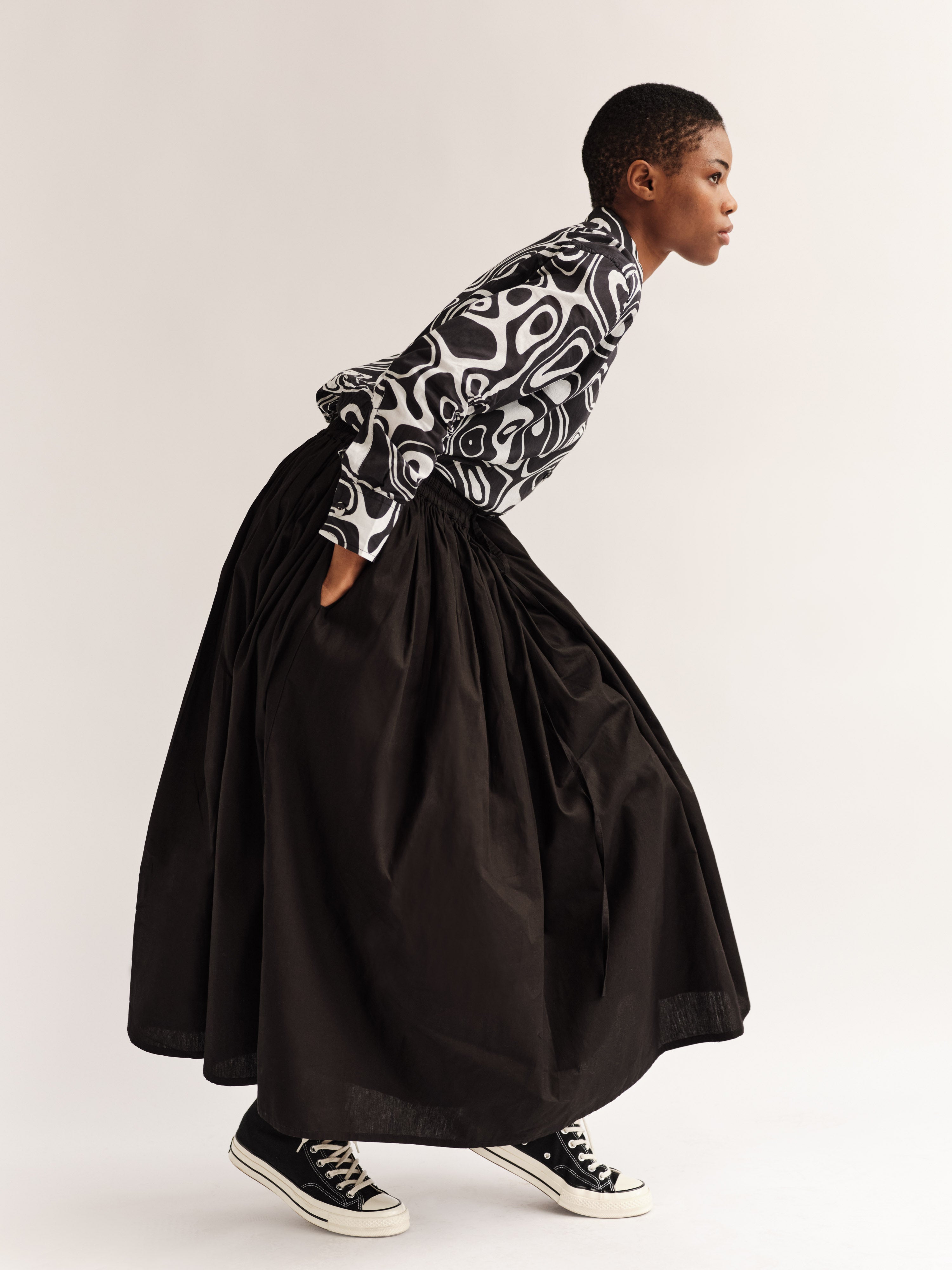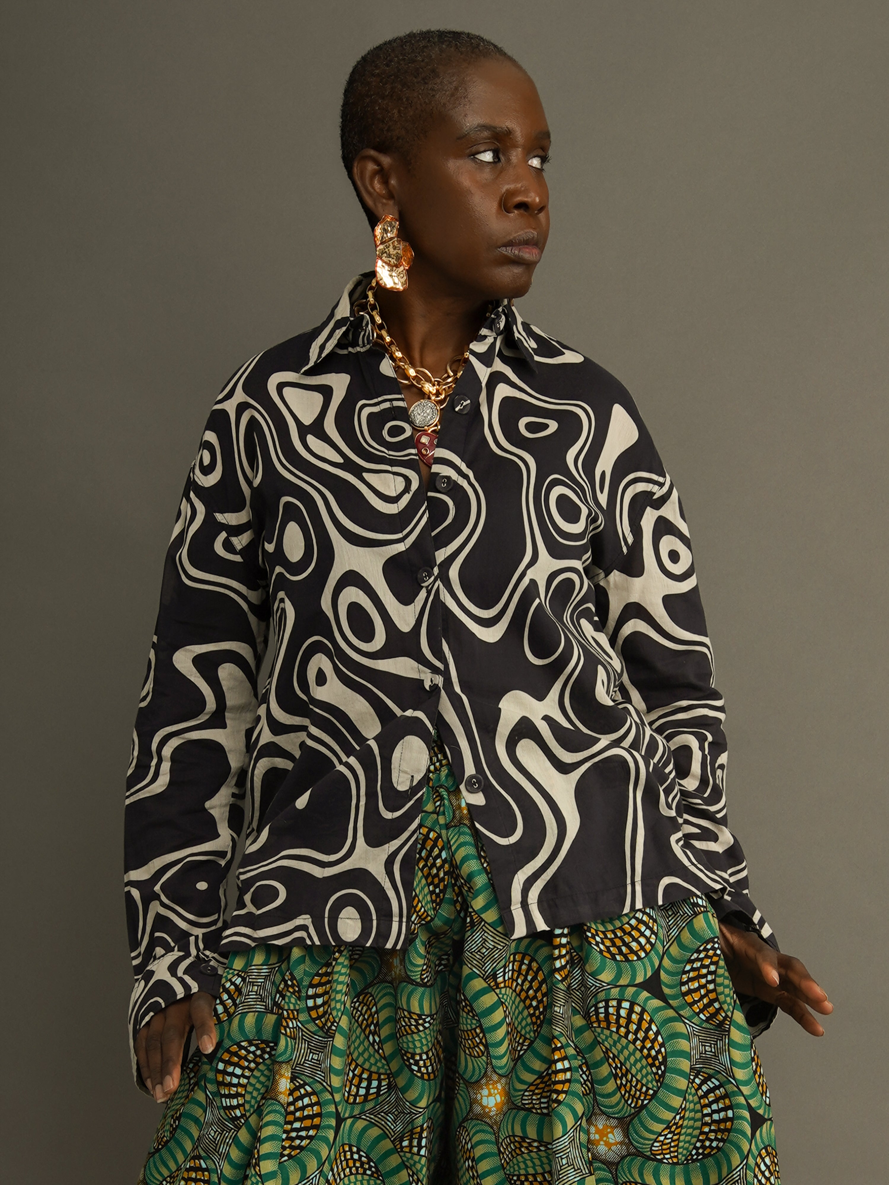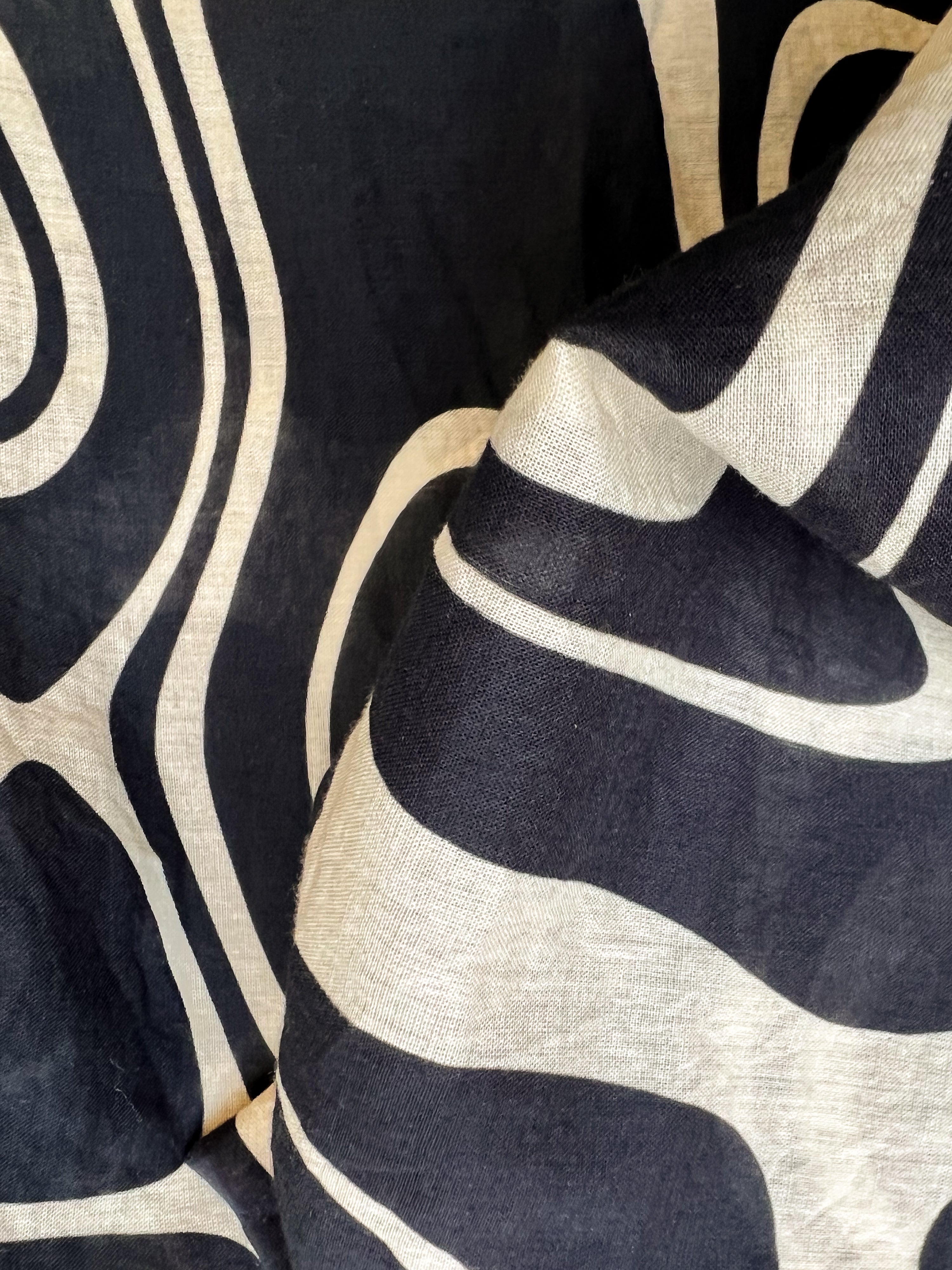 Our Stefanie Printed Button-Up Shirt is a versatile piece designed for layering or wearing on its own. Printed in a striking black-and-off-white pattern, the design takes inspiration from the bold graphics of the 1960s Op Art movement.