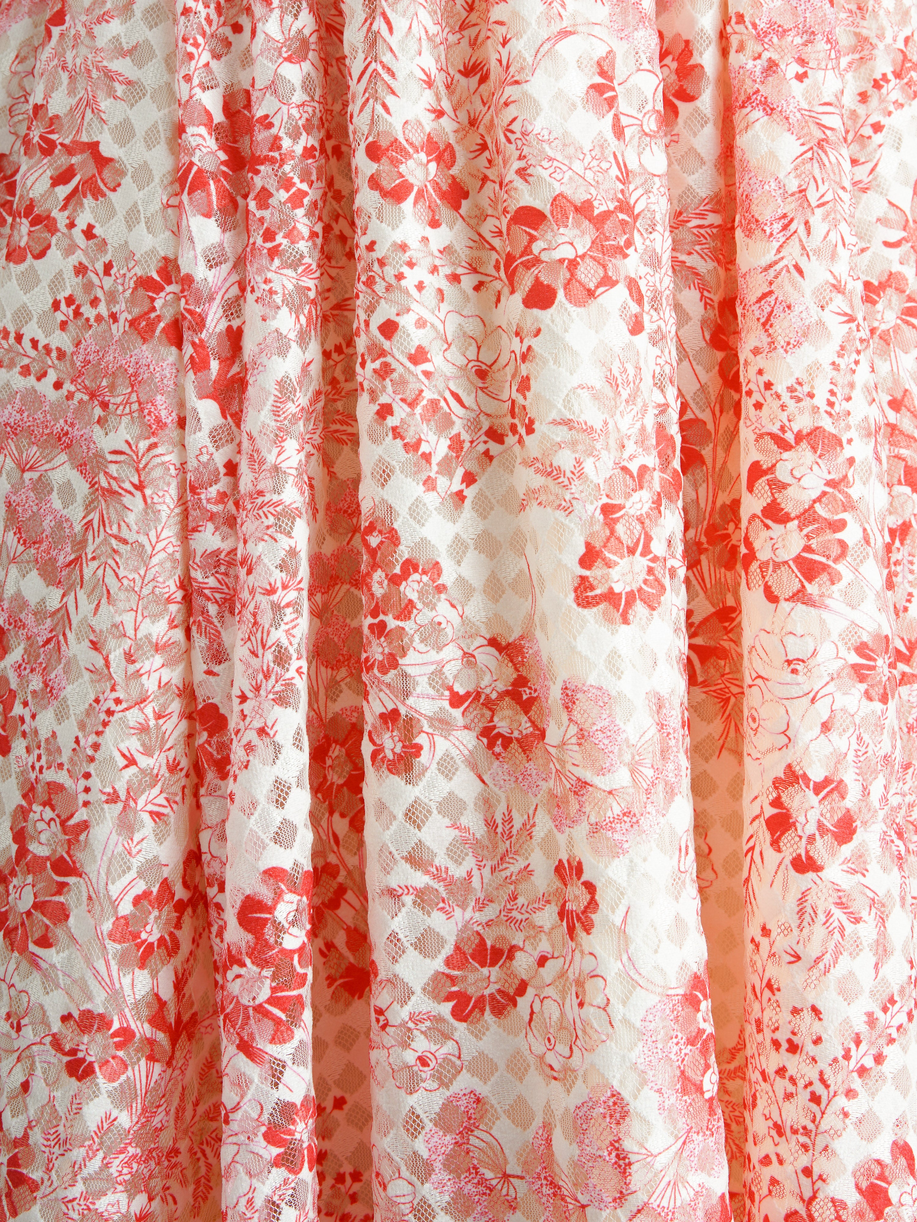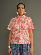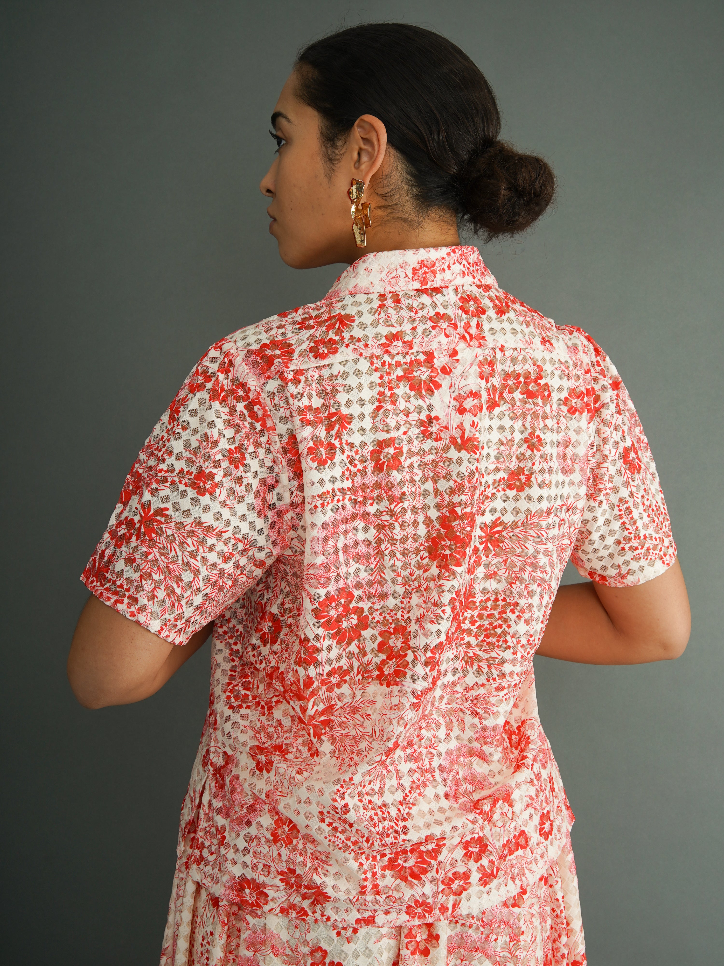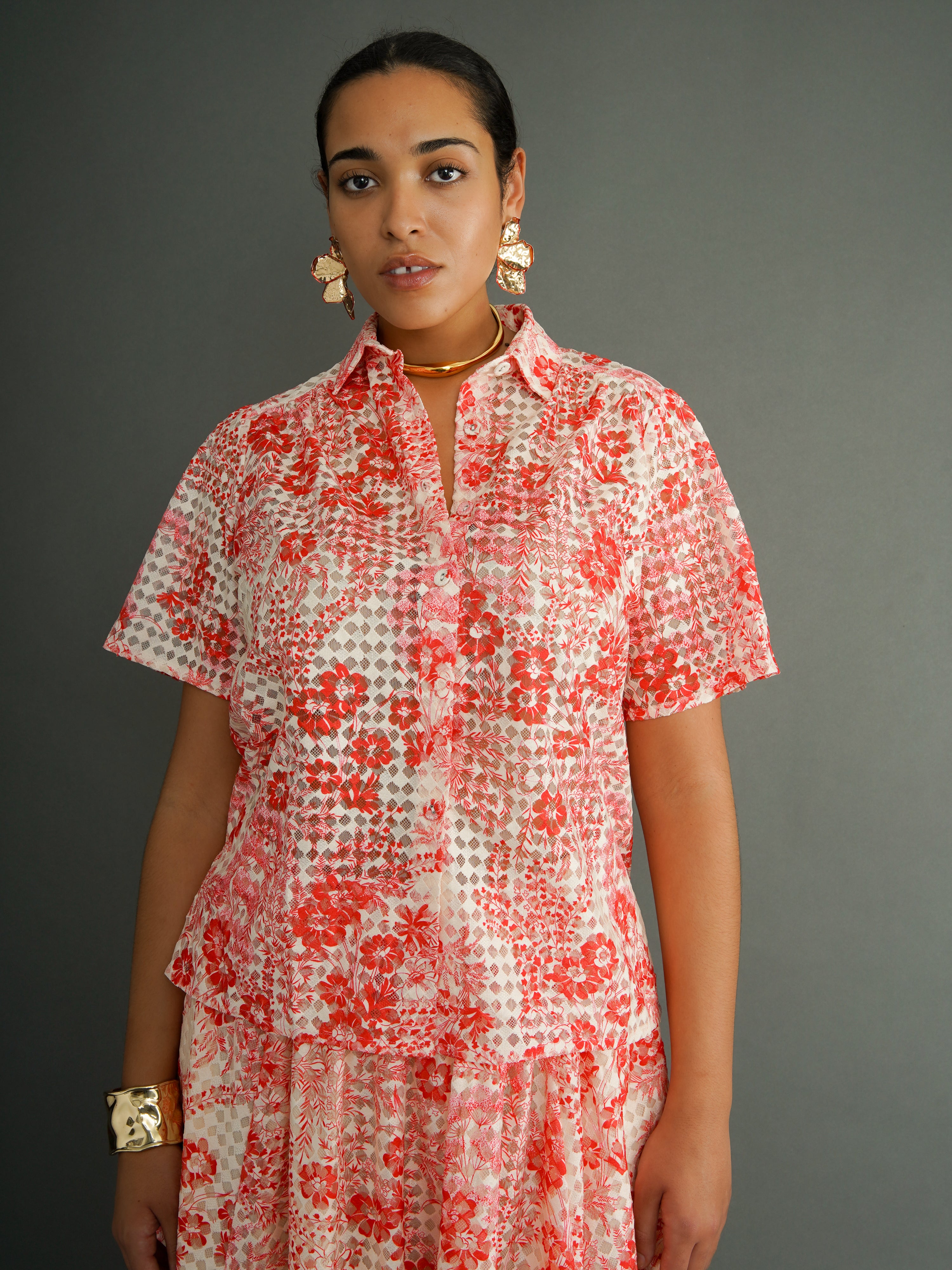 A vintage-inspired shape reimagined in floral lace. This short-sleeve shirt is cut from soft, red-and-pink lace. Light yet structured, it falls with ease and fastens through the front with small, covered buttons. Finished with a pointed collar and curved hem.