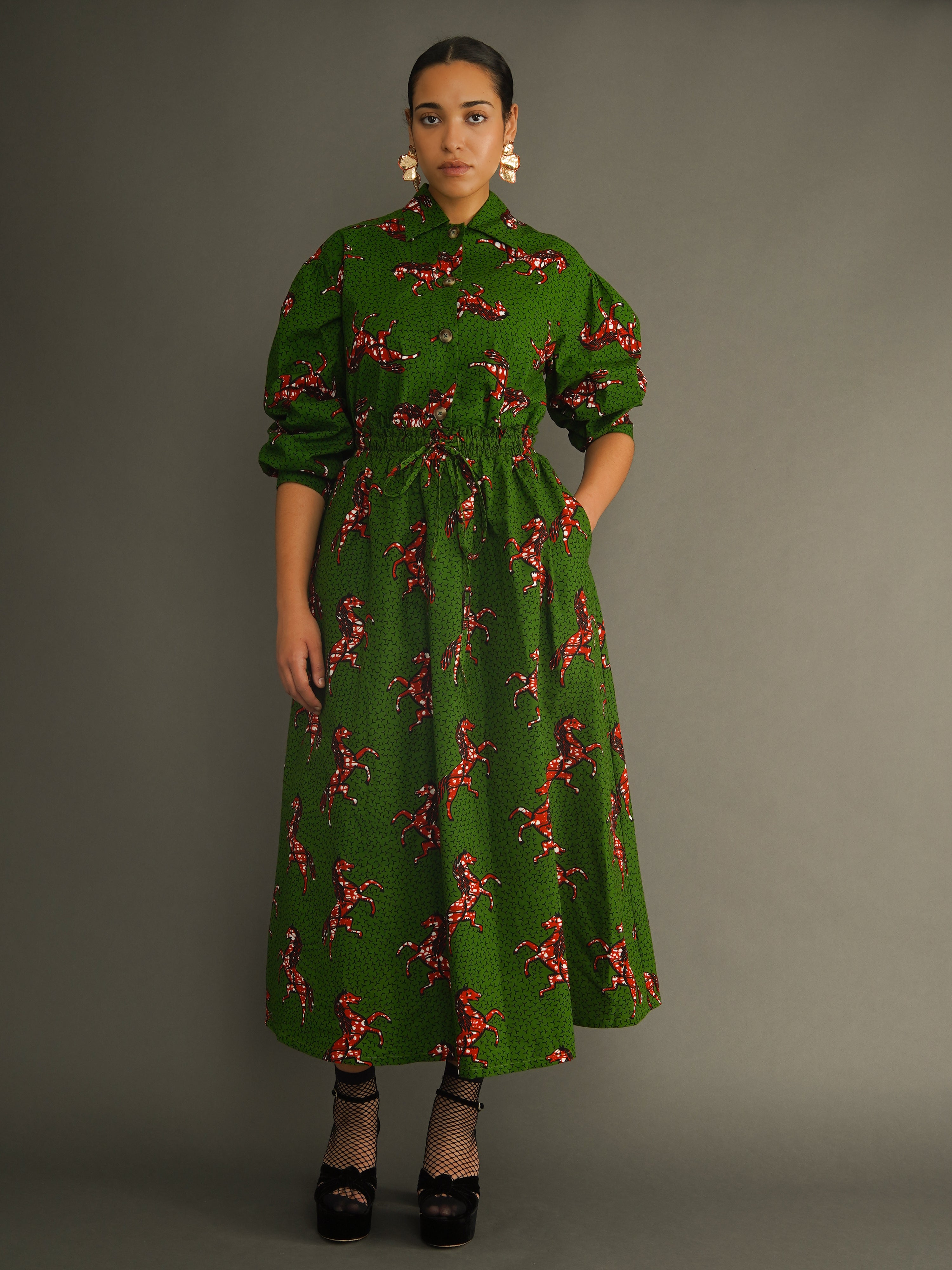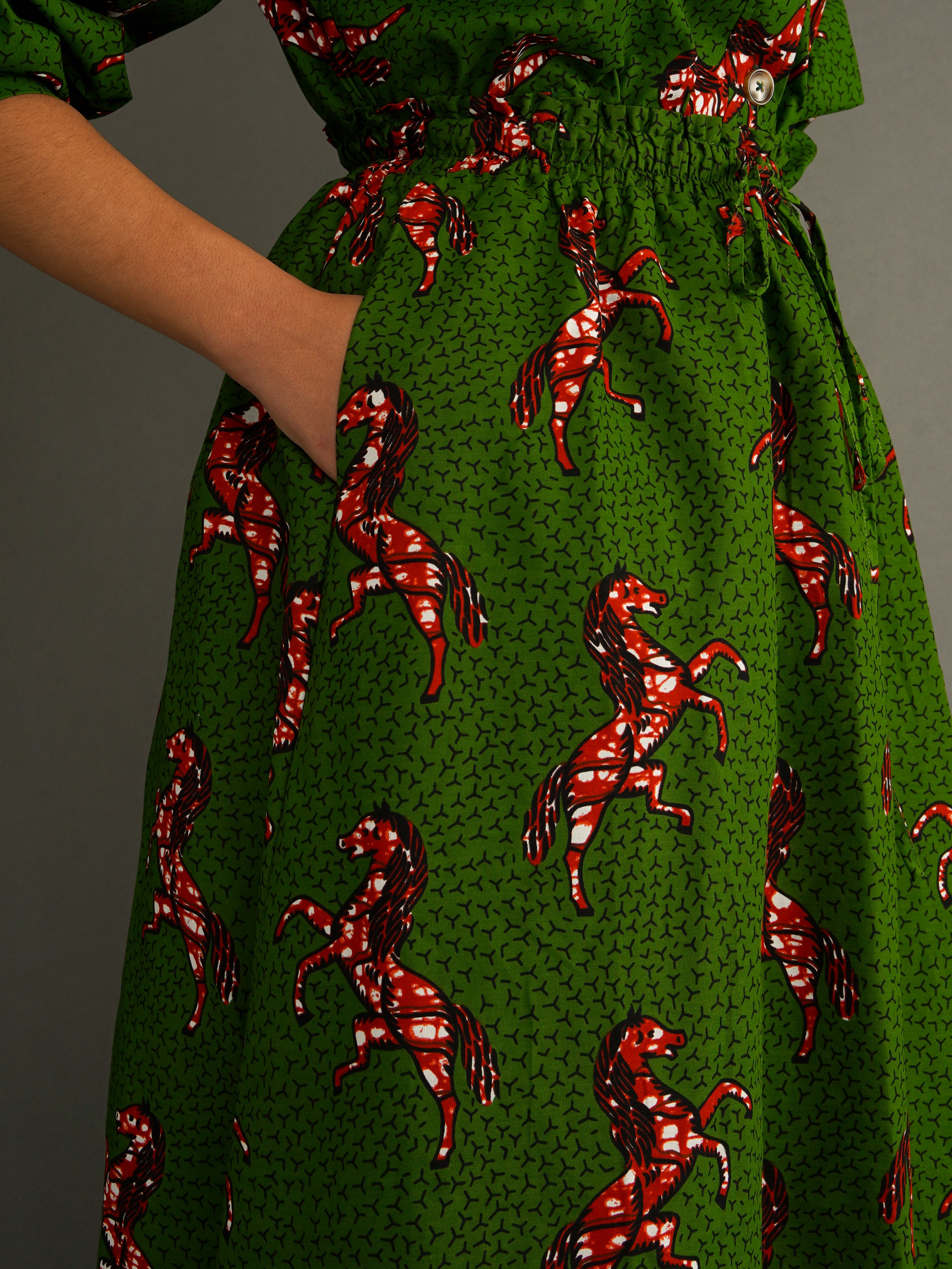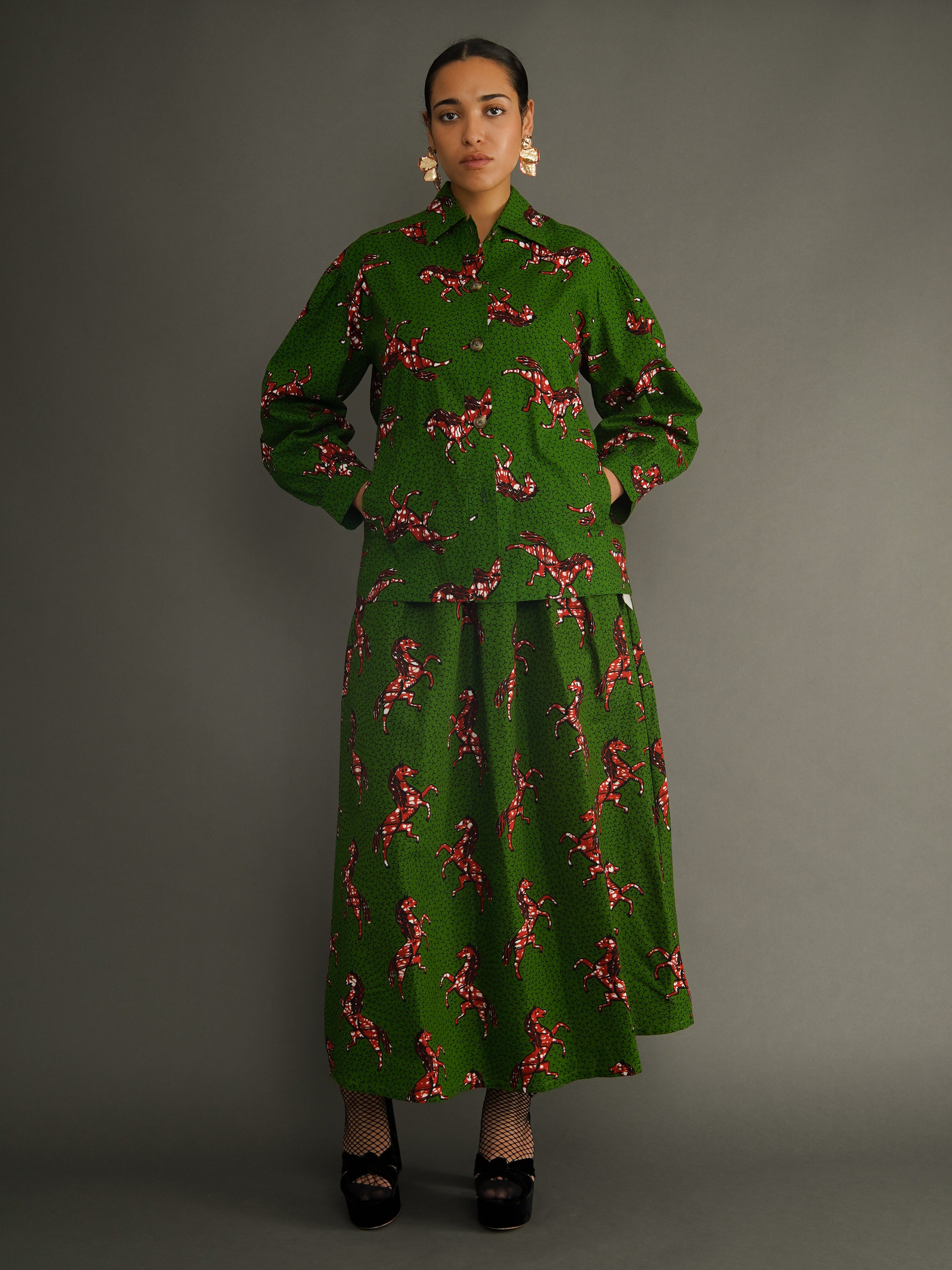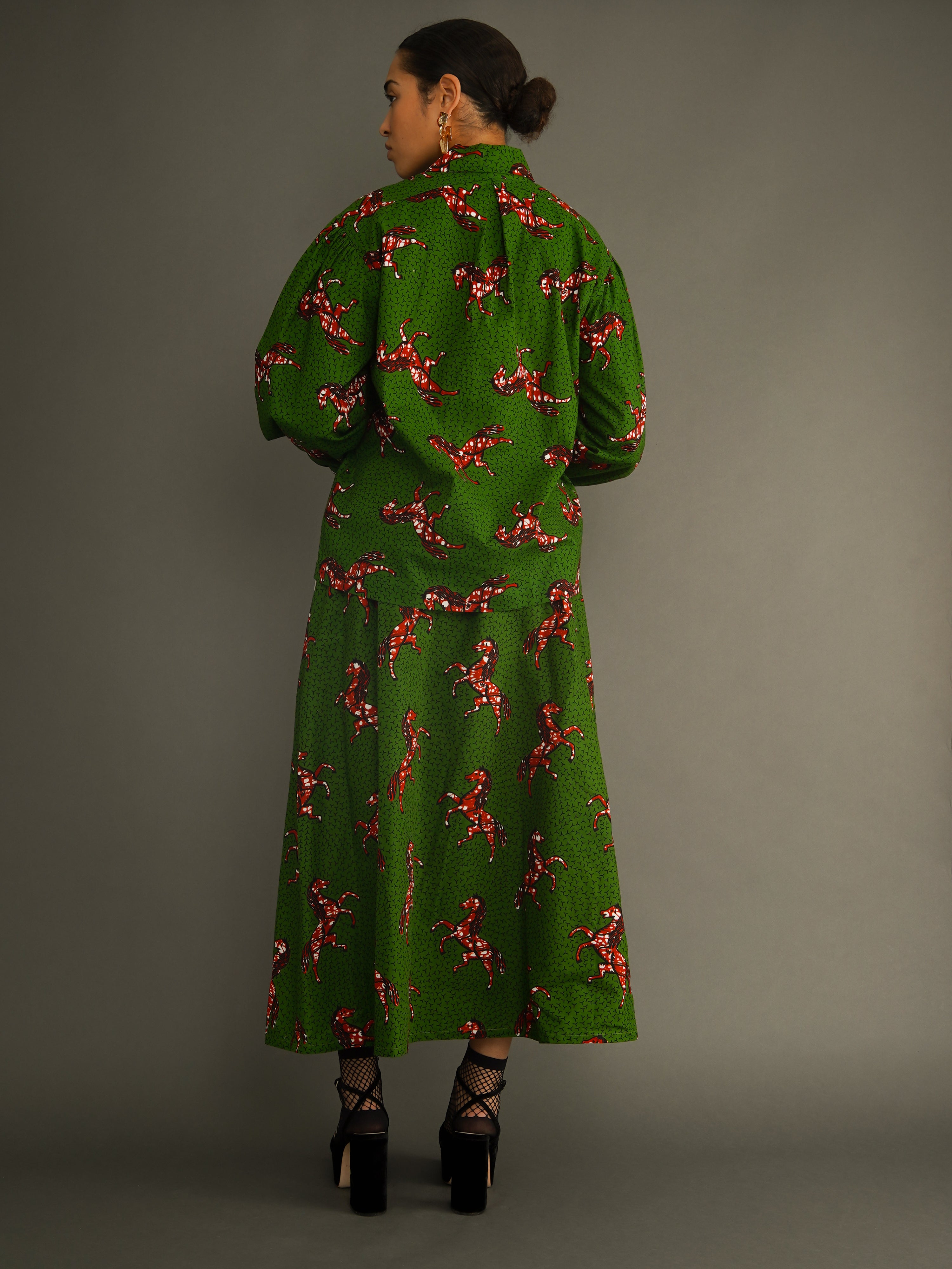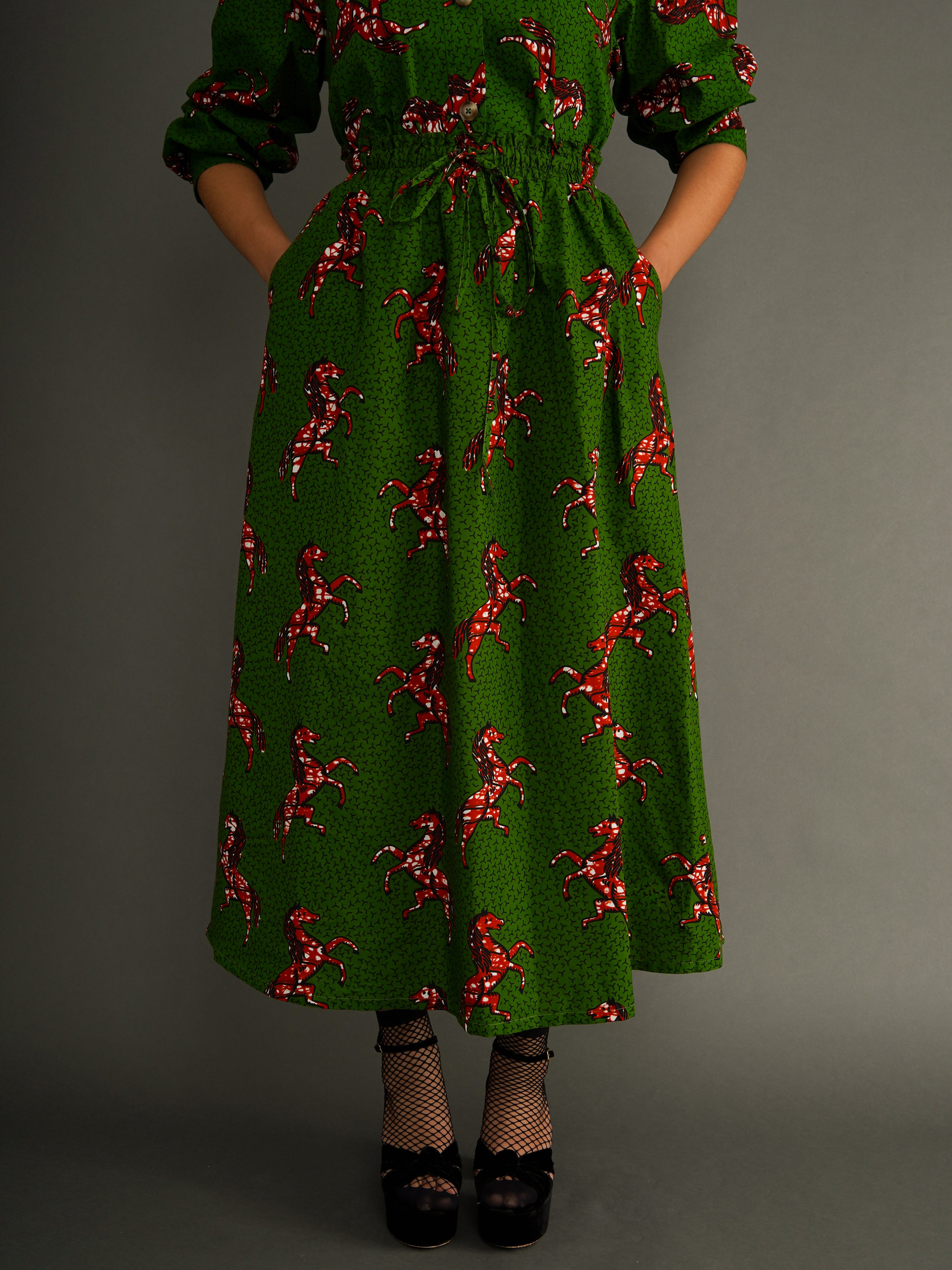 Galloping Horse Maxi Skirt in Green Dutch Wax