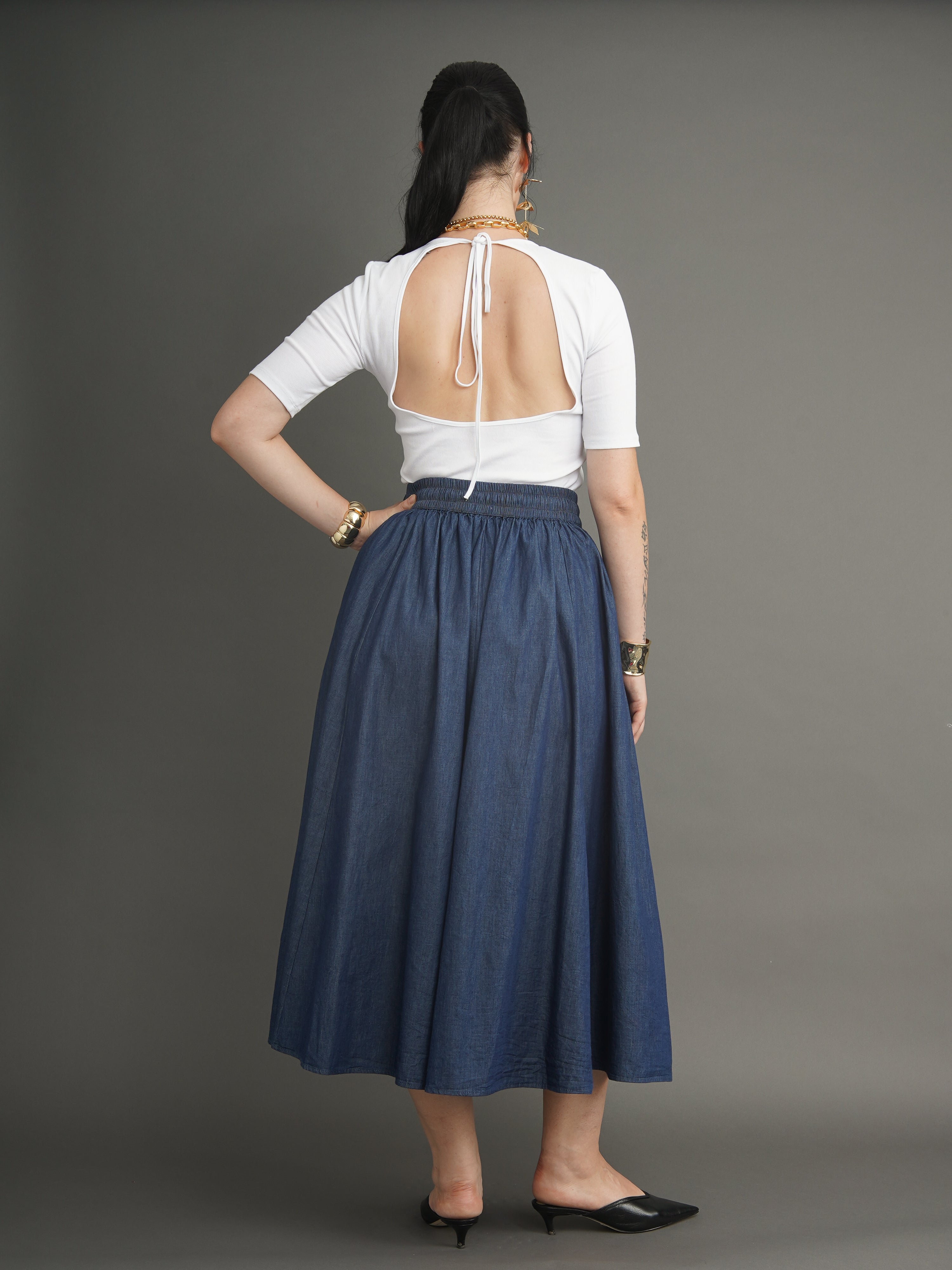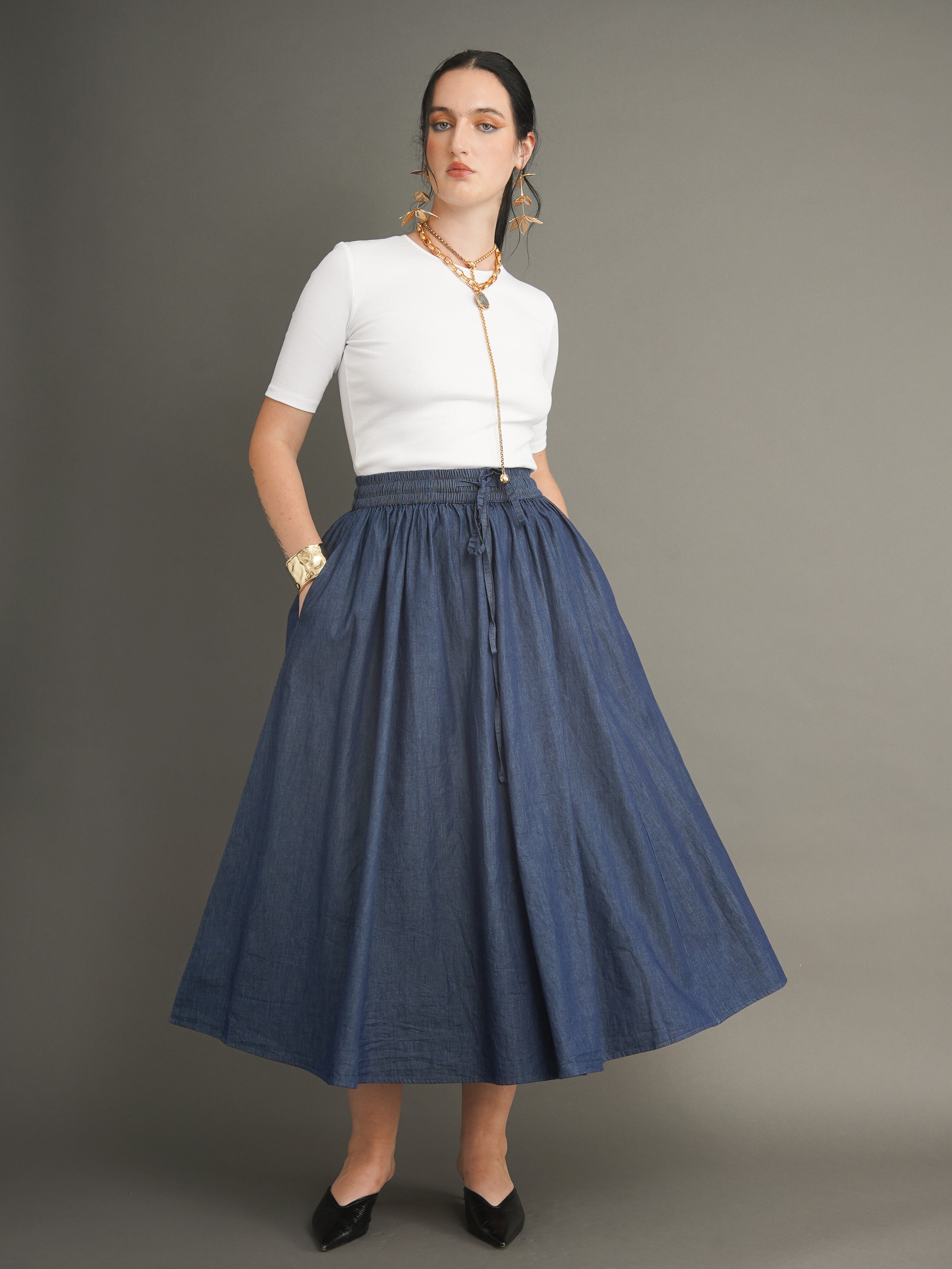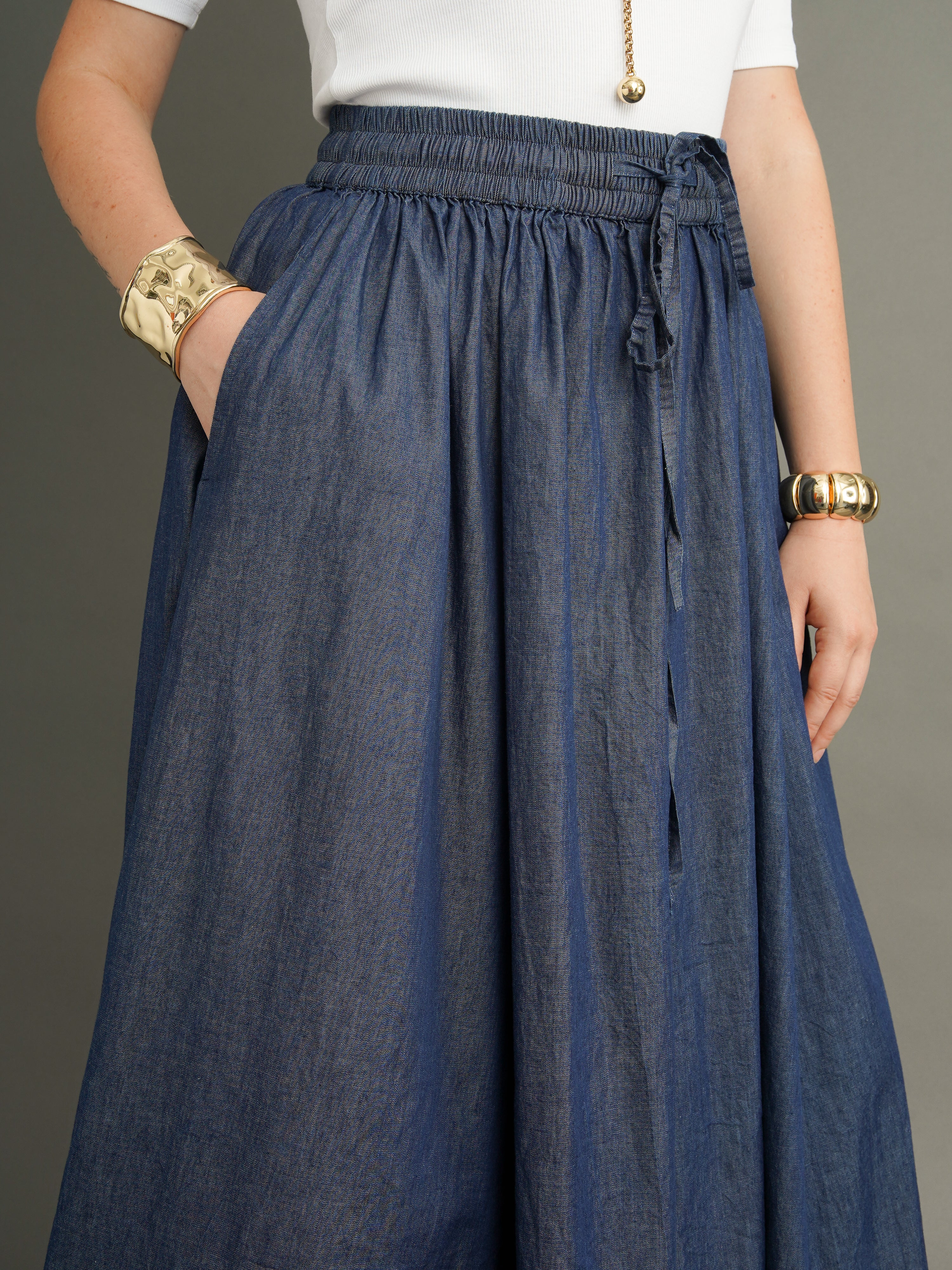 Our Denim Midi Skirt with Pockets is designed to fit and flatter. With a full, flowing silhouette and a soft, elasticated waistband with an adjustable drawstring, this skirt is made for comfort, confidence, and compliments.