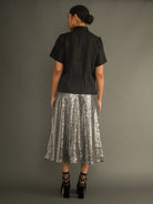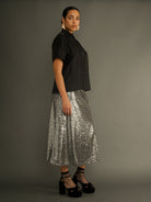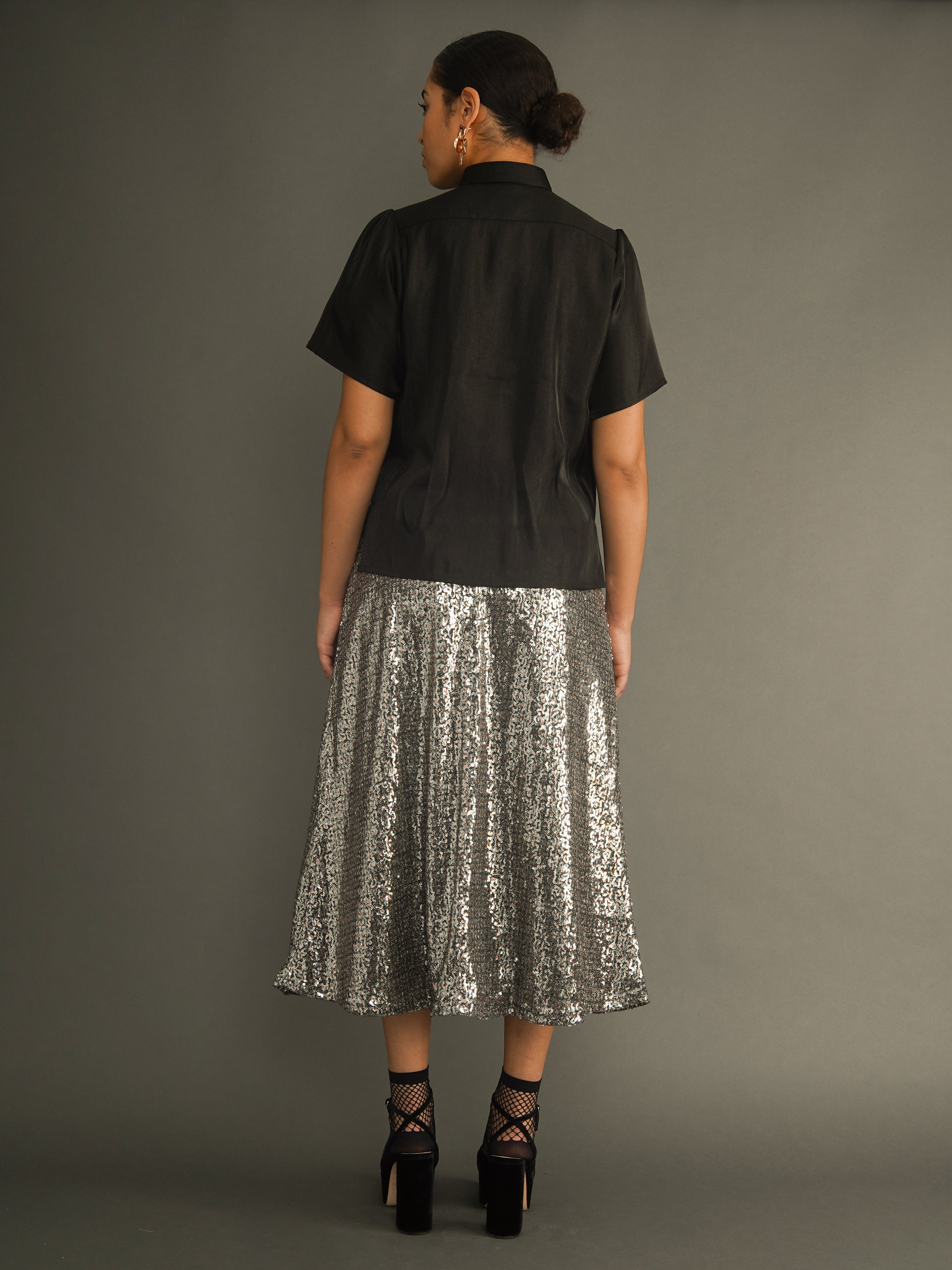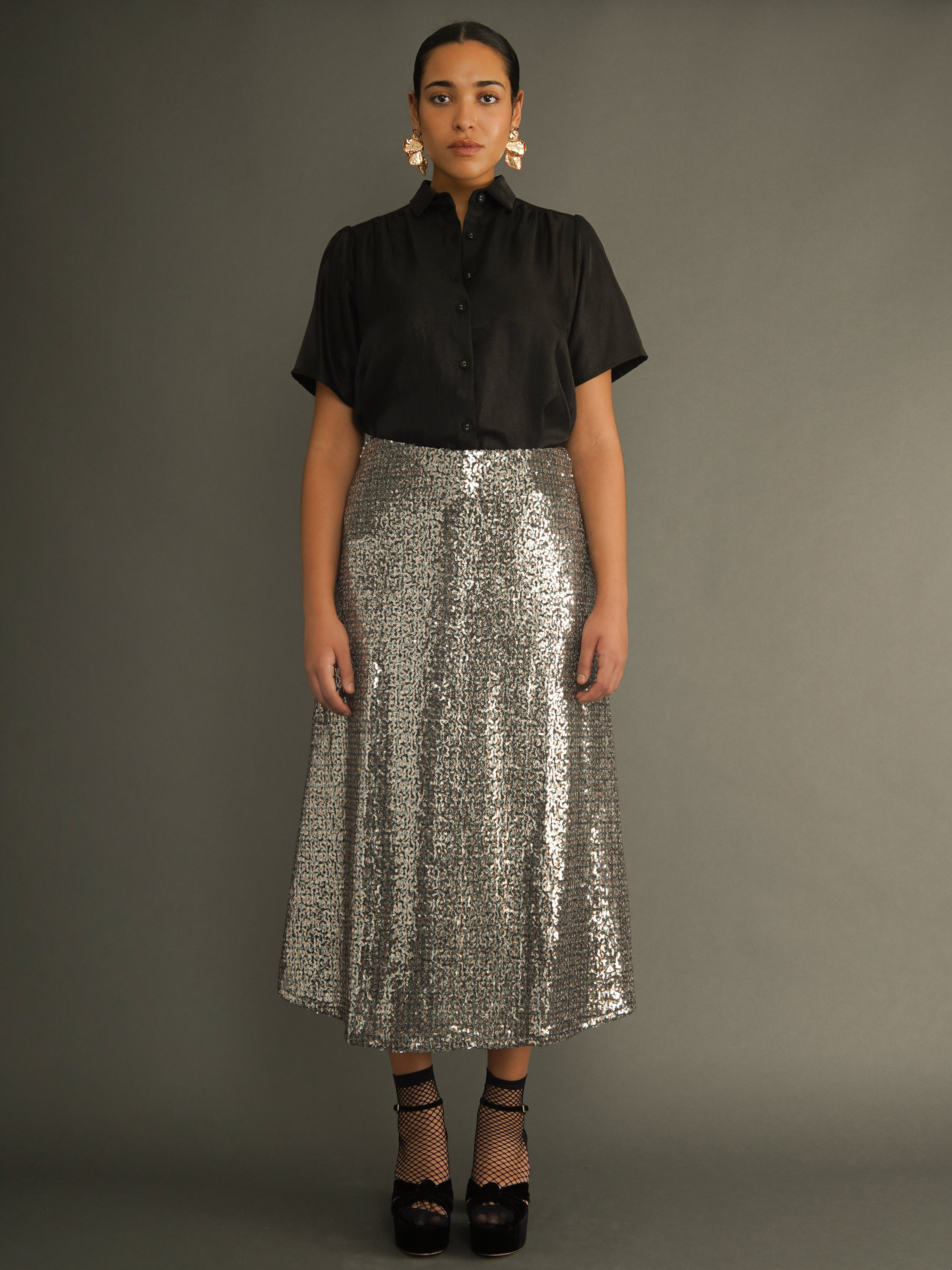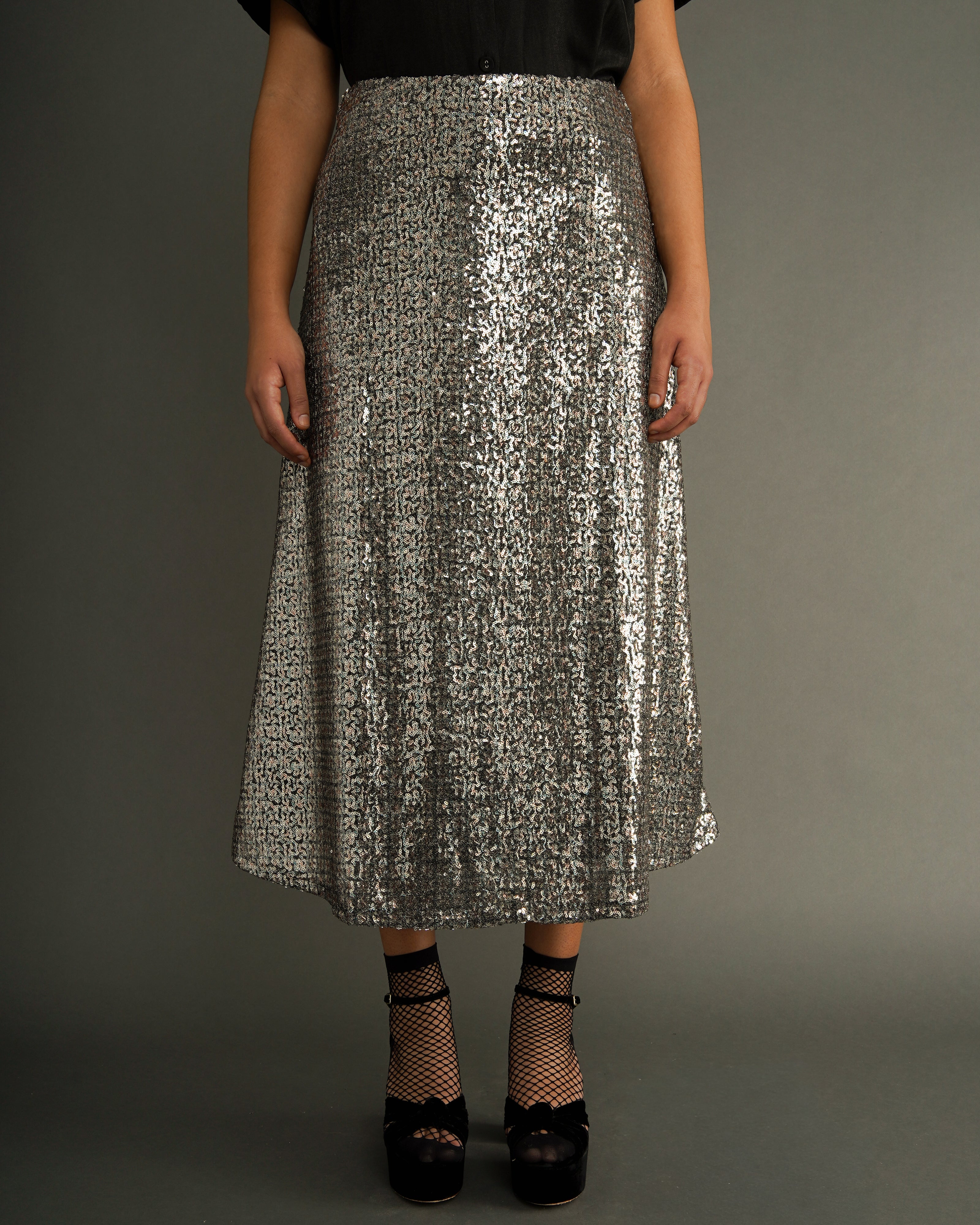 Cut to sit on the natural waist, it falls into a soft, flared silhouette that moves beautifully with you. The all-over sequin finish gives a cool, refined shimmer rather than a bright, high-gloss shine.