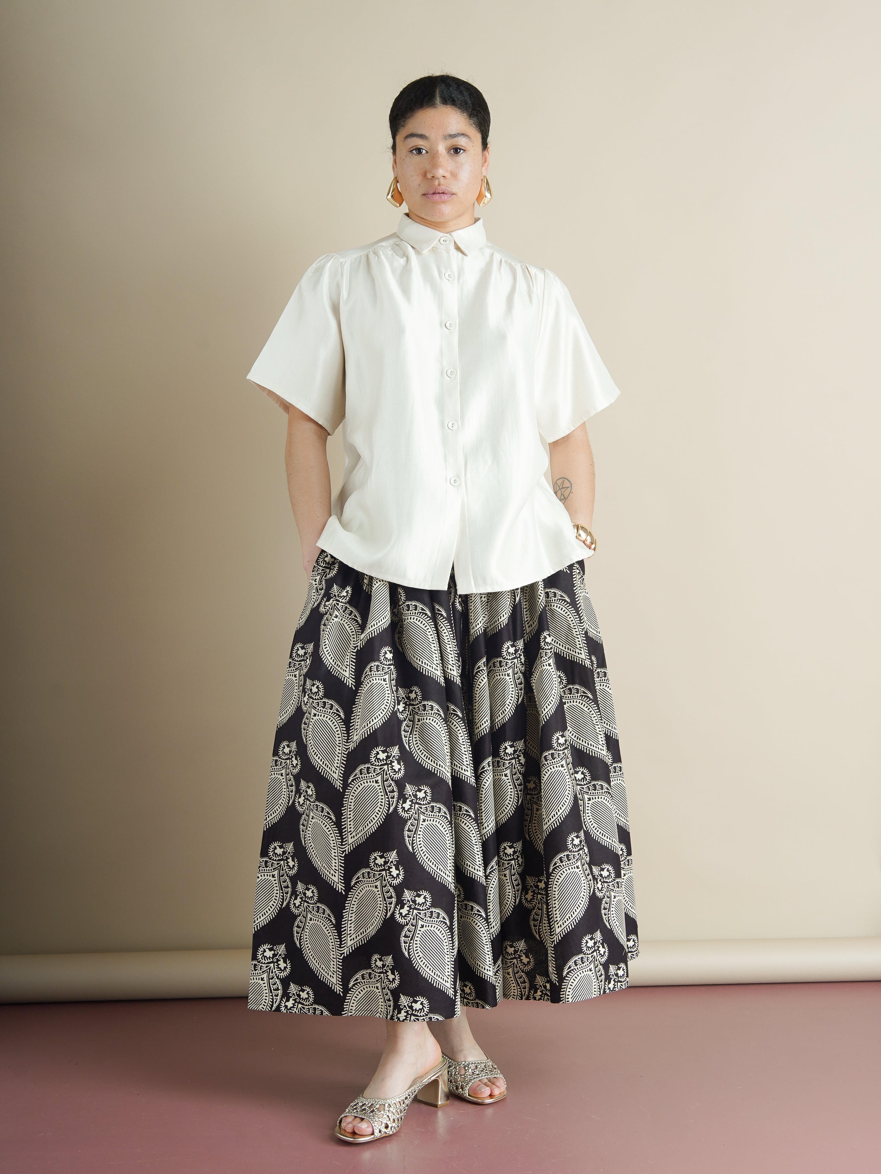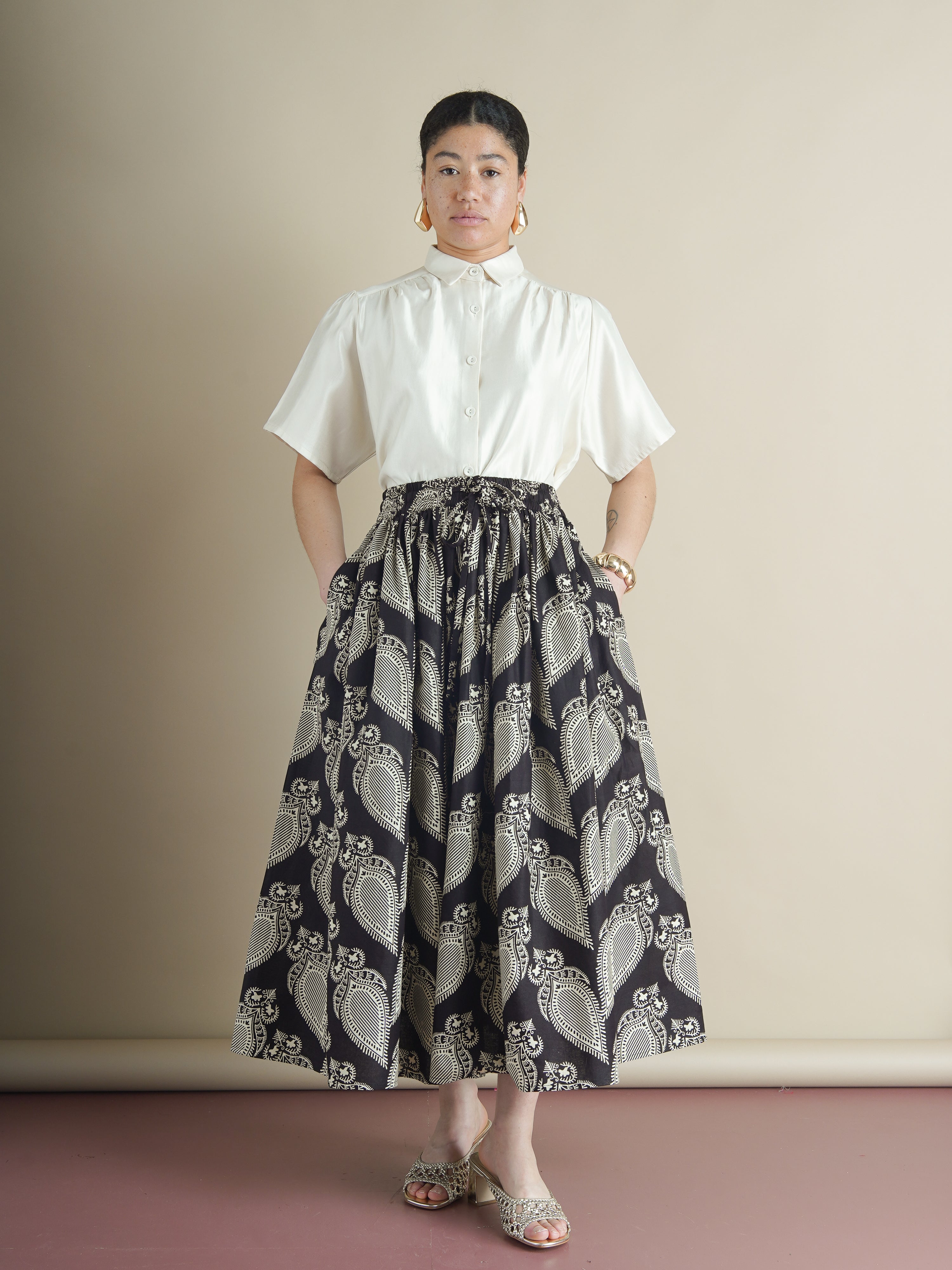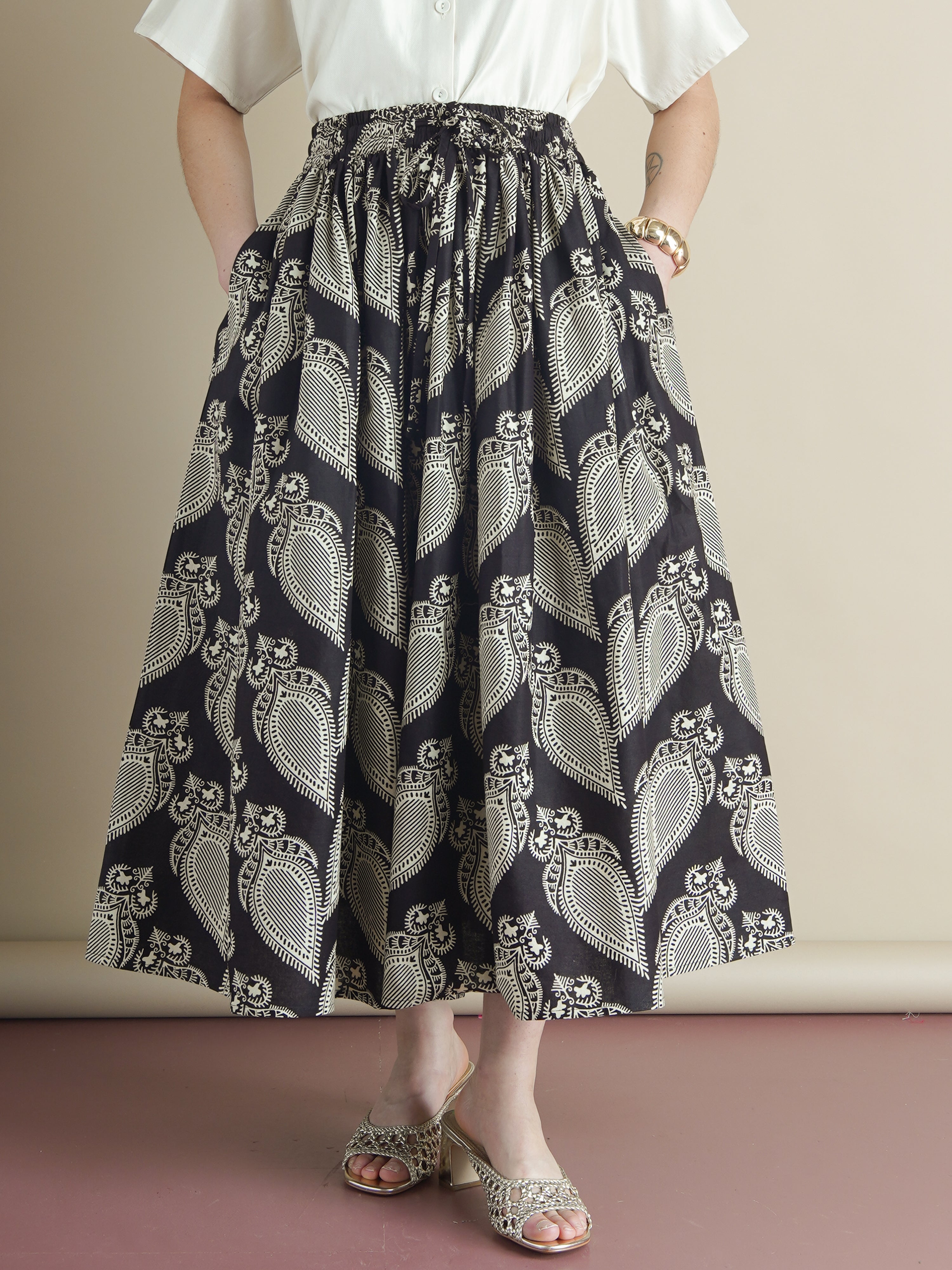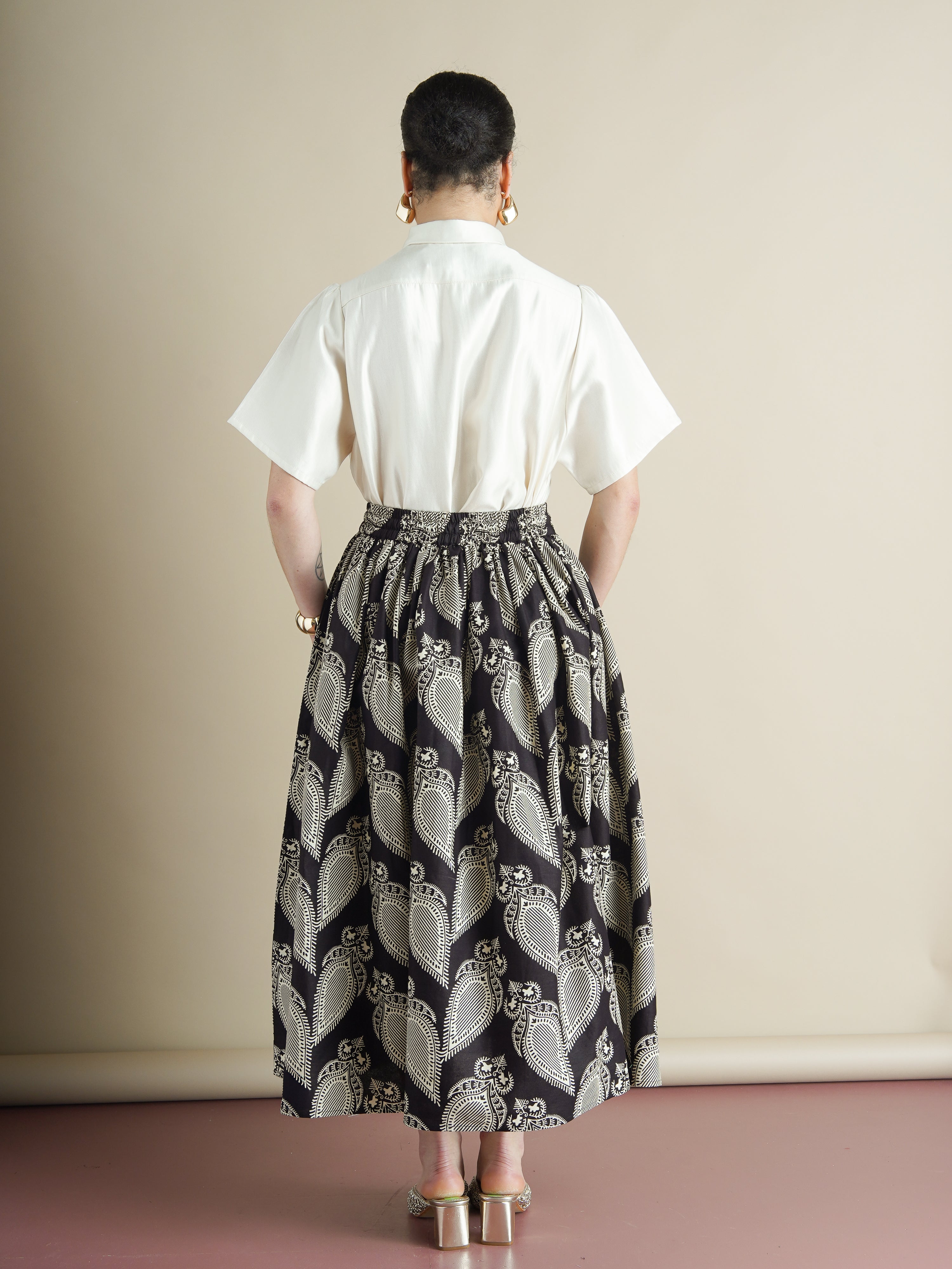 Our Mariam Leaf Gathered Skirt is a standout piece designed to make you feel seen. Crafted from structured, midweight 100% Dutch wax cotton, it features an eye-catching monochrome leaf motif that moves beautifully with every step.
