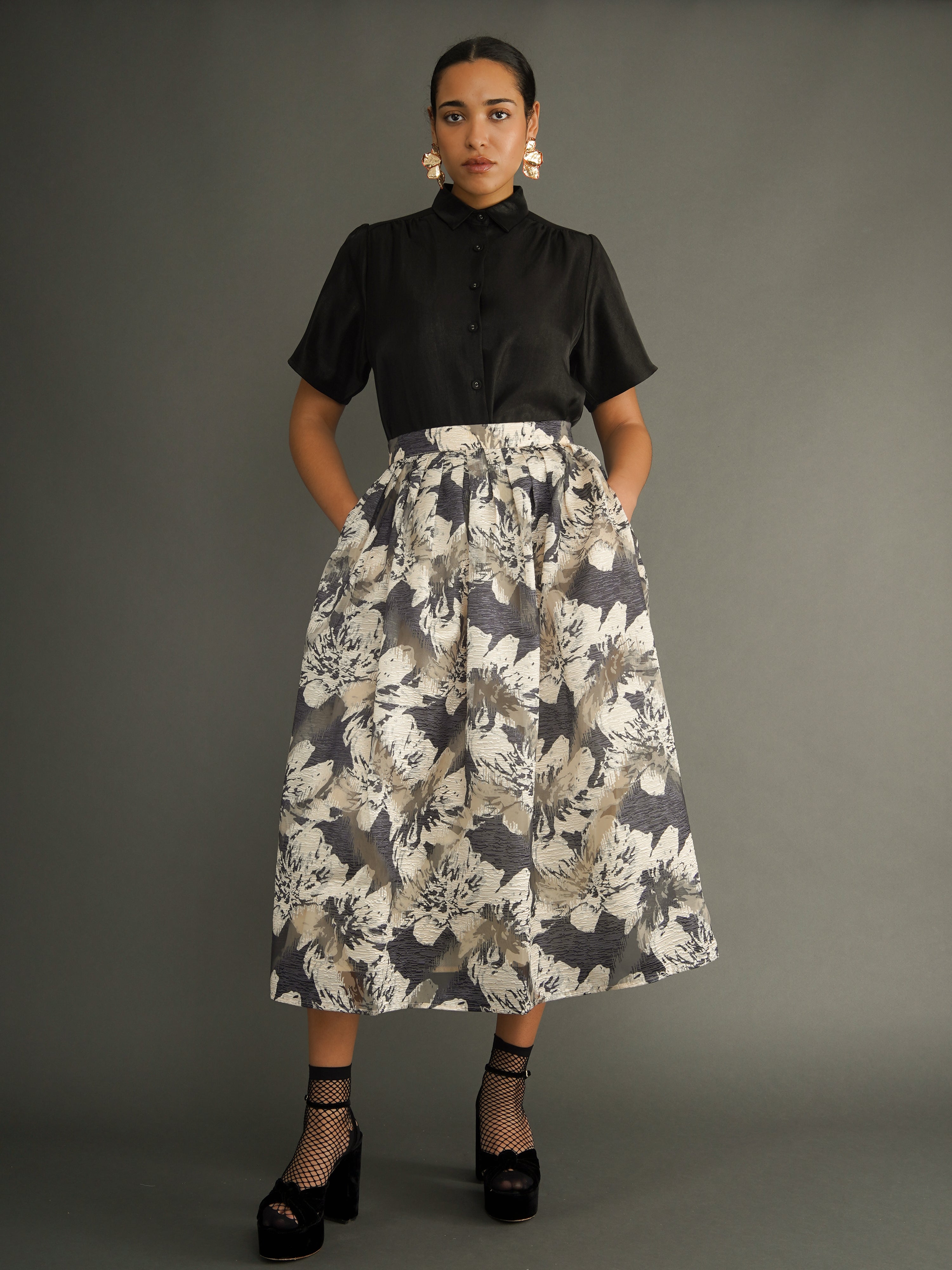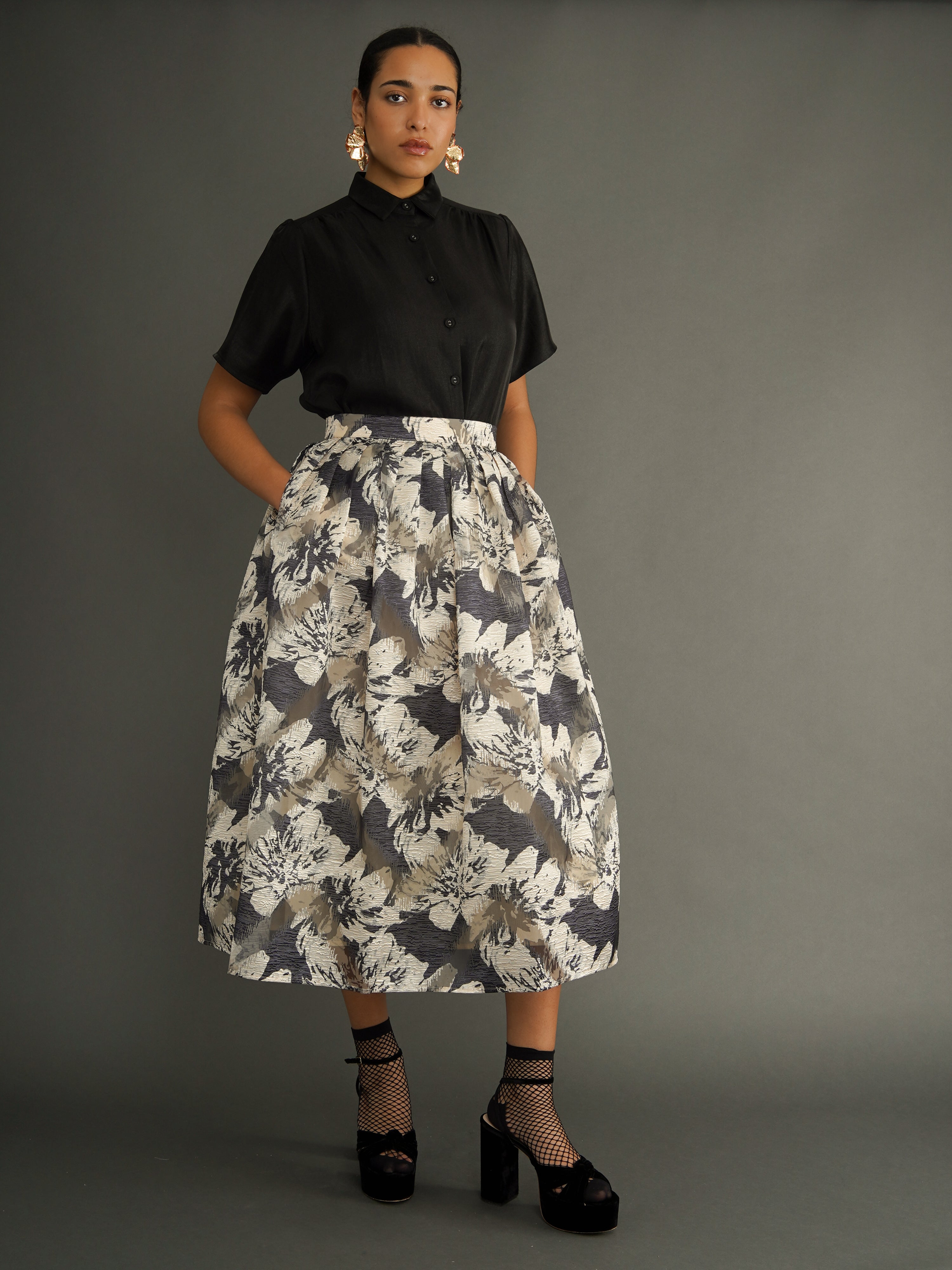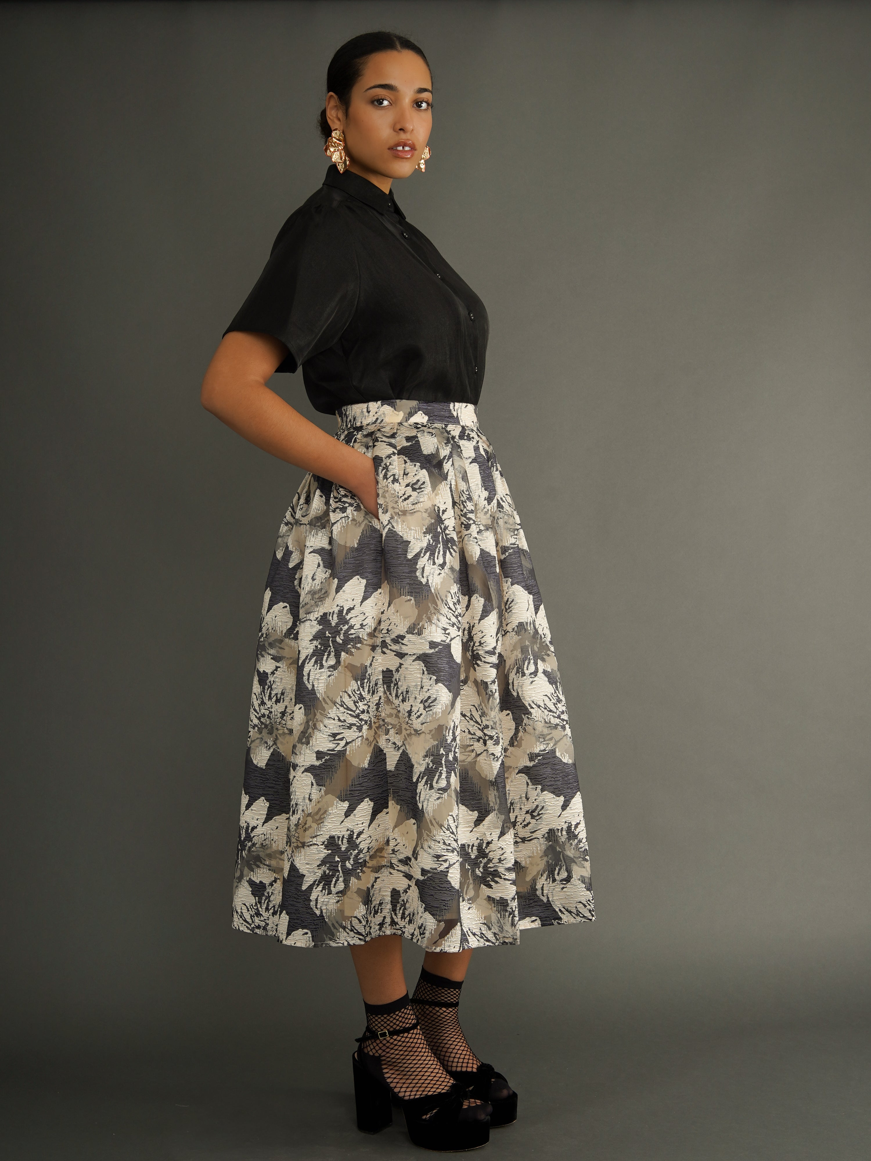 A skirt designed for movement and expression. The Omolara Skirt is cut from a silk-blend fabric with a soft sheen, pleated for volume and graceful drape. Its floral print is bold yet timeless—an elegant statement piece that elevates everyday wear and occasion dressing alike.