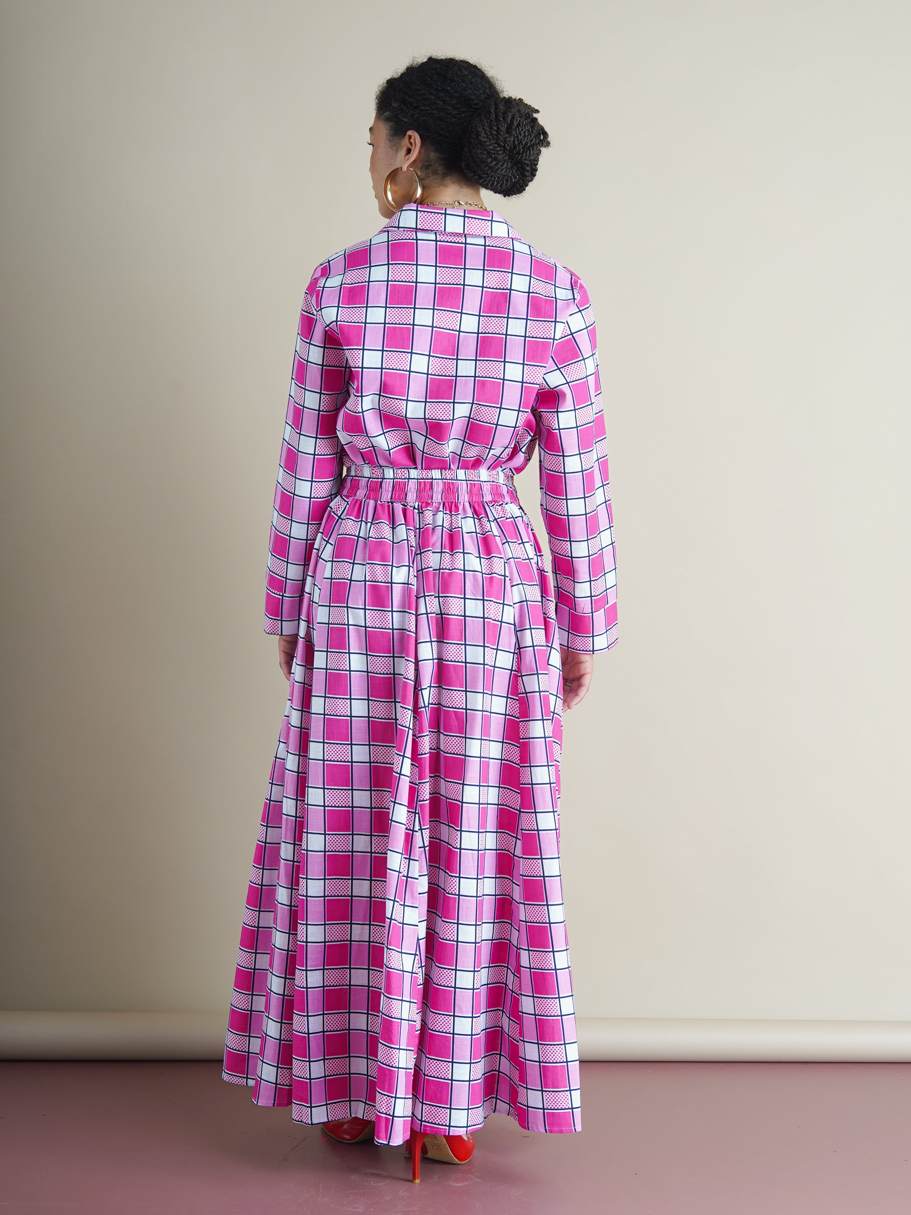 Maxi-length skirt cut from 100% lightweight cotton with a structured feel. Made in eight panels for volume and movement. Printed in a bold pink check. Elasticated waist with an external drawstring for adjustable fit. Side pockets.
