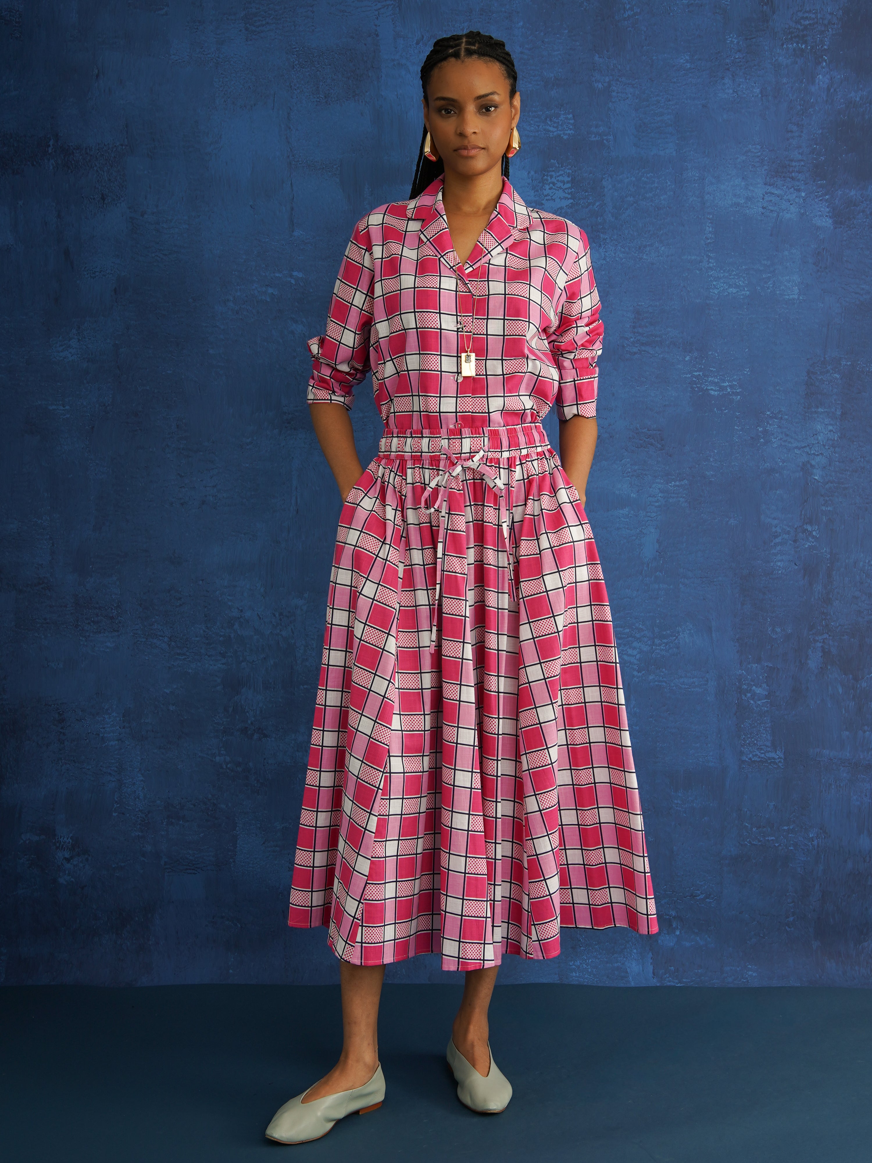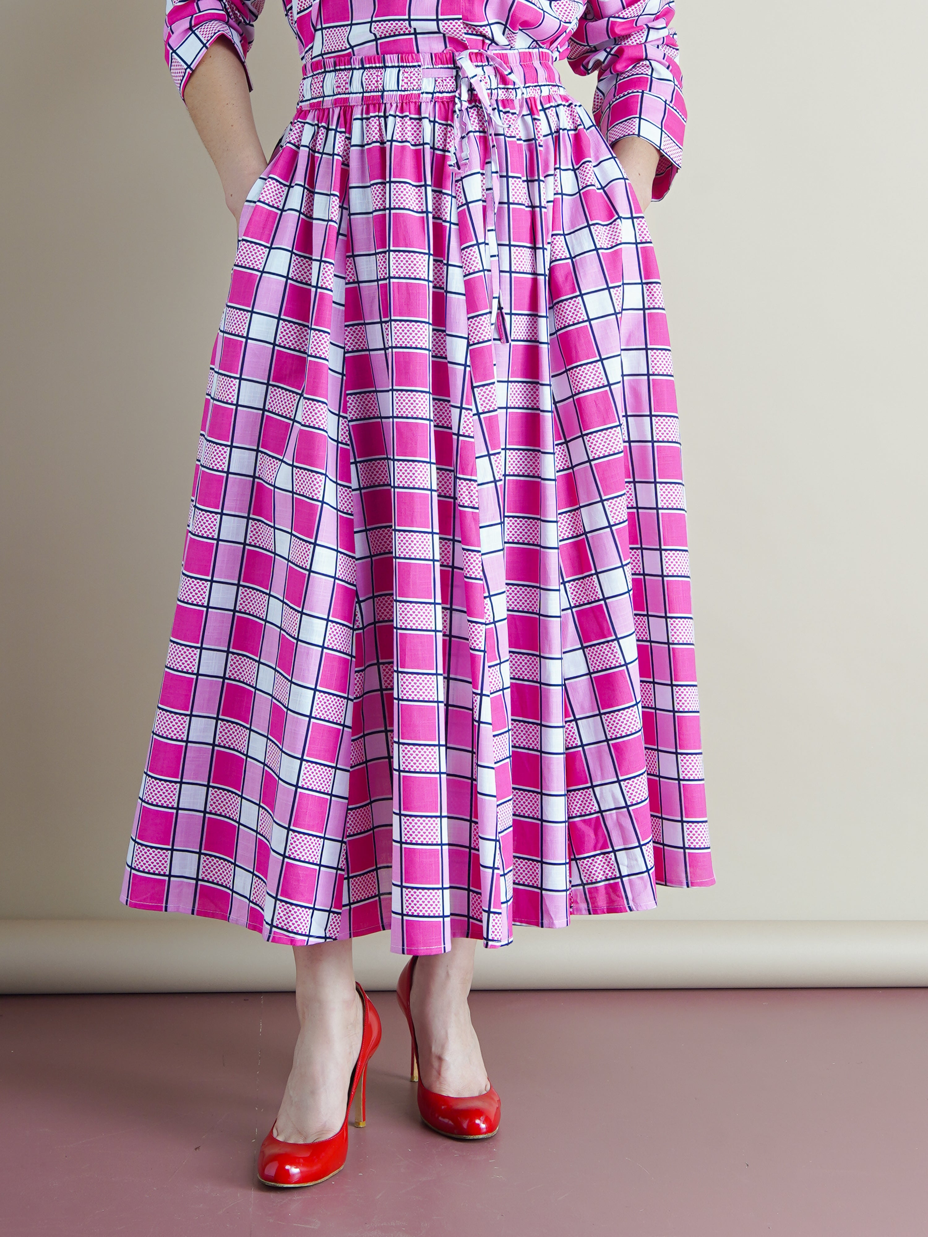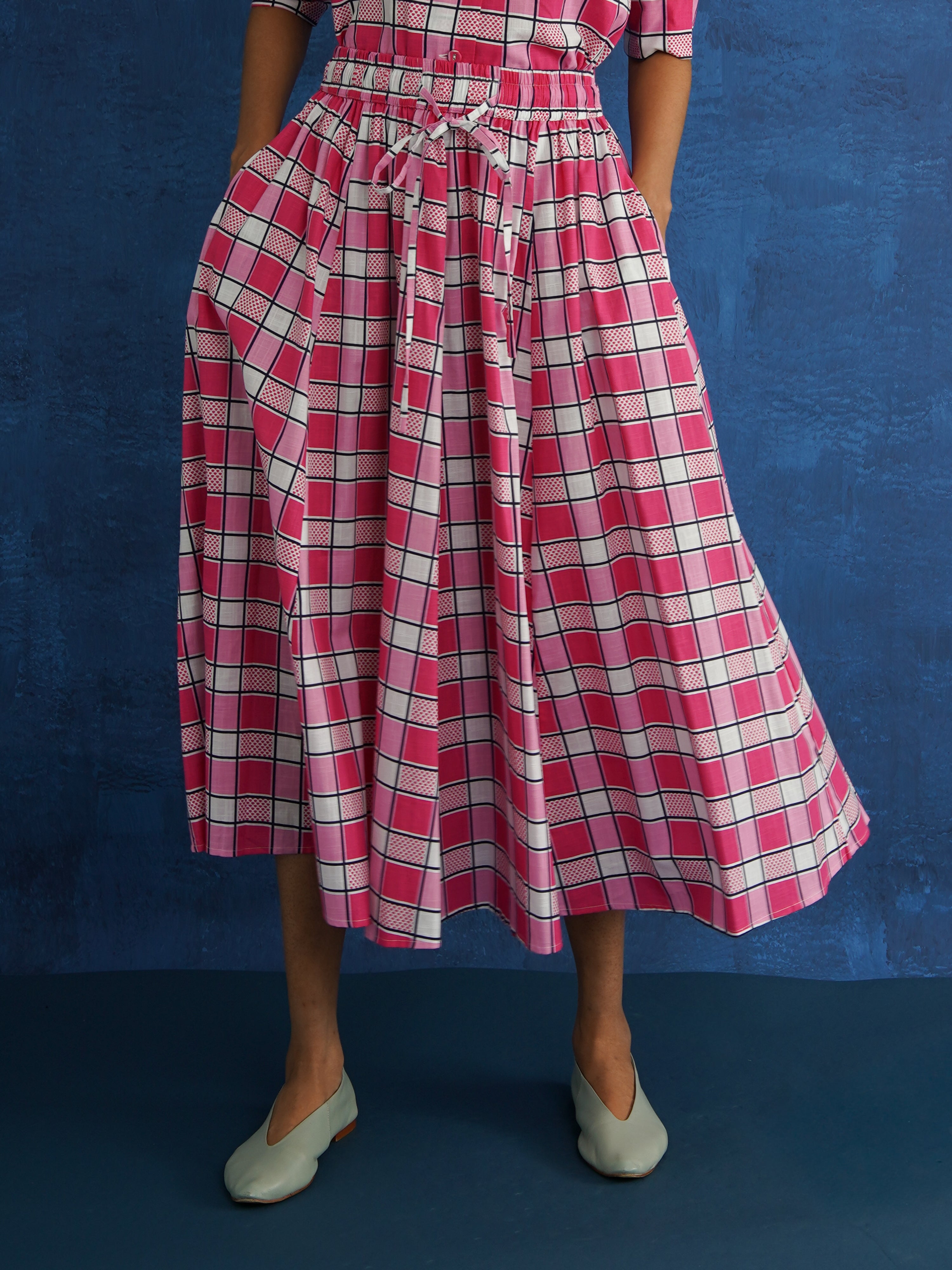 Midi-length skirt cut from 100% lightweight cotton with a structured feel. Made in eight panels for volume and movement. Printed in a bold pink check. Elasticated waist with an external drawstring for adjustable fit. Side pockets.