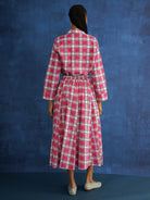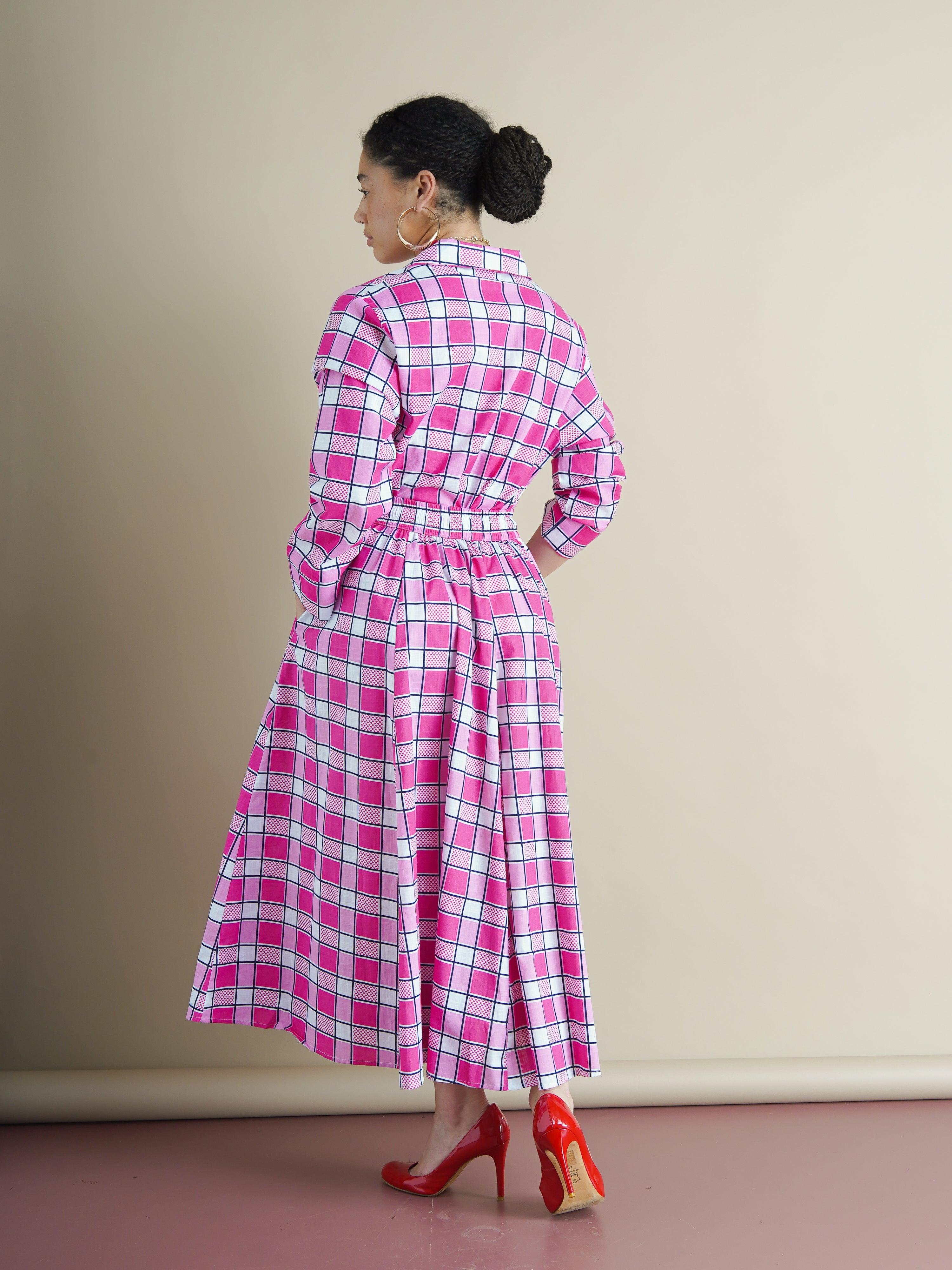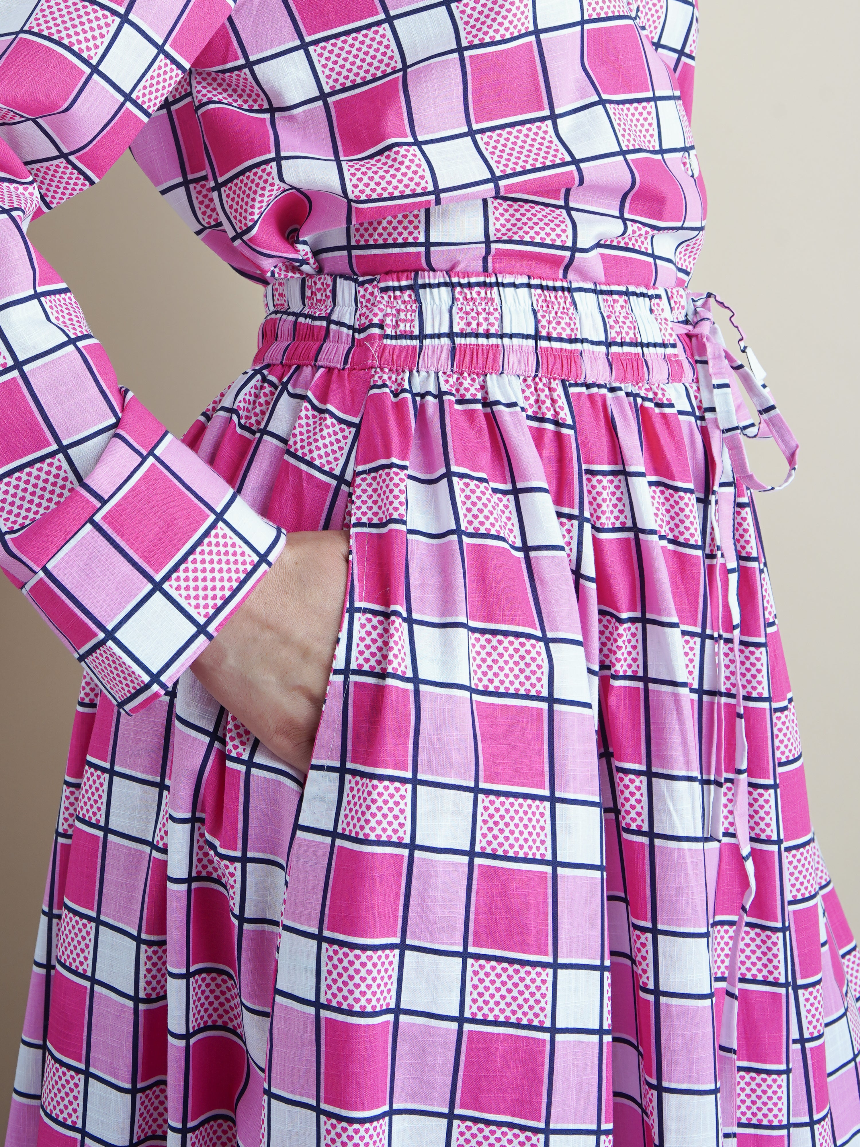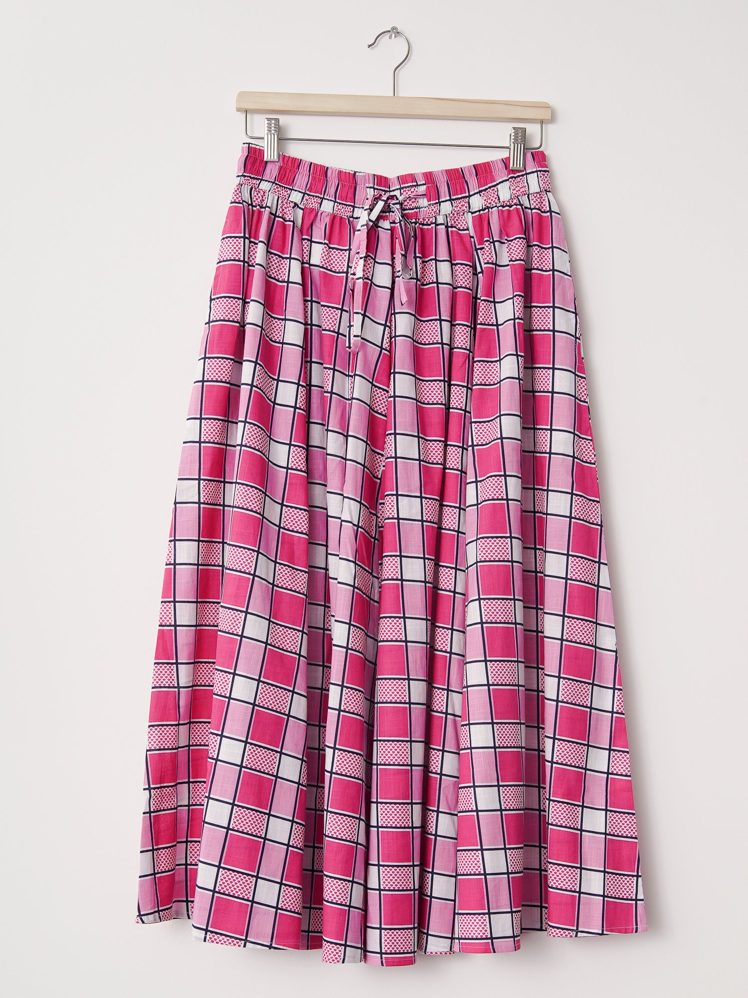 Midi-length skirt cut from 100% lightweight cotton with a structured feel. Made in eight panels for volume and movement. Printed in a bold pink check. Elasticated waist with an external drawstring for adjustable fit. Side pockets.