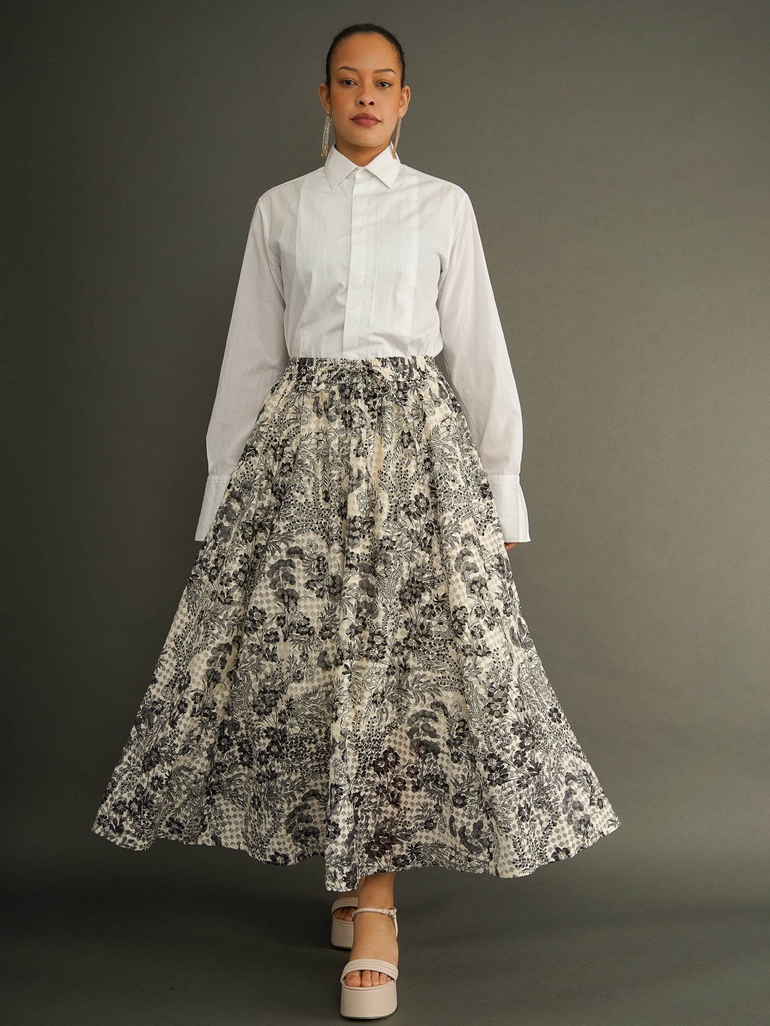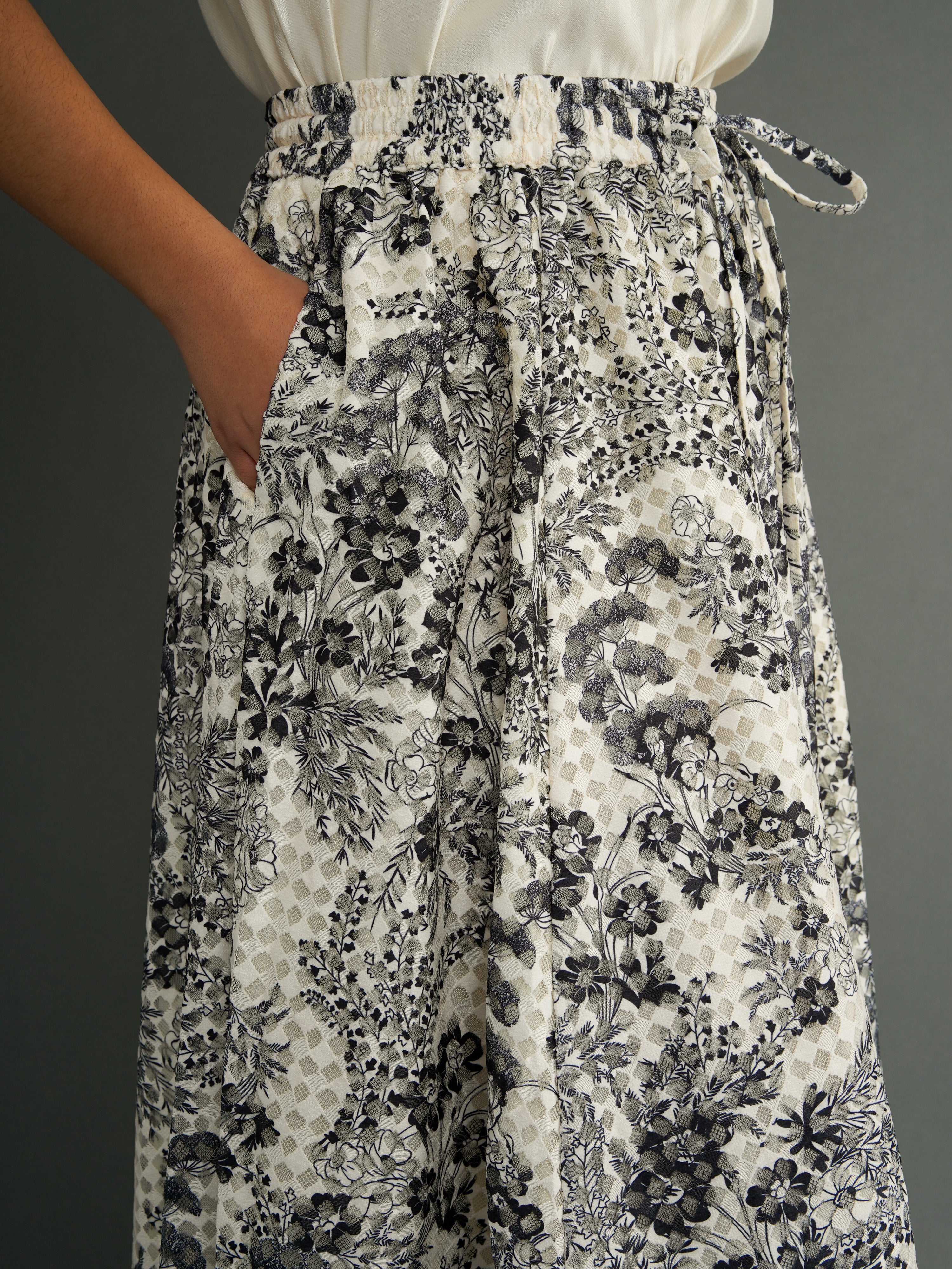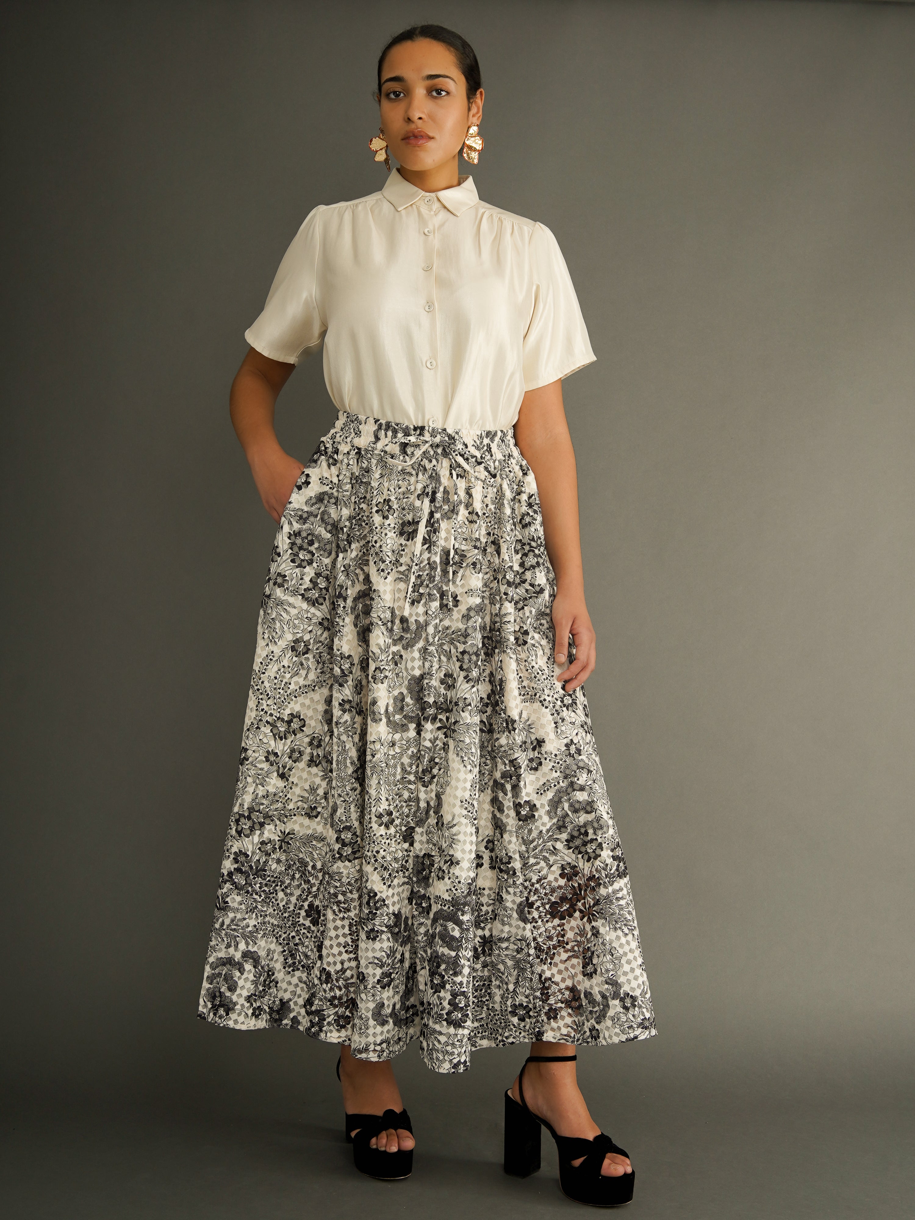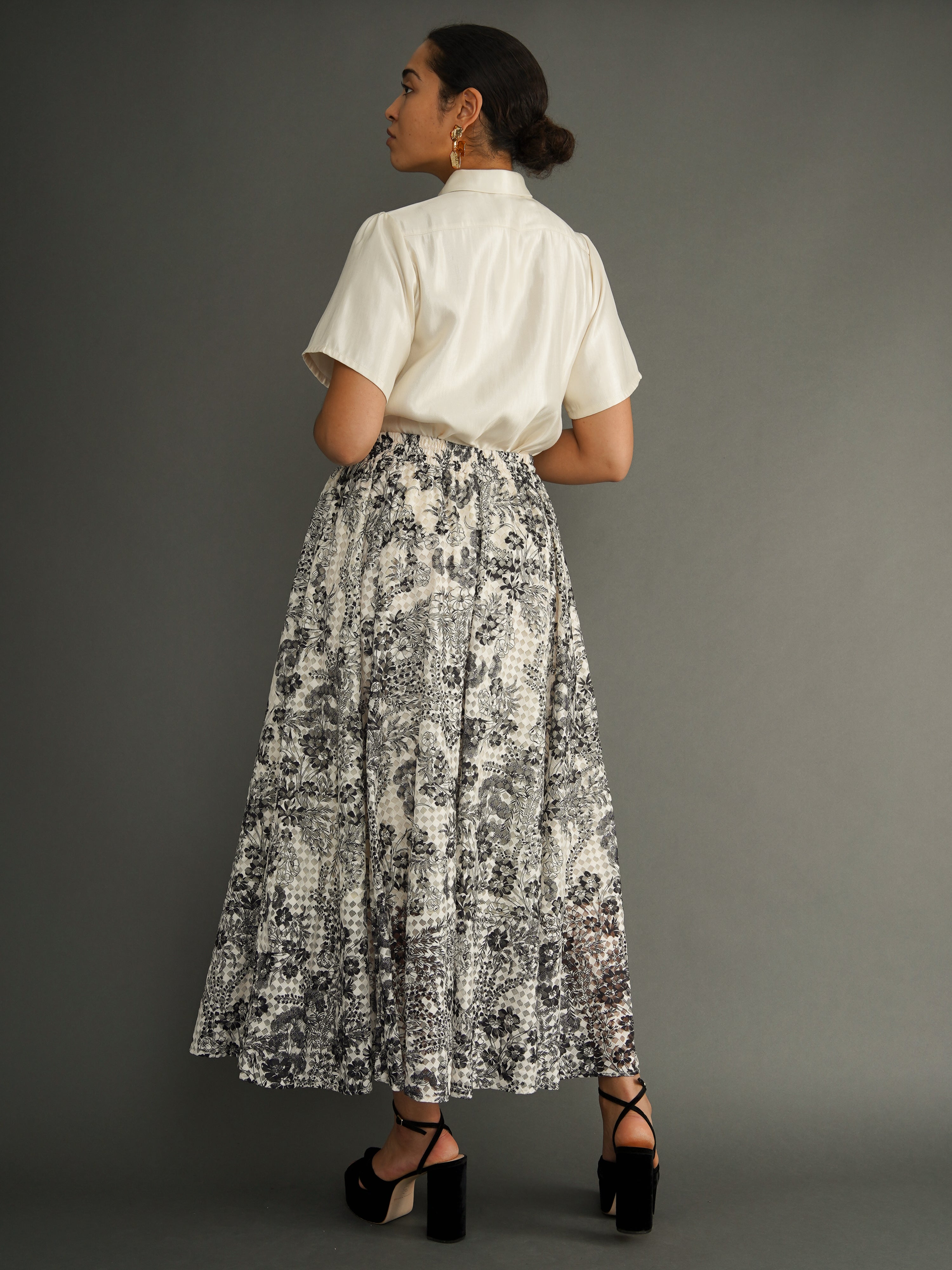 A full-length lace maxi skirt made for movement and versatility. Cut into eight flowing panels, this piece is crafted from black, and off-white floral lace, with a soft cotton lining beneath.
