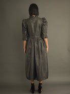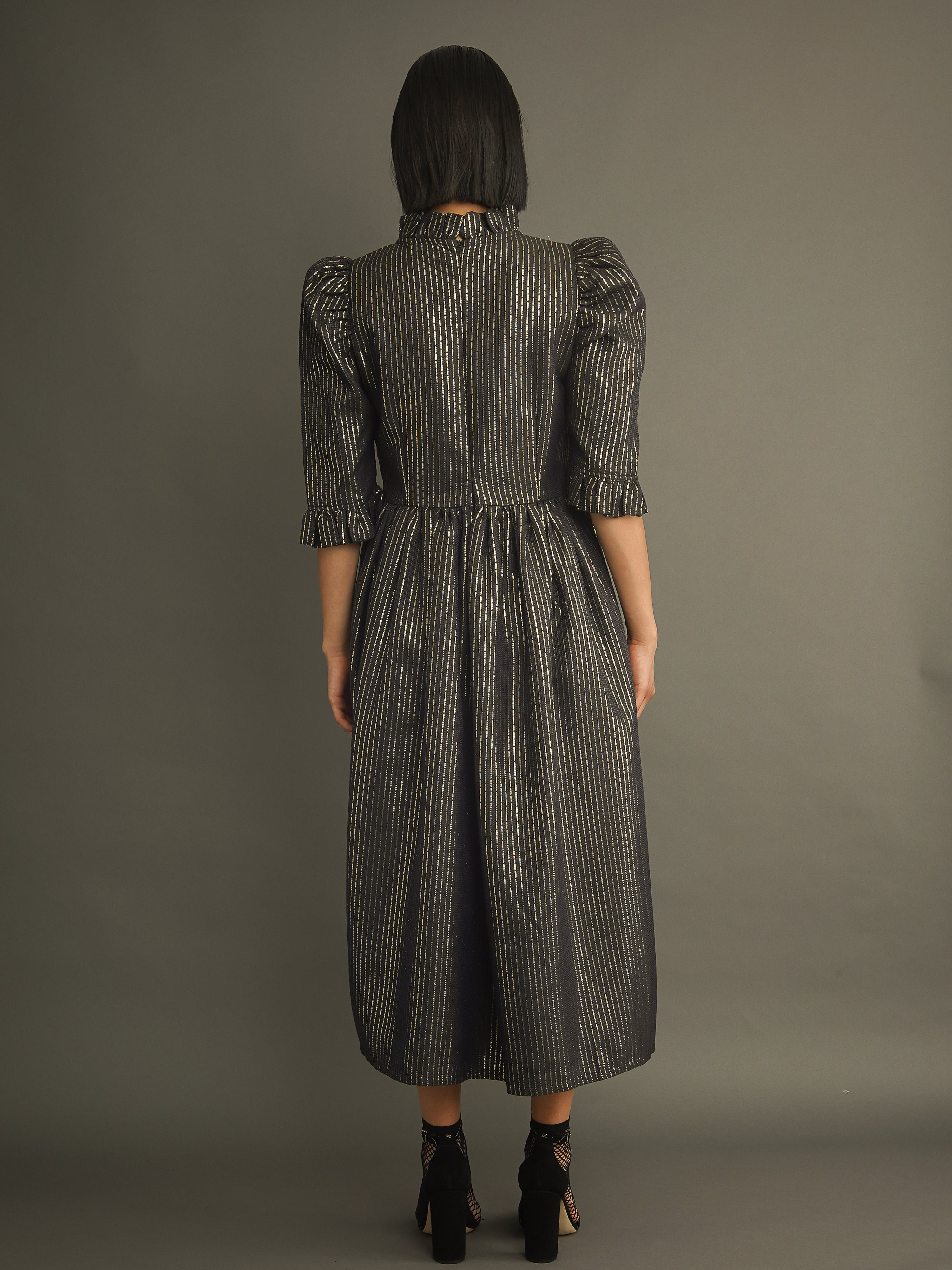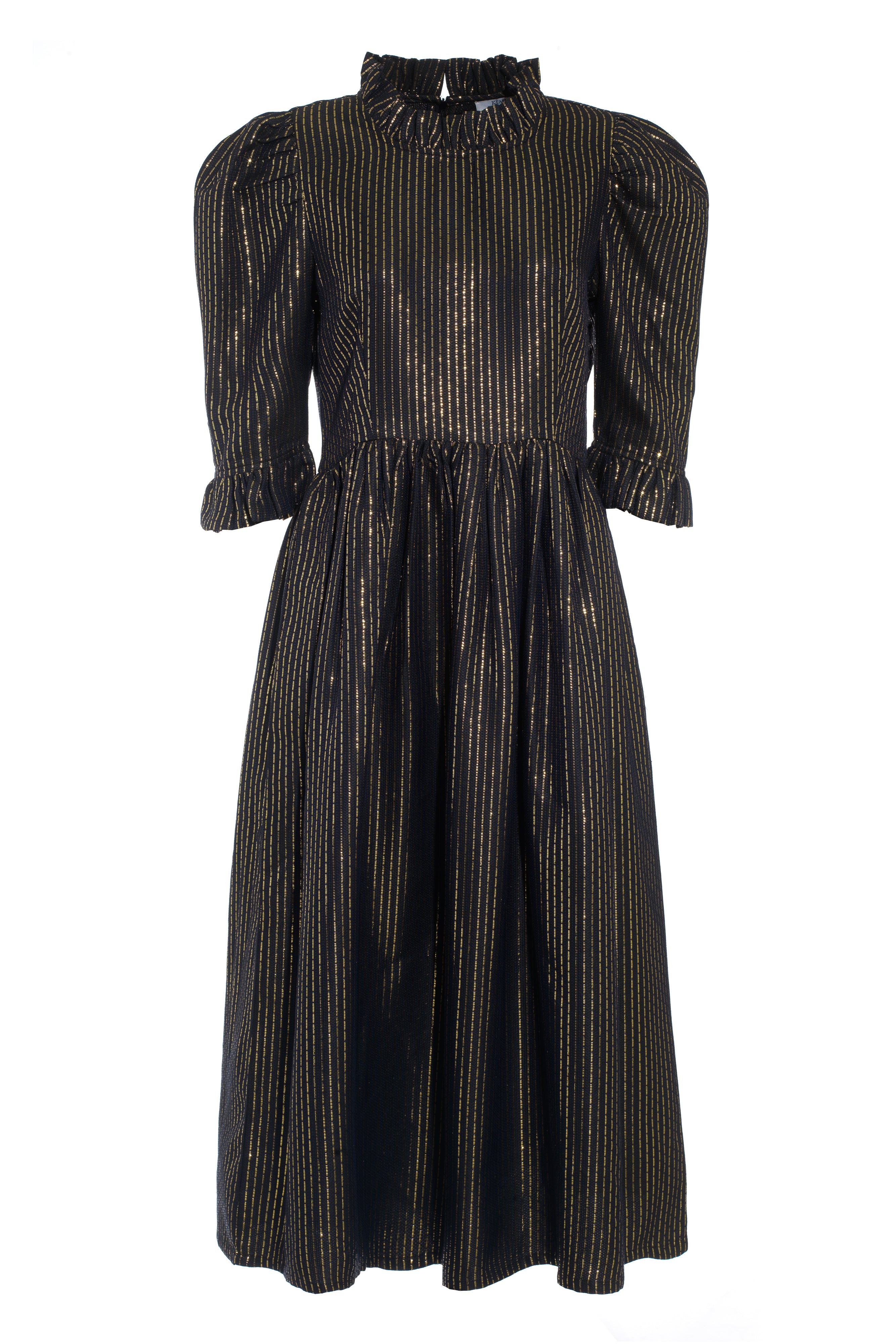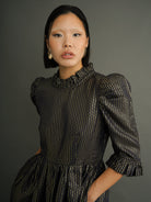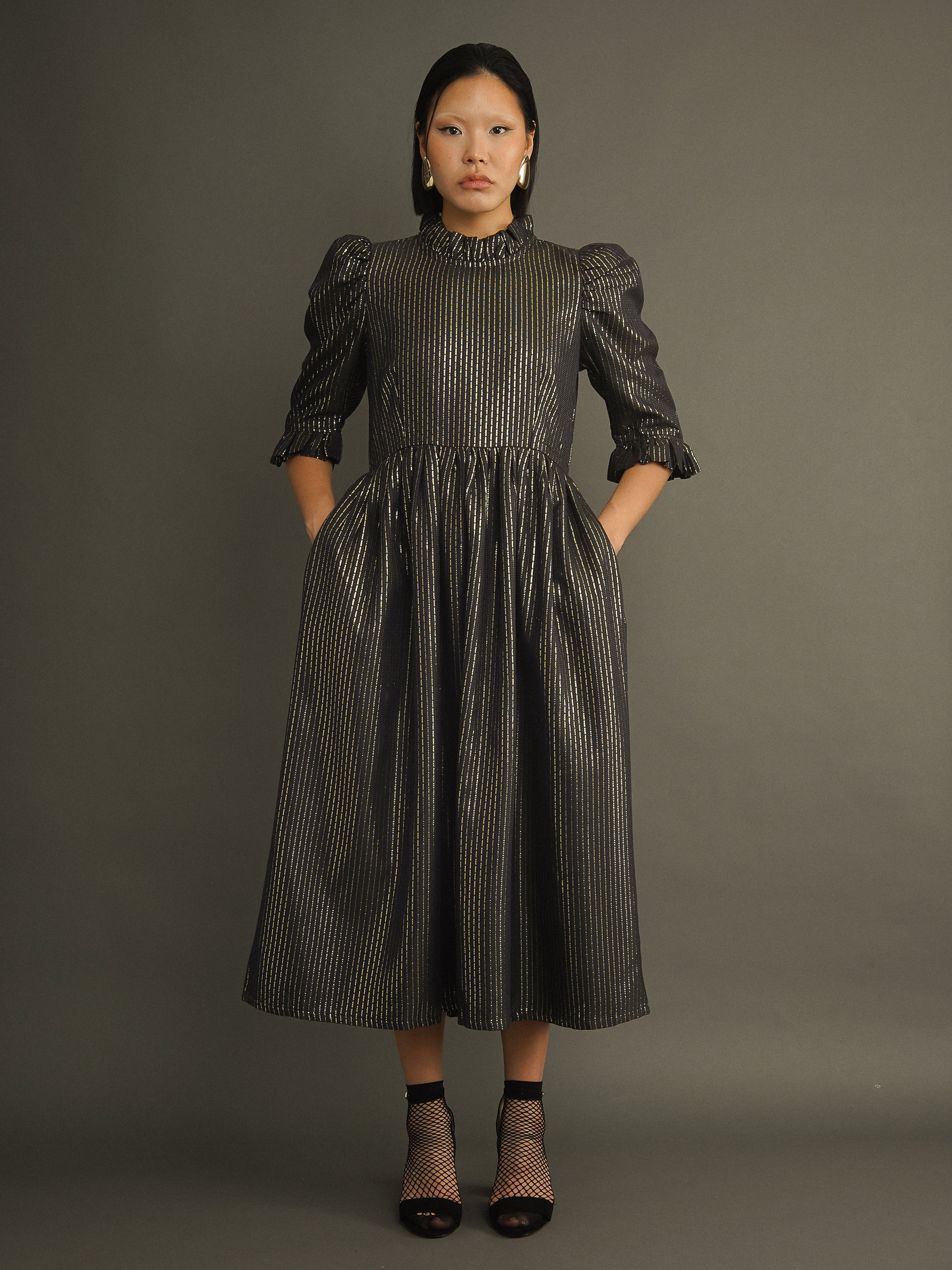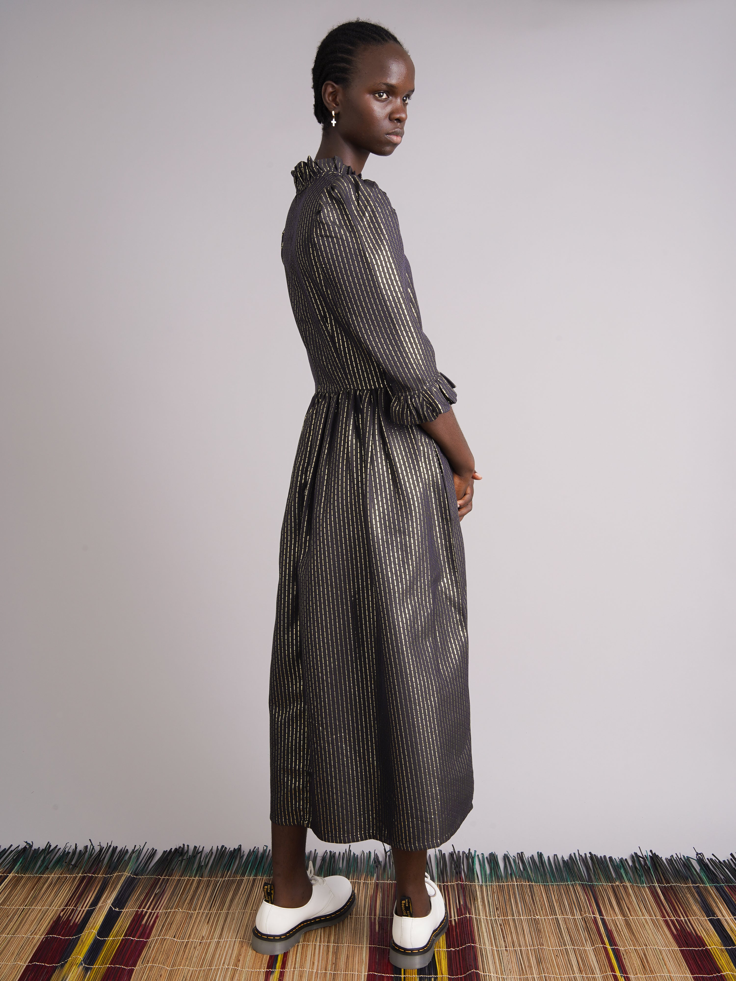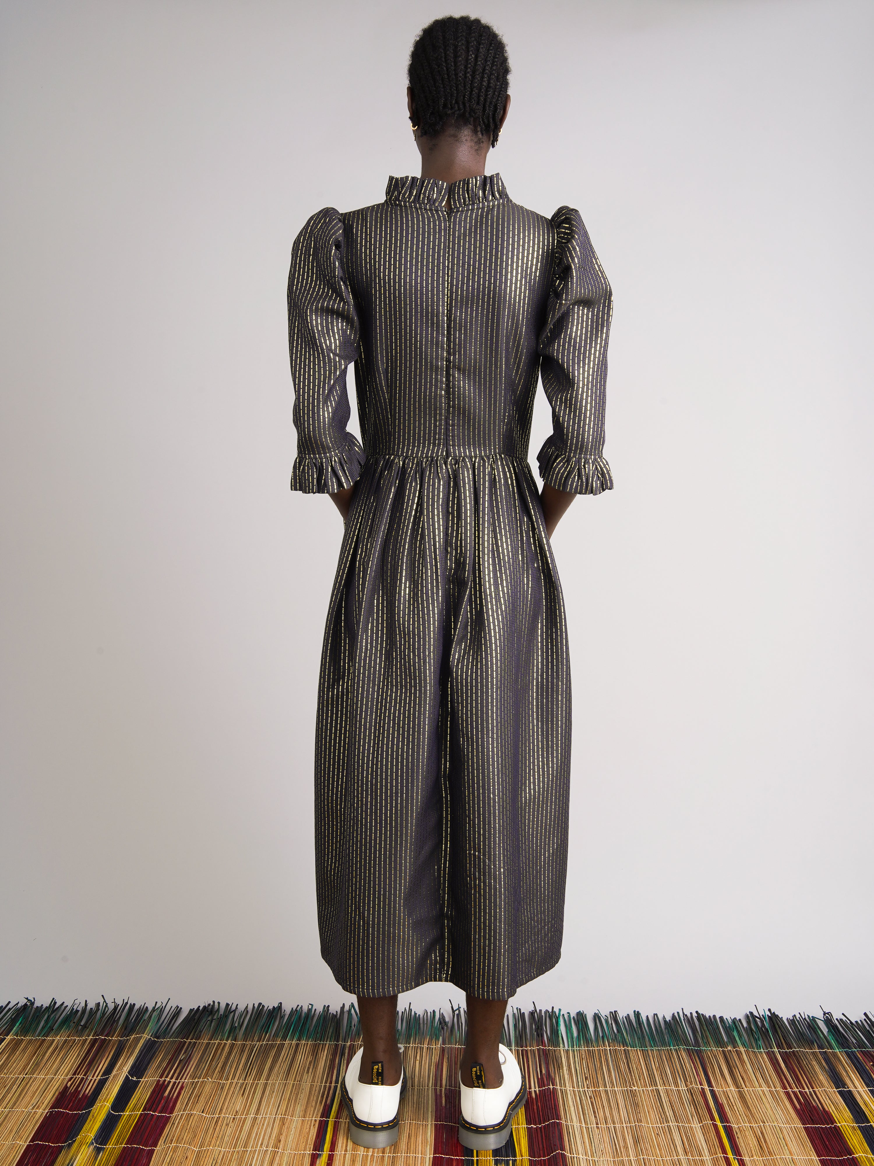 100% cotton black jacquard with gold Lurex thread. Fully lined for comfort and structure. Ruffled high neck and puffed sleeves. Side seam pockets. Midi length. Enclosed zip at the back