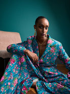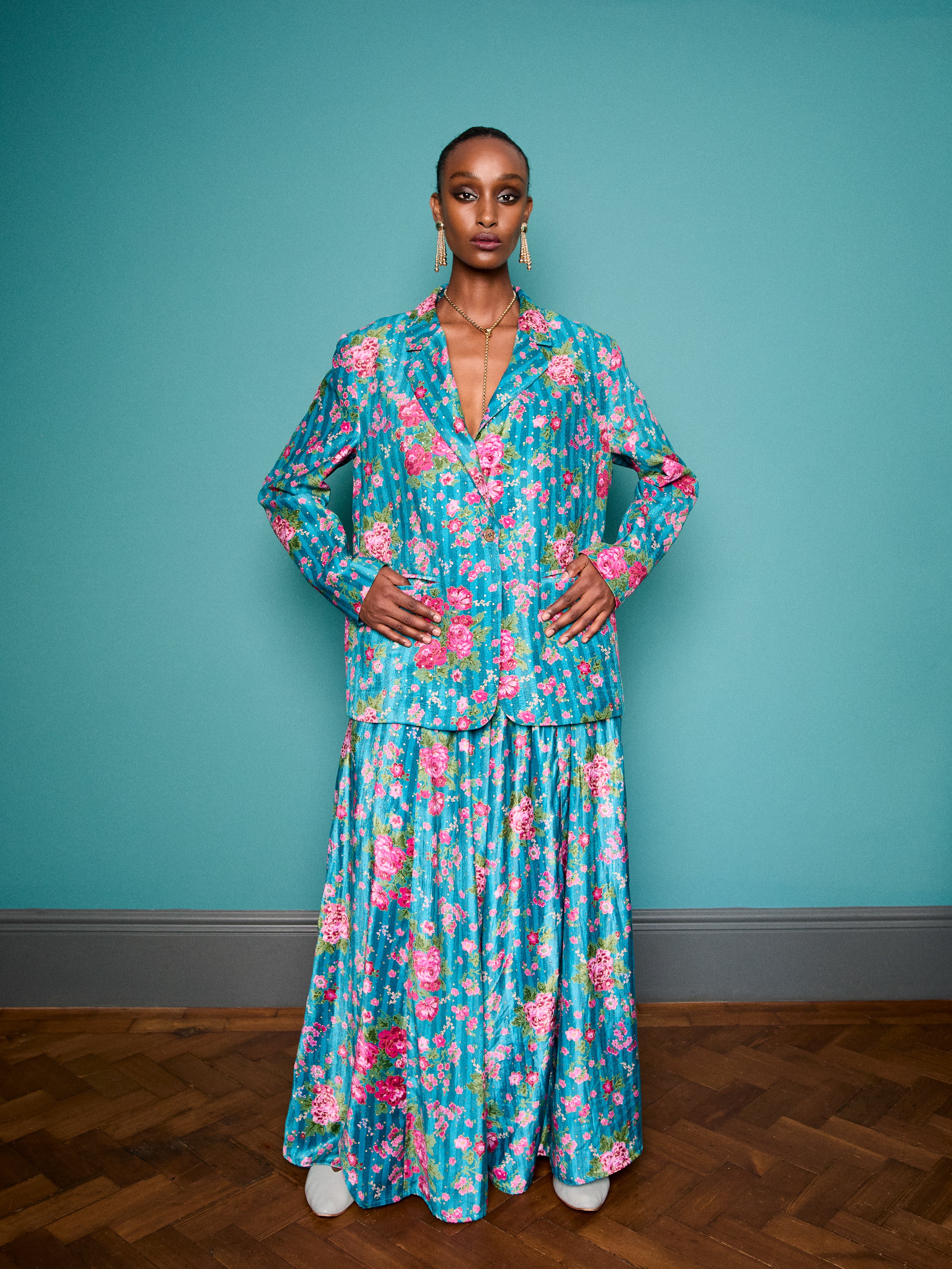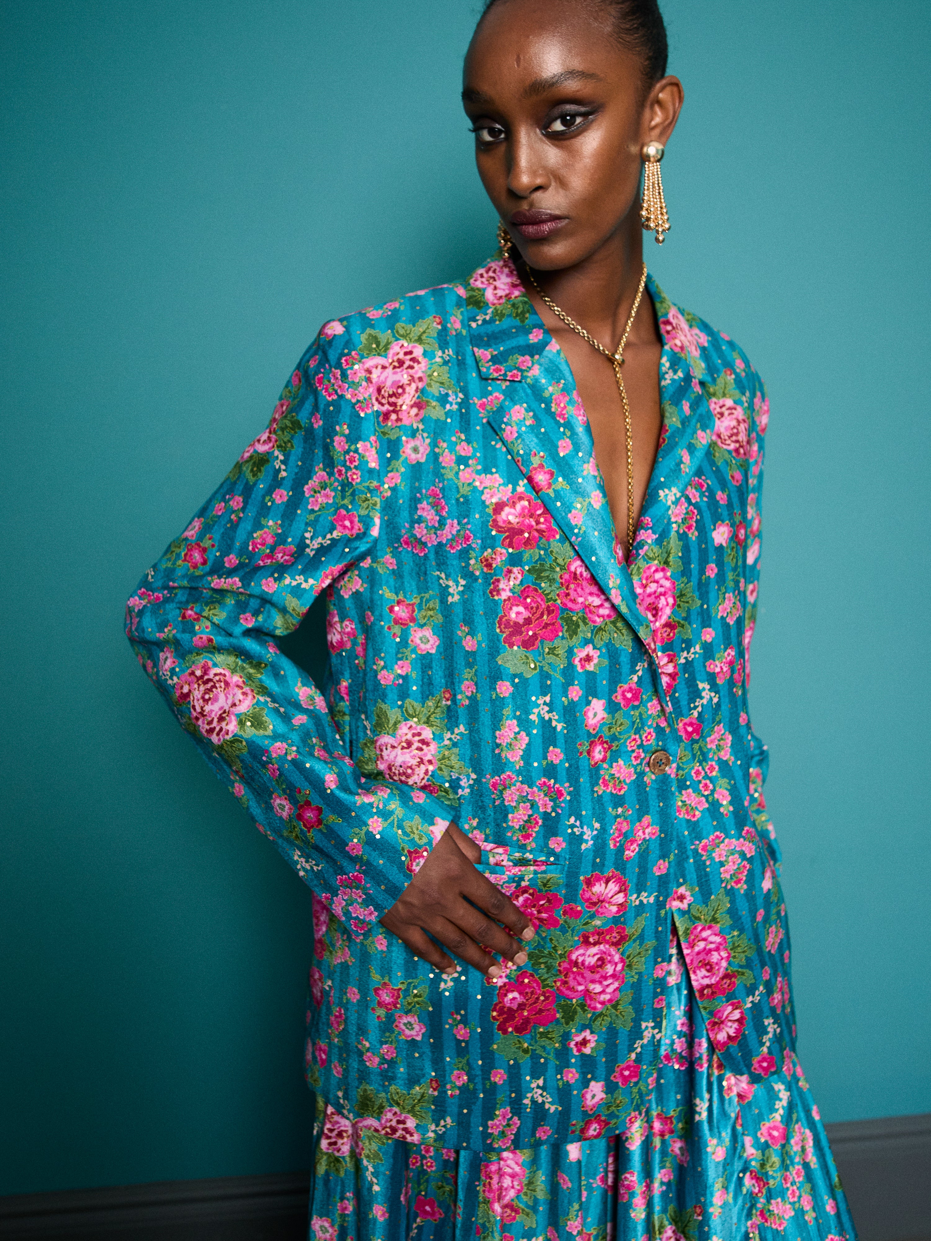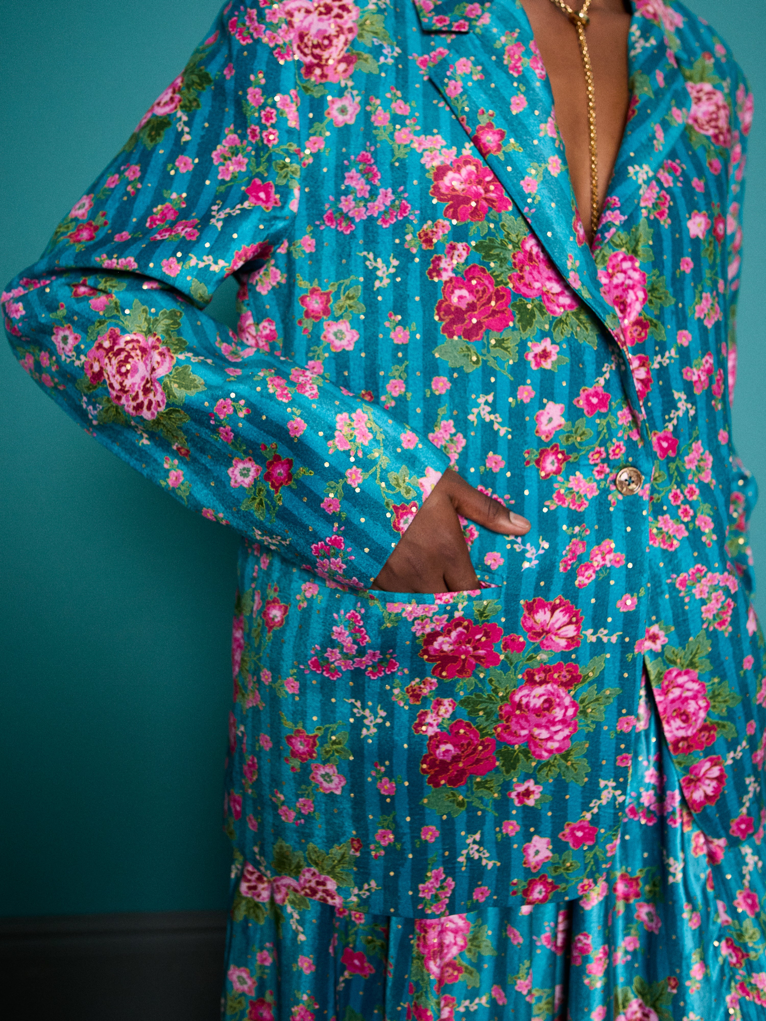 The Charlie Floral Velvet Jacket is cut from luxurious turquoise velvet, scattered with vivid pink blooms and flecks of gold. It’s bold, tactile, and unapologetically joyful, the kind of piece that speaks before you do.