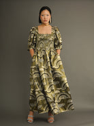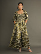 Oba Statement Gold Maxi Dress – Metallic Print, Smocked Bodice