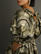 Maxi dress cut from a structured blend of polyester, cotton, and lurex. The fabric has a metallic sheen and bold geometric print. Fully smocked bodice for a close fit. Short puff sleeves with gathered detail. Adjustable tie at the back. Unlined. May require a slip due to the lurex content.