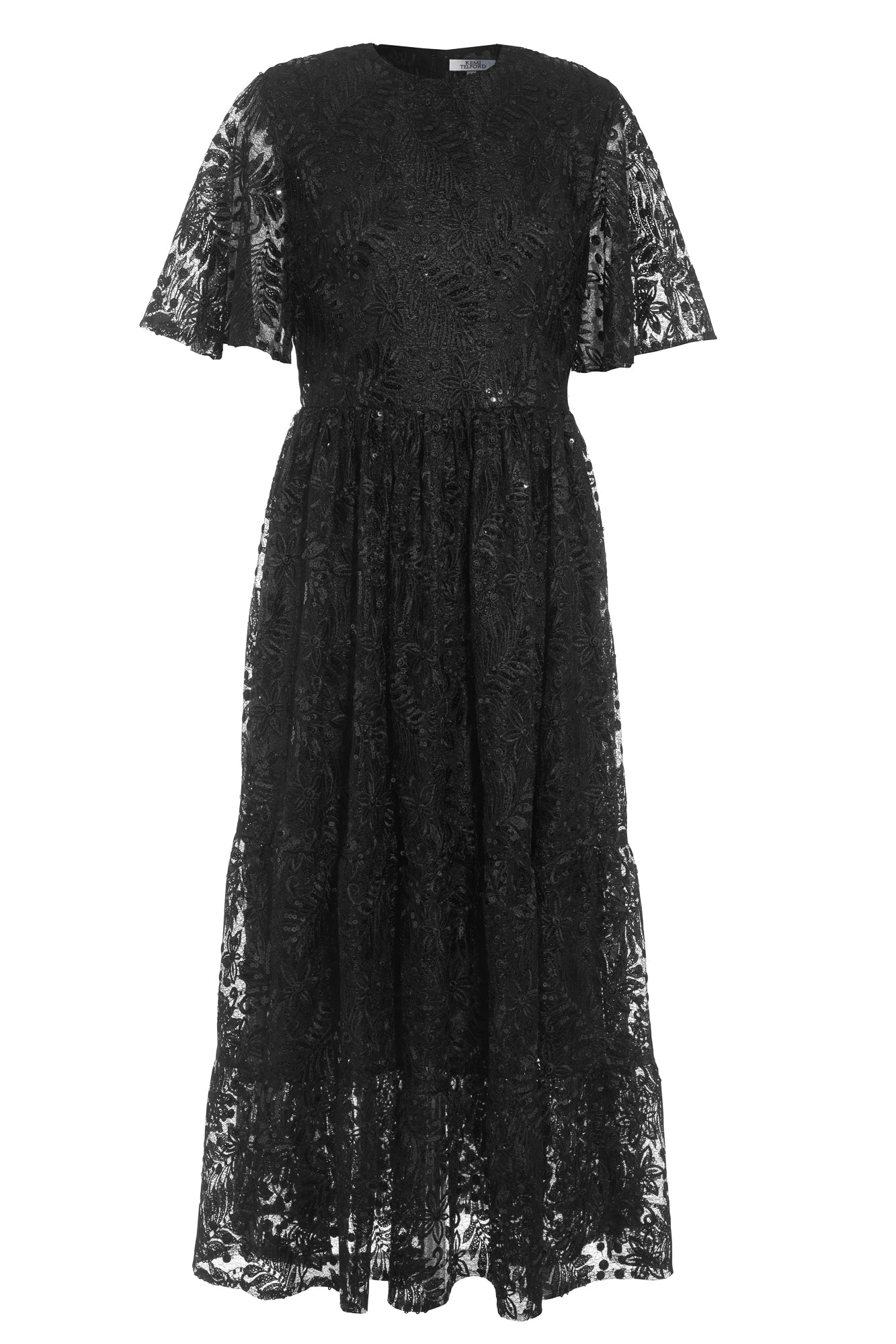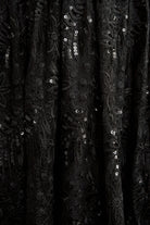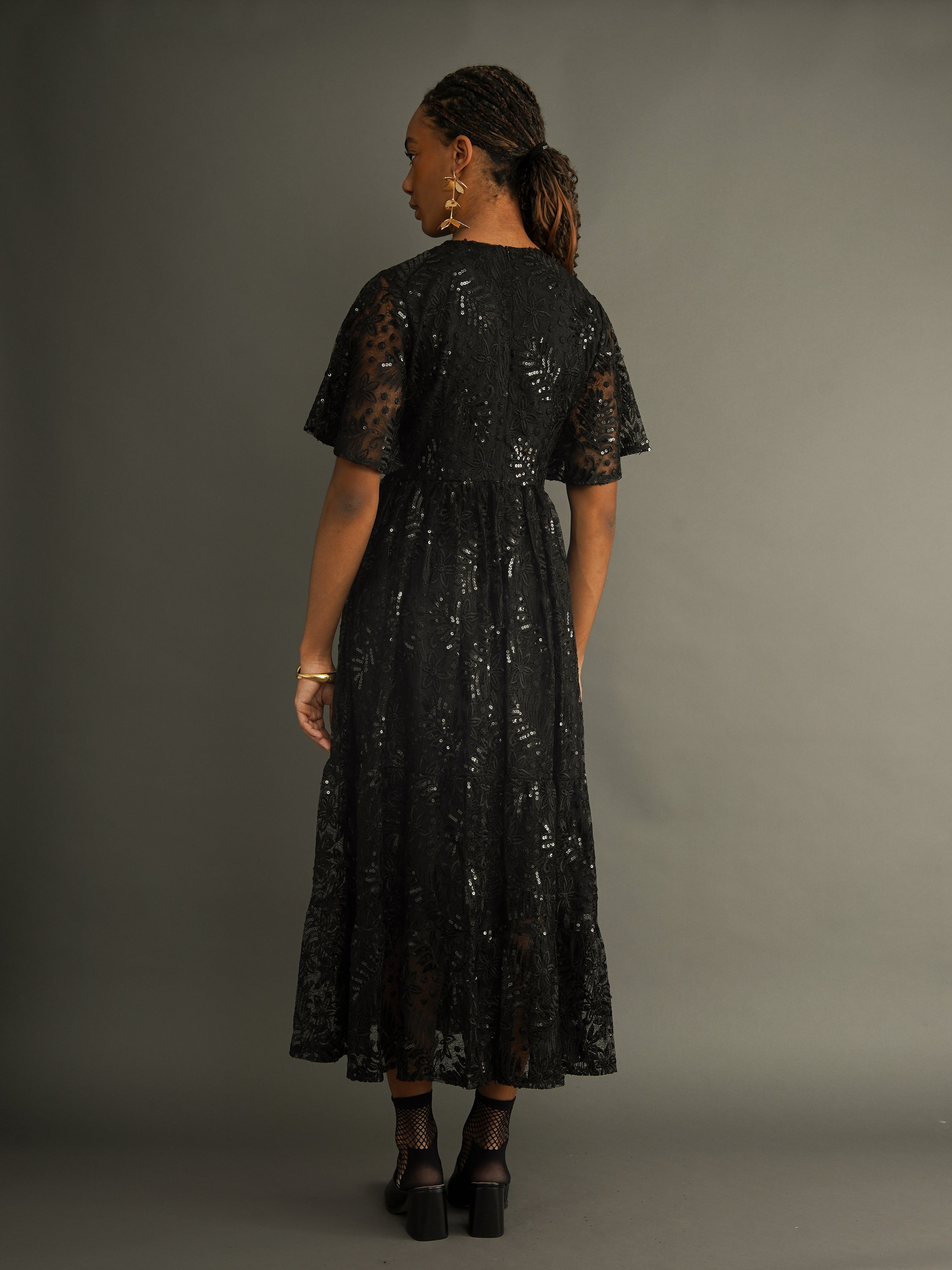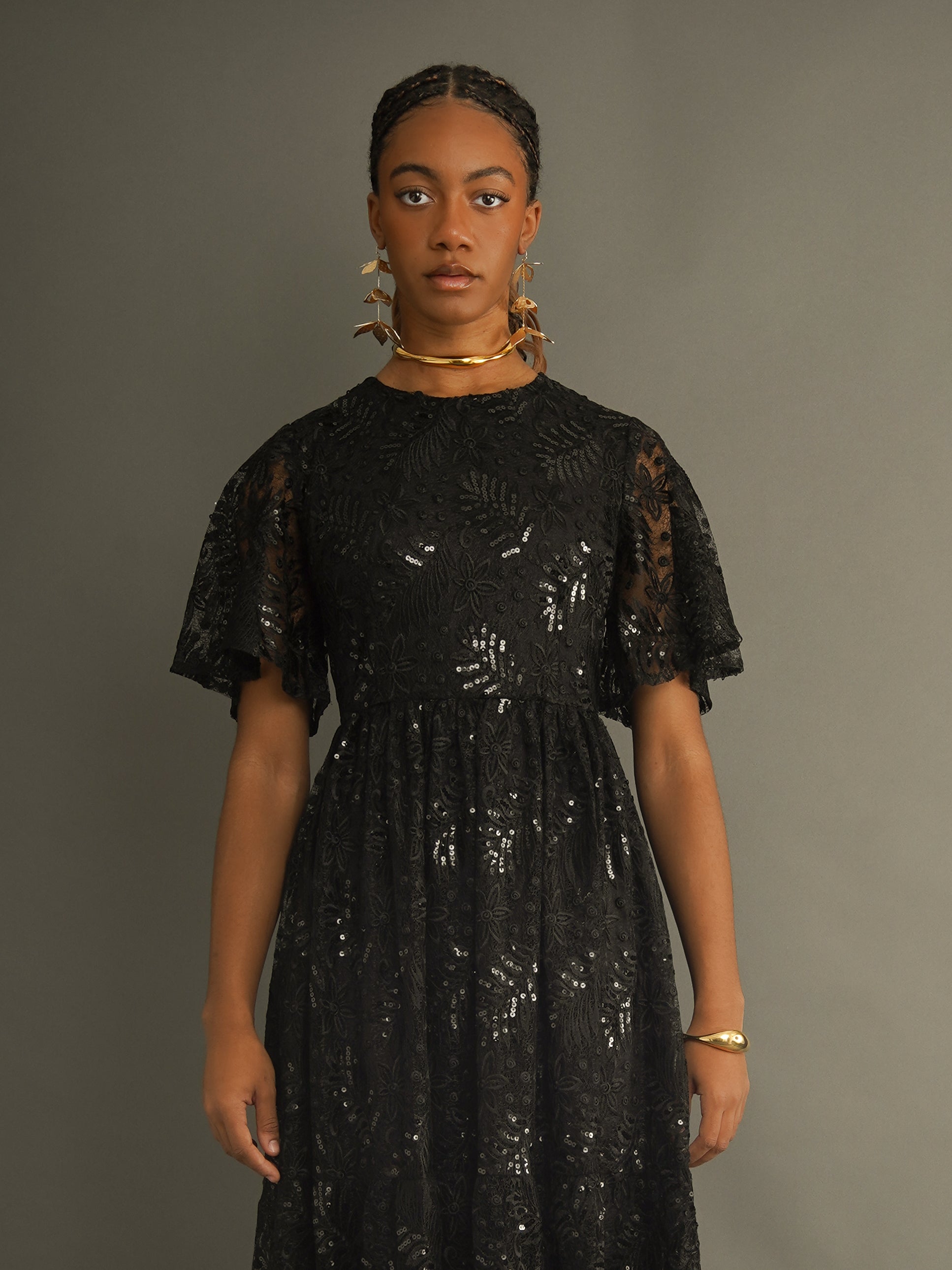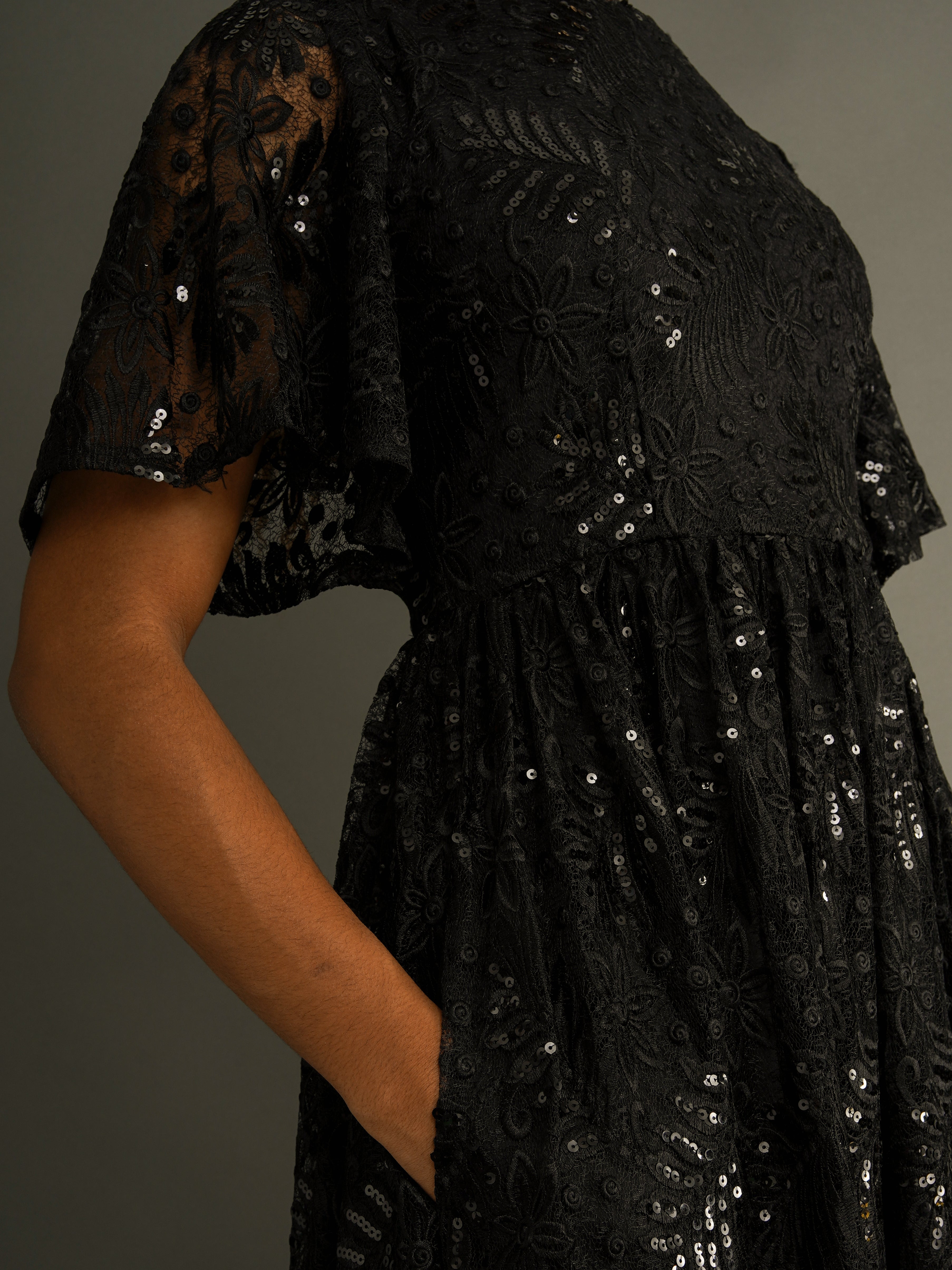 Mid-weight embroidered lace with sequins. Voluminous gathered and tiered skirt. Fully lined body (sleeves unlined to show the lace). Round neckline with concealed back zip. Short flared sleeves. Fitted bodice for subtle structure. Side seam pockets. Designed for a bold yet comfortable fit.