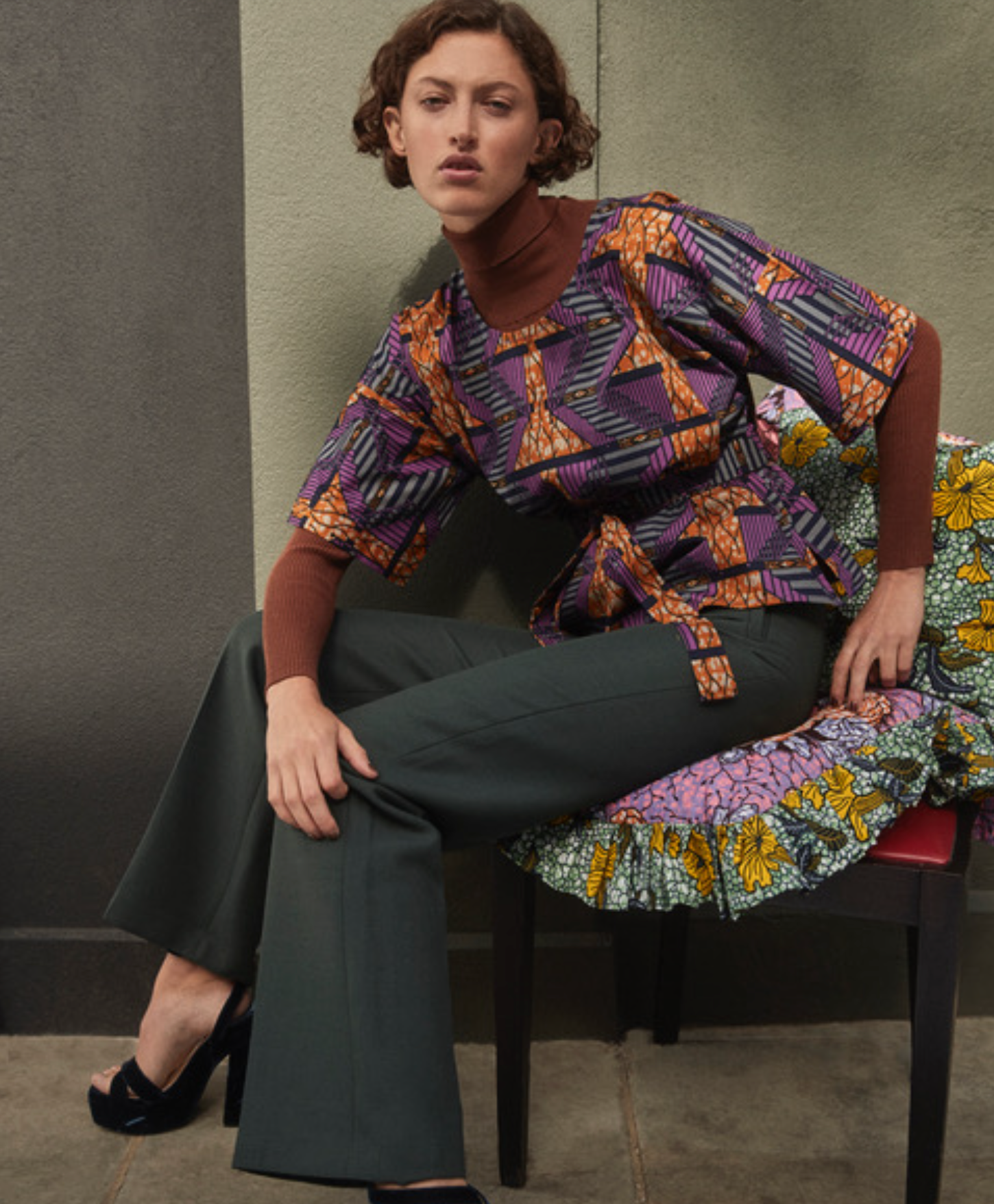 Drawing inspiration from the traditional attire that is worn by women of the Yoruba tribe in Nigeria, Yvonne has created a modern and versatile belted version that can be worn with a skirt or a pair of jeans by any woman.