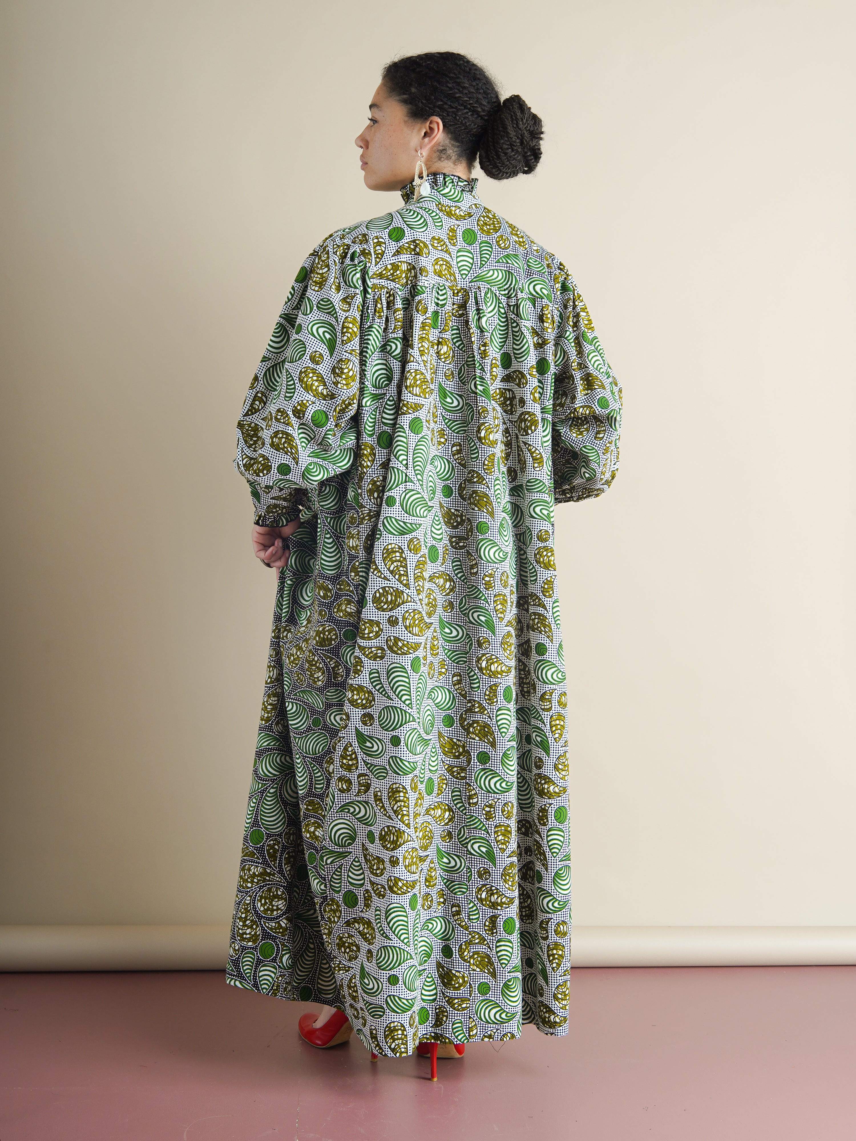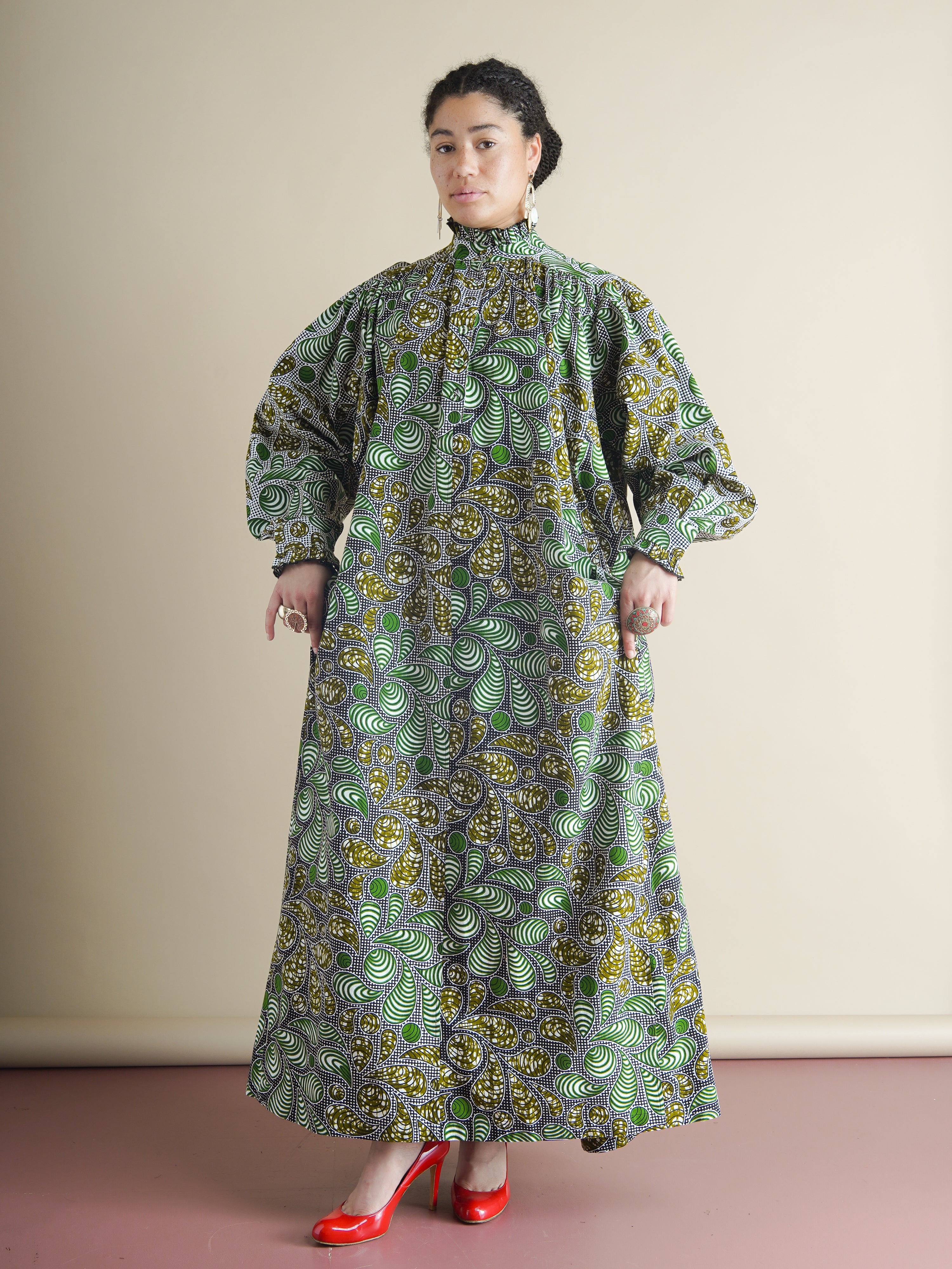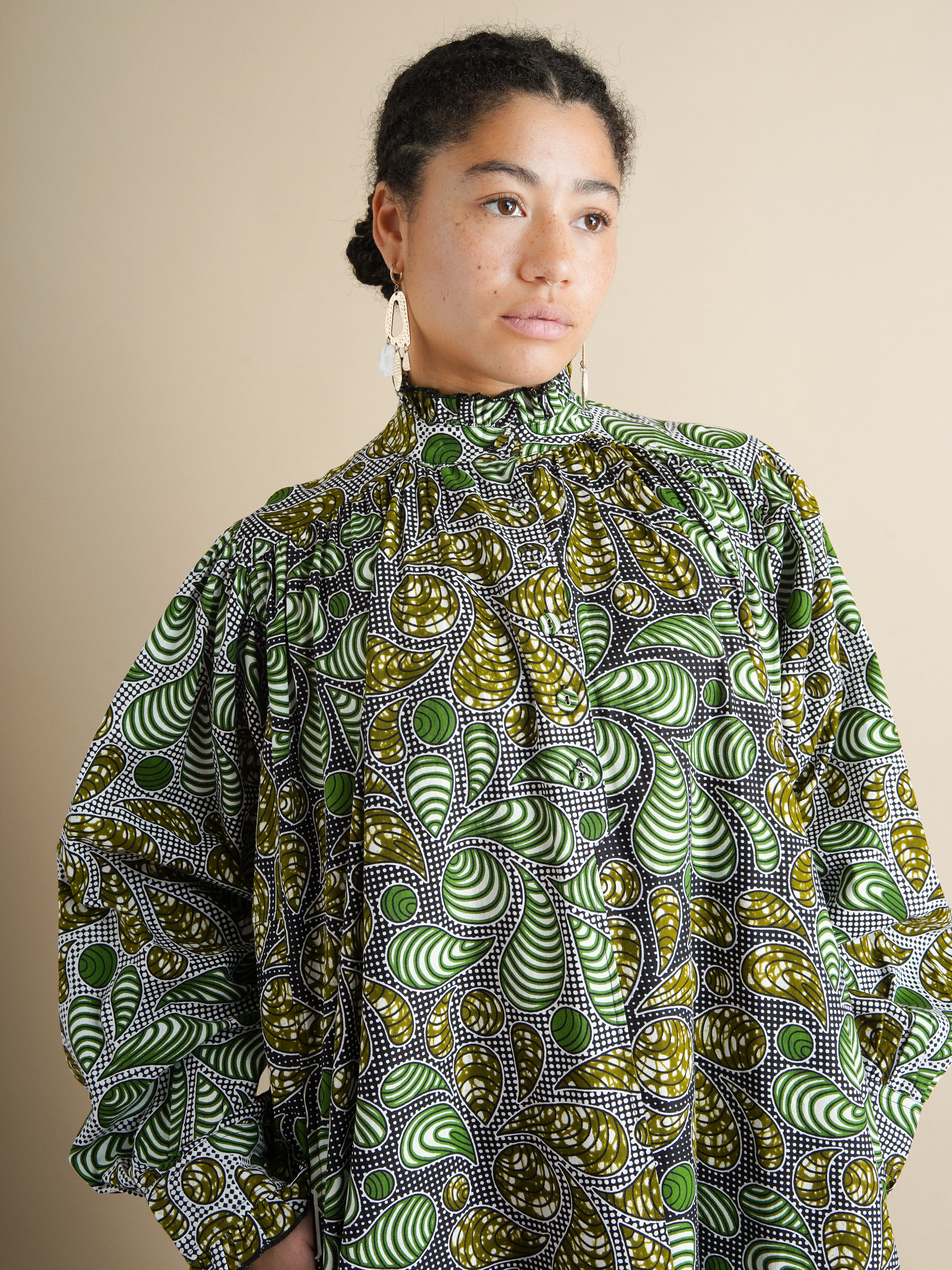 Crafted from 100% mid-weight Dutch wax cotton, this one-of-a-kind piece blends sculptural shape with everyday ease. The vibrant cloth gives structure, allowing the voluminous silhouette to hold its form while still moving with you.