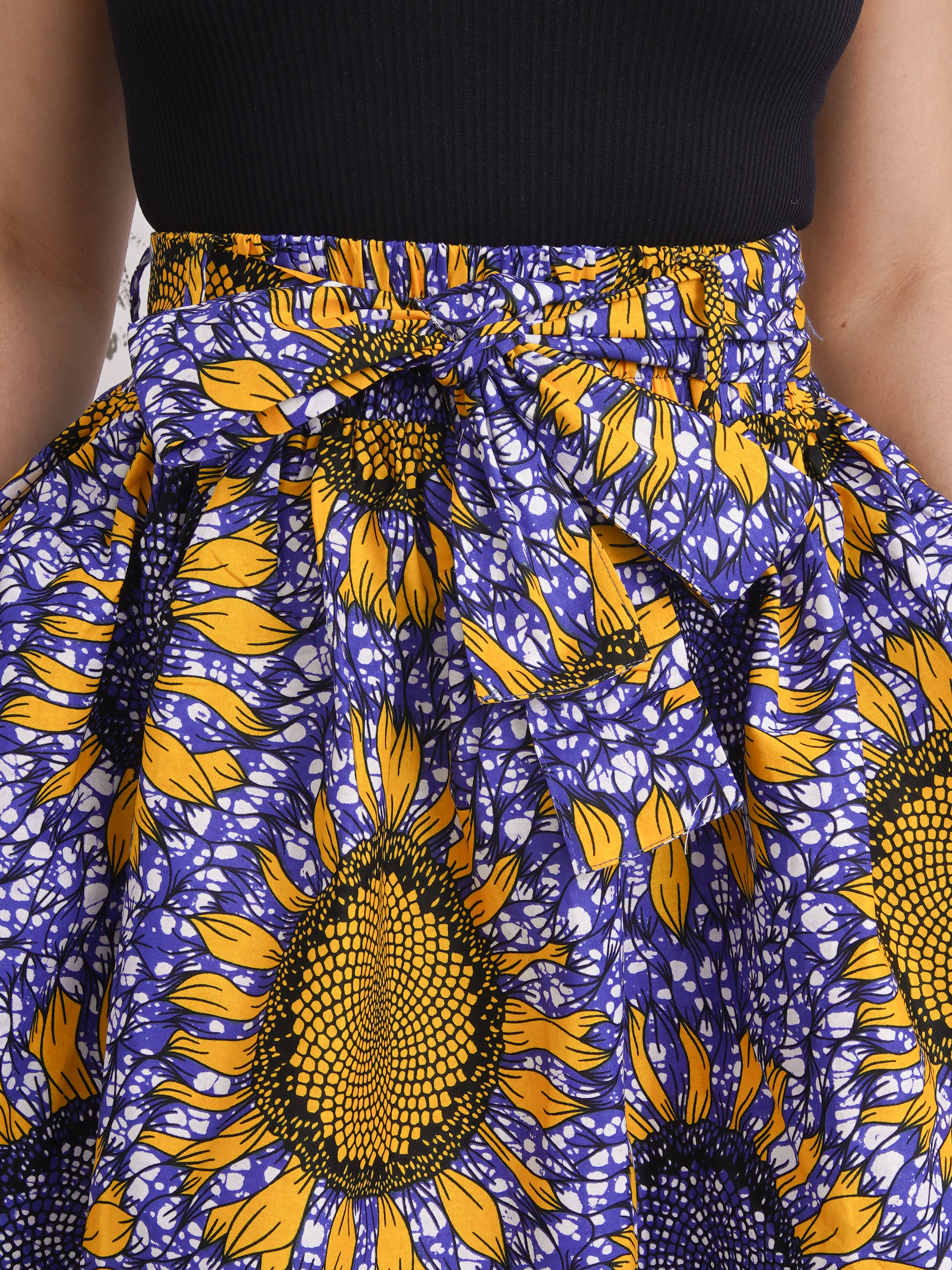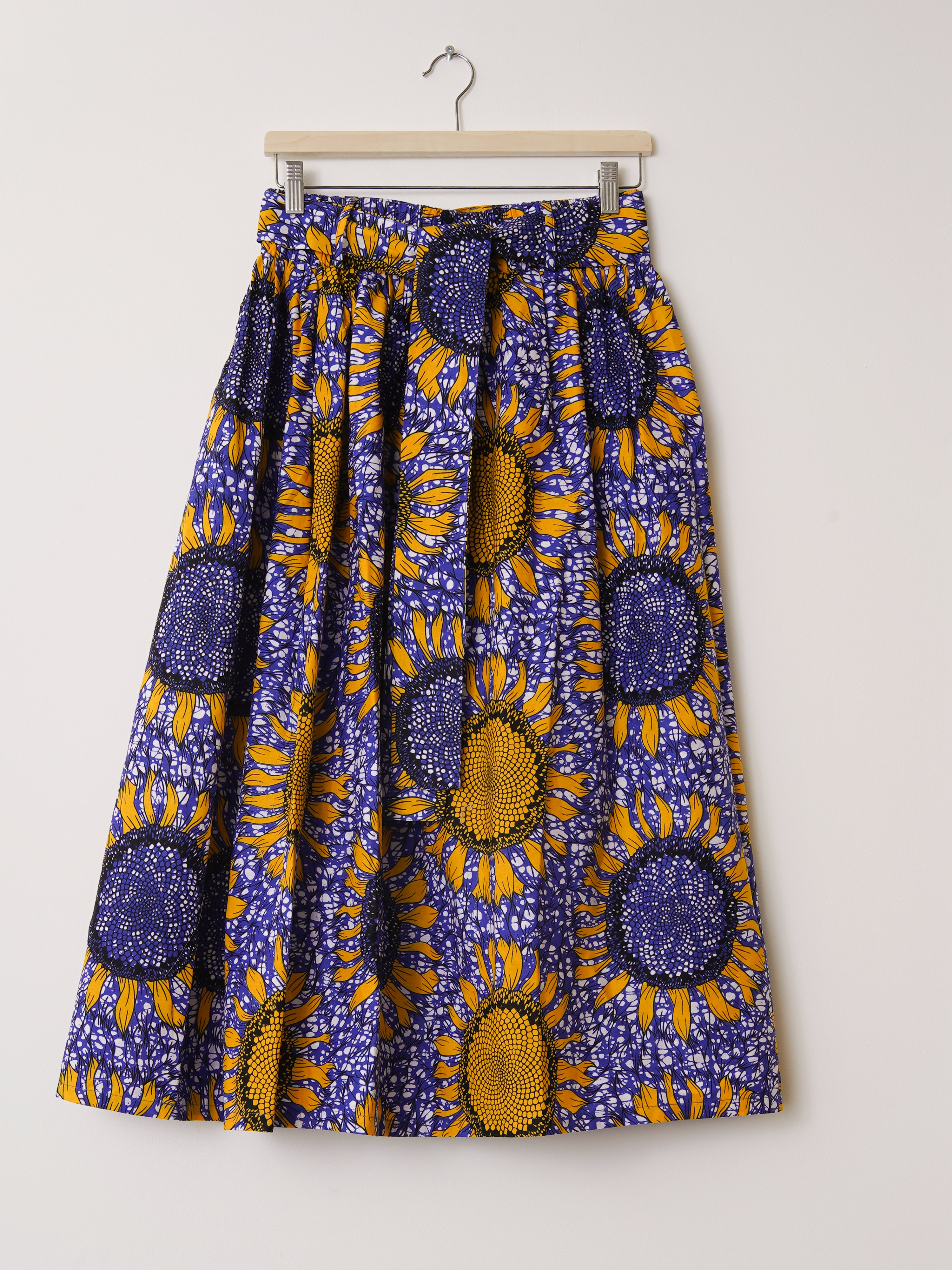 The Amelie Cotton Midi Skirt is crafted from Dutch wax cotton—bold in print, crisp in feel, and beautifully sculpted. Its gathered silhouette holds its shape and the elasticated waistband ensures comfort, while a matching belt allows for waist definition when you want it. Belt loops and deep side pockets add useful touches.