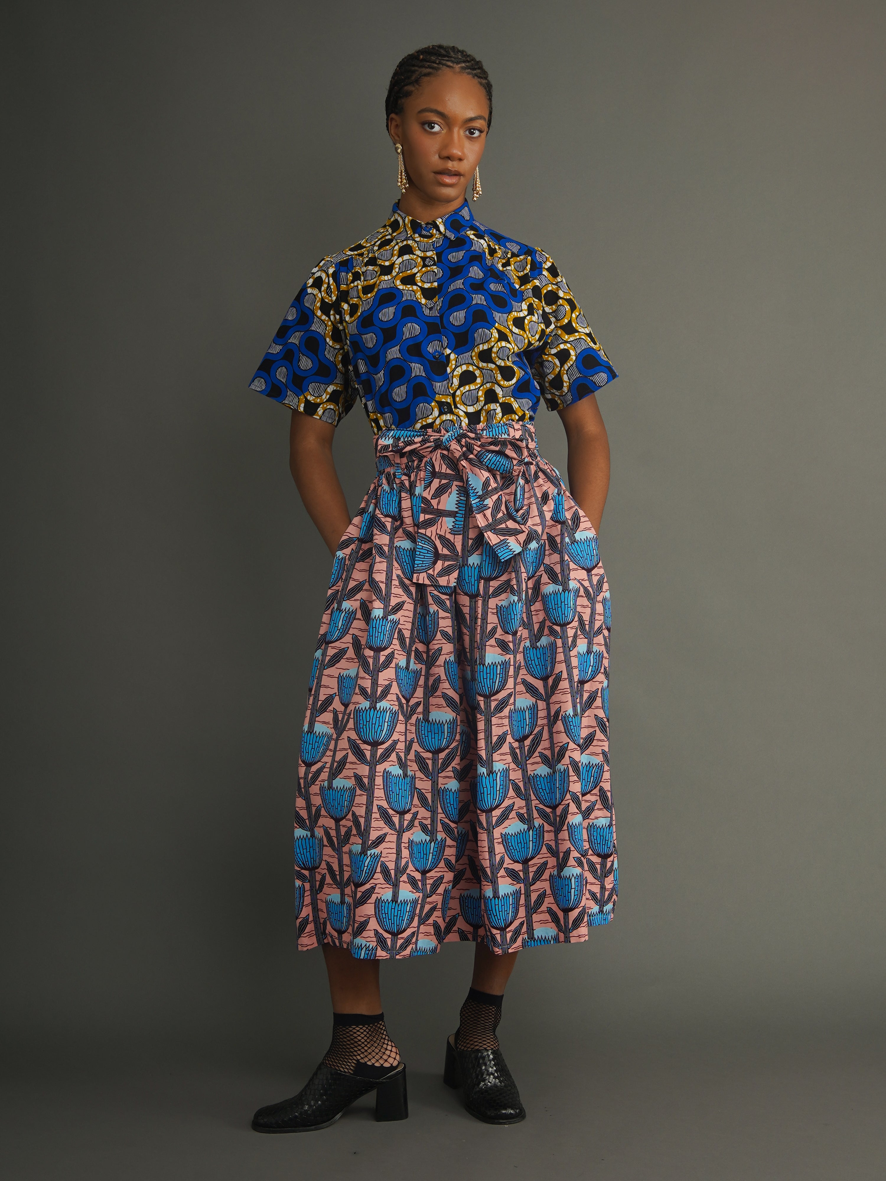 The Cuban Volume Midi Skirt is cut from structured Dutch wax cotton; designed to hold its shape and bring volume. The elasticated band sits comfortably on the body and comes with a matching belt and includes side pockets.