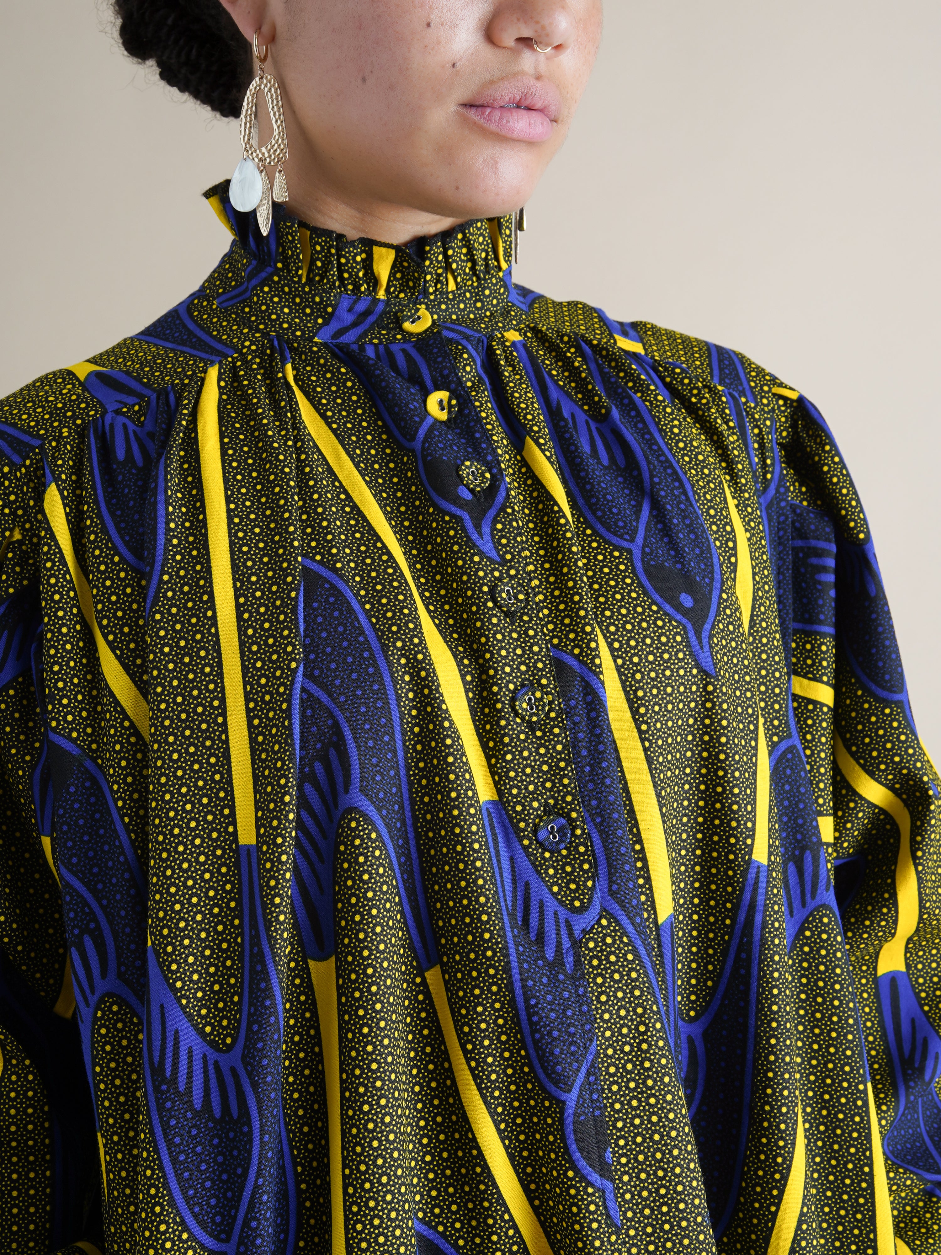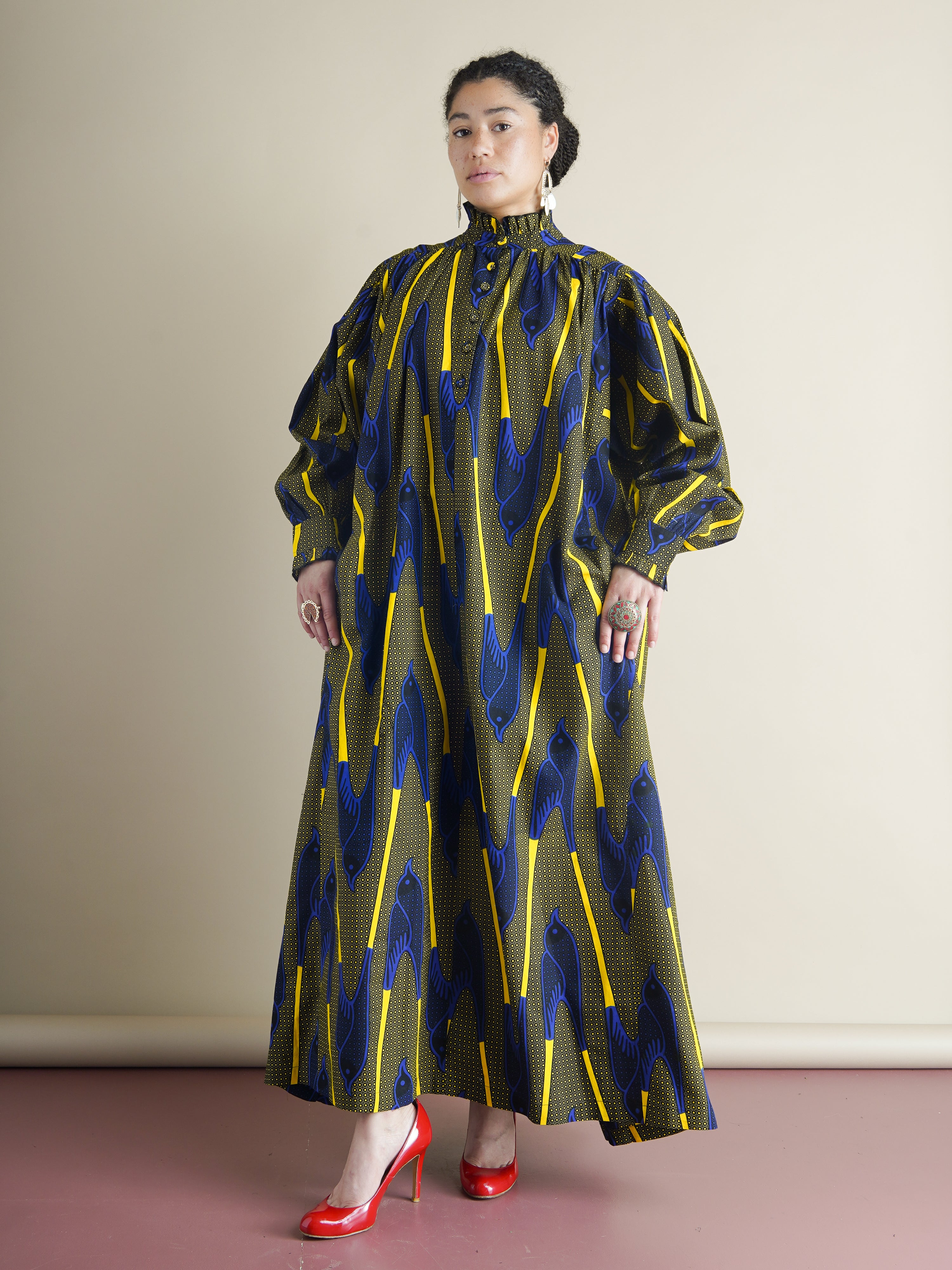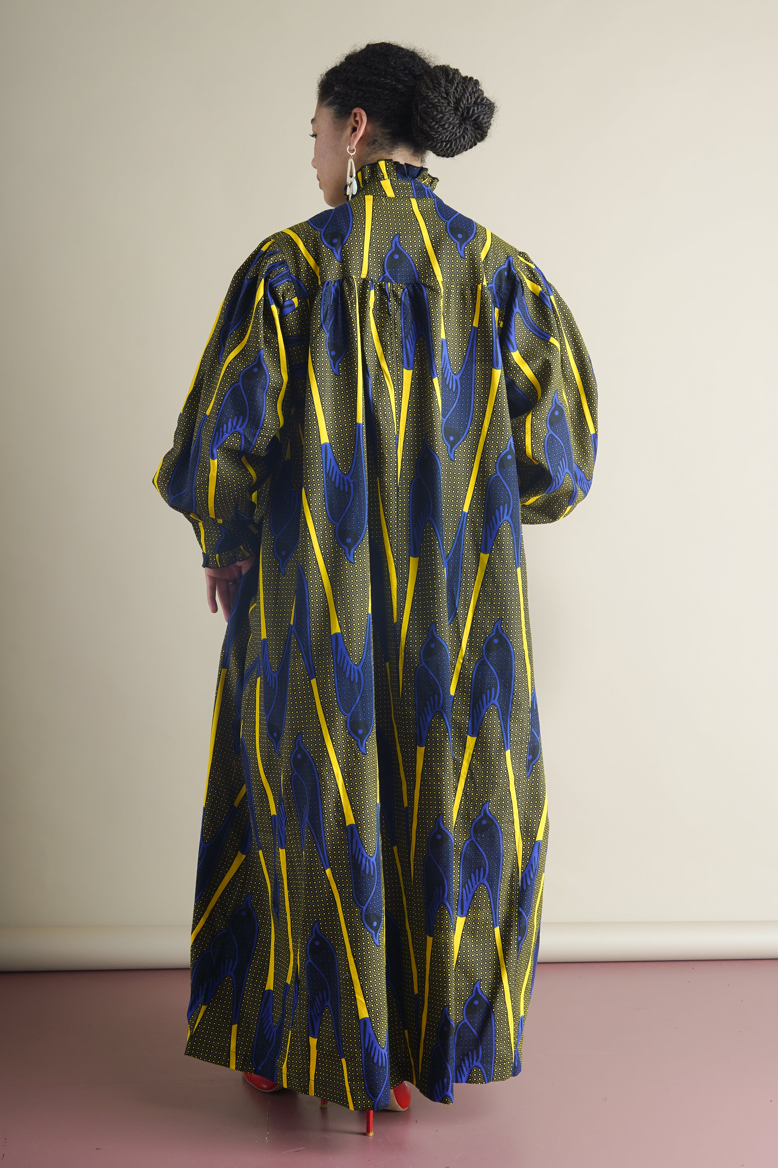Crafted from 100% mid-weight Dutch wax cotton, this one-of-a-kind piece blends sculptural shape with everyday ease. The vibrant cloth gives structure, allowing the voluminous silhouette to hold its form while still moving with you.