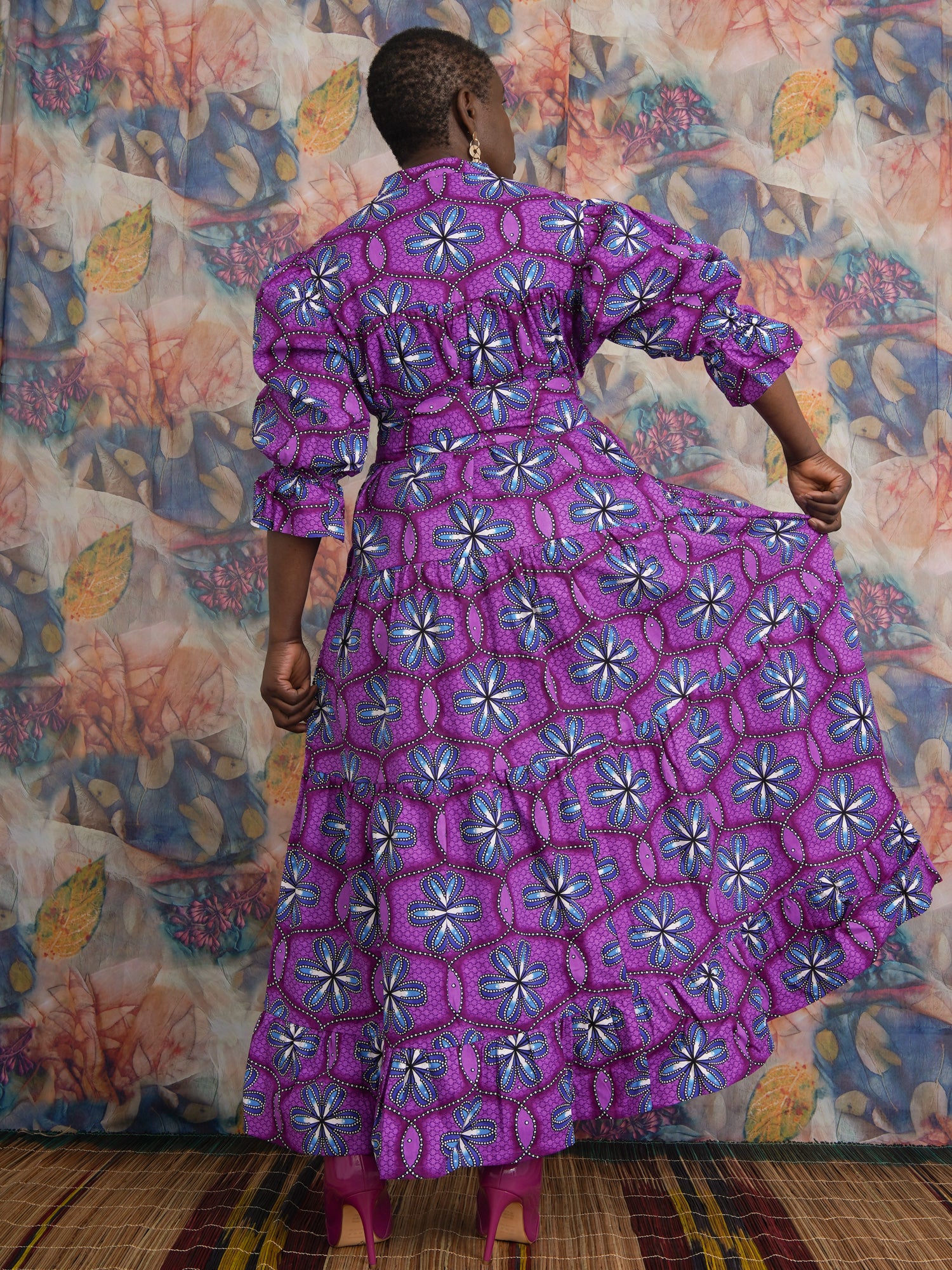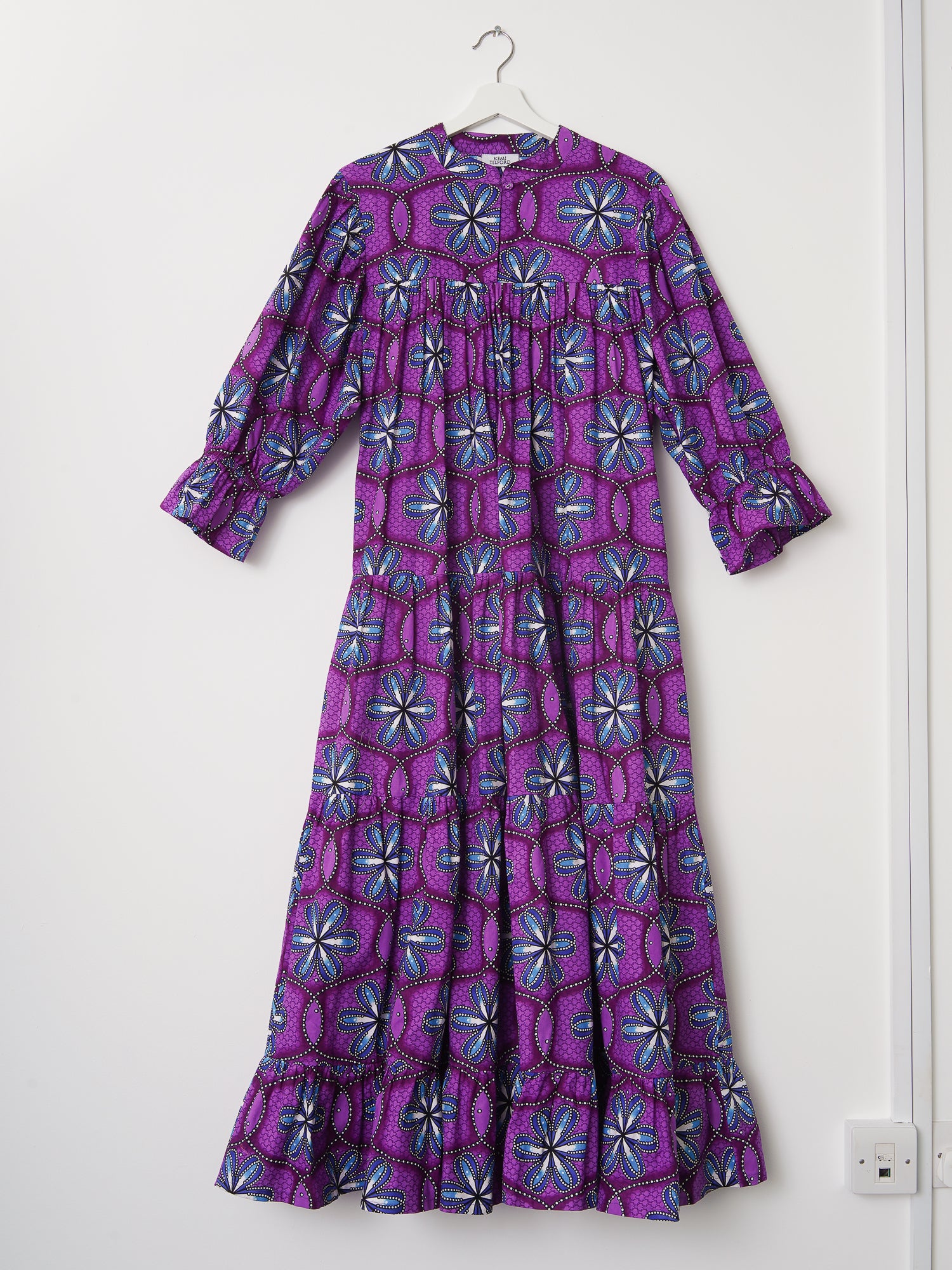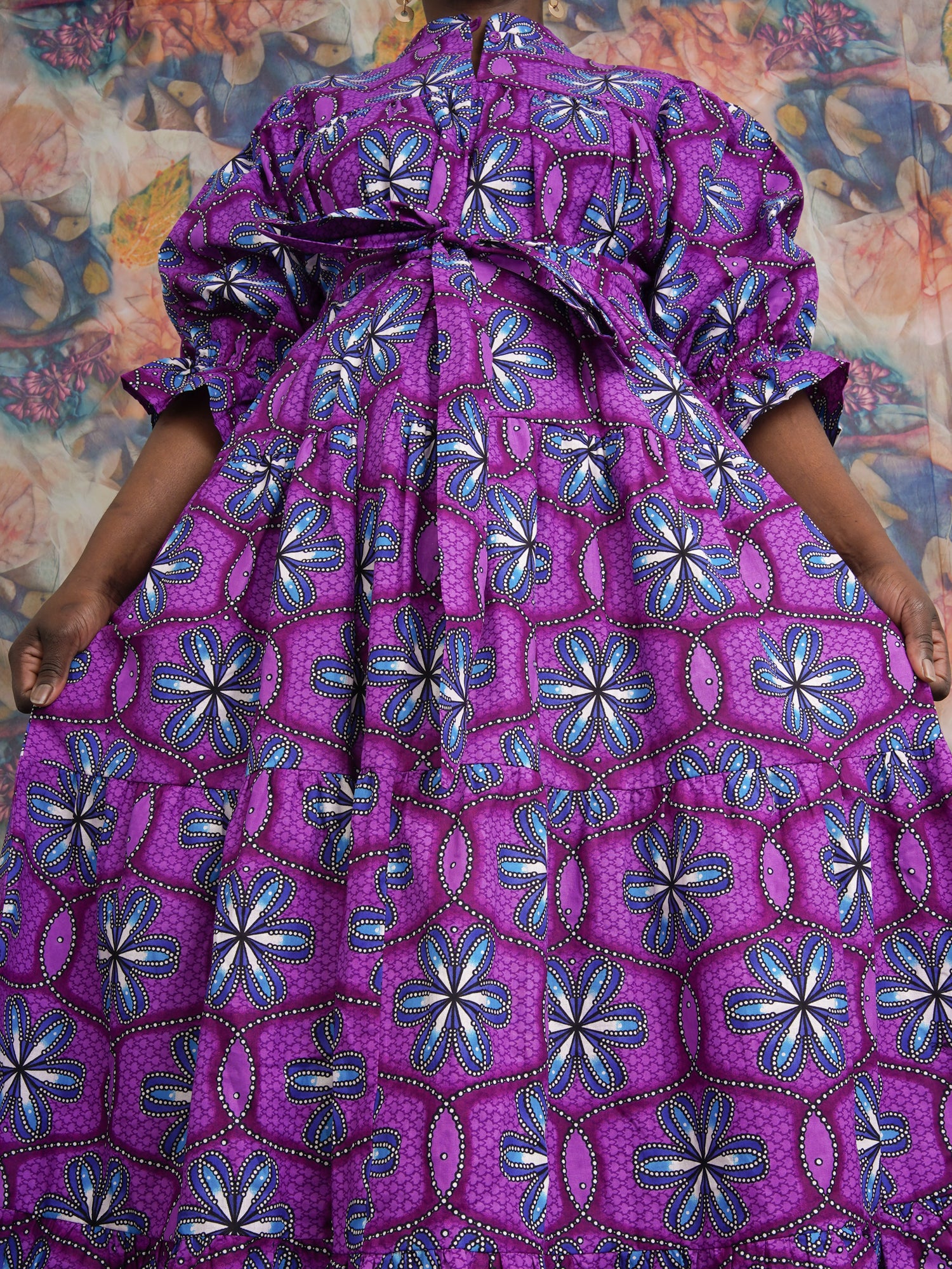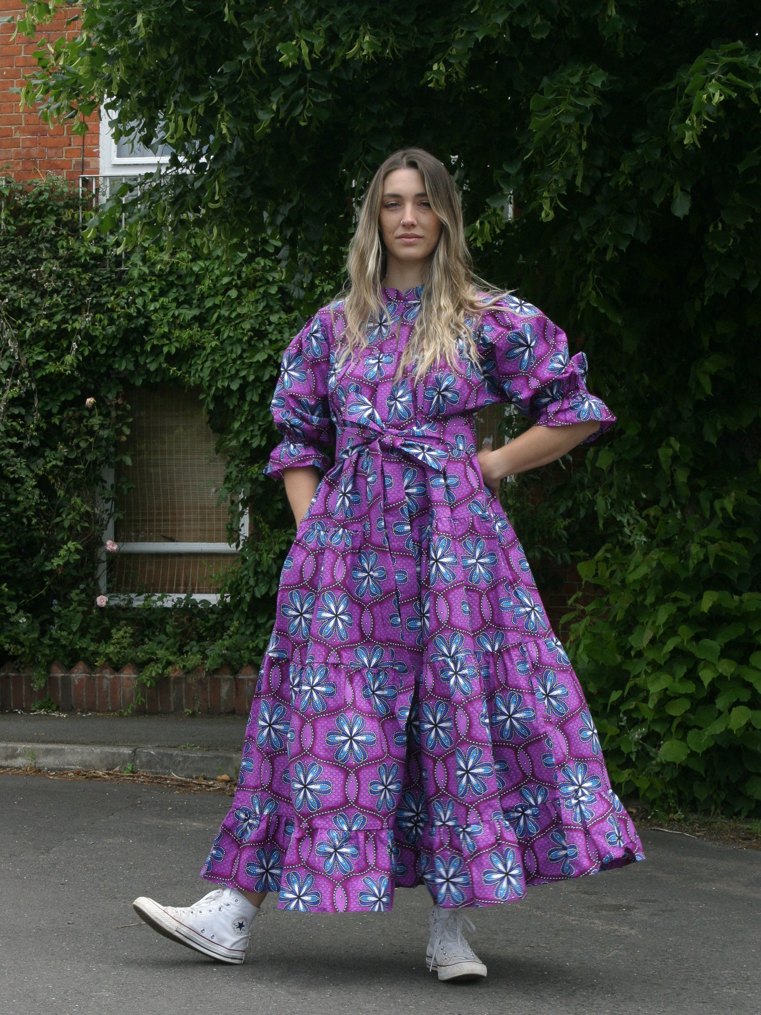The Edwina Maxi Dress is an oversized design with puff sleeves made from 100% cotton. The dress has a mandarin collar, voluminous sleeves, and comes with a belt to clinched waist.