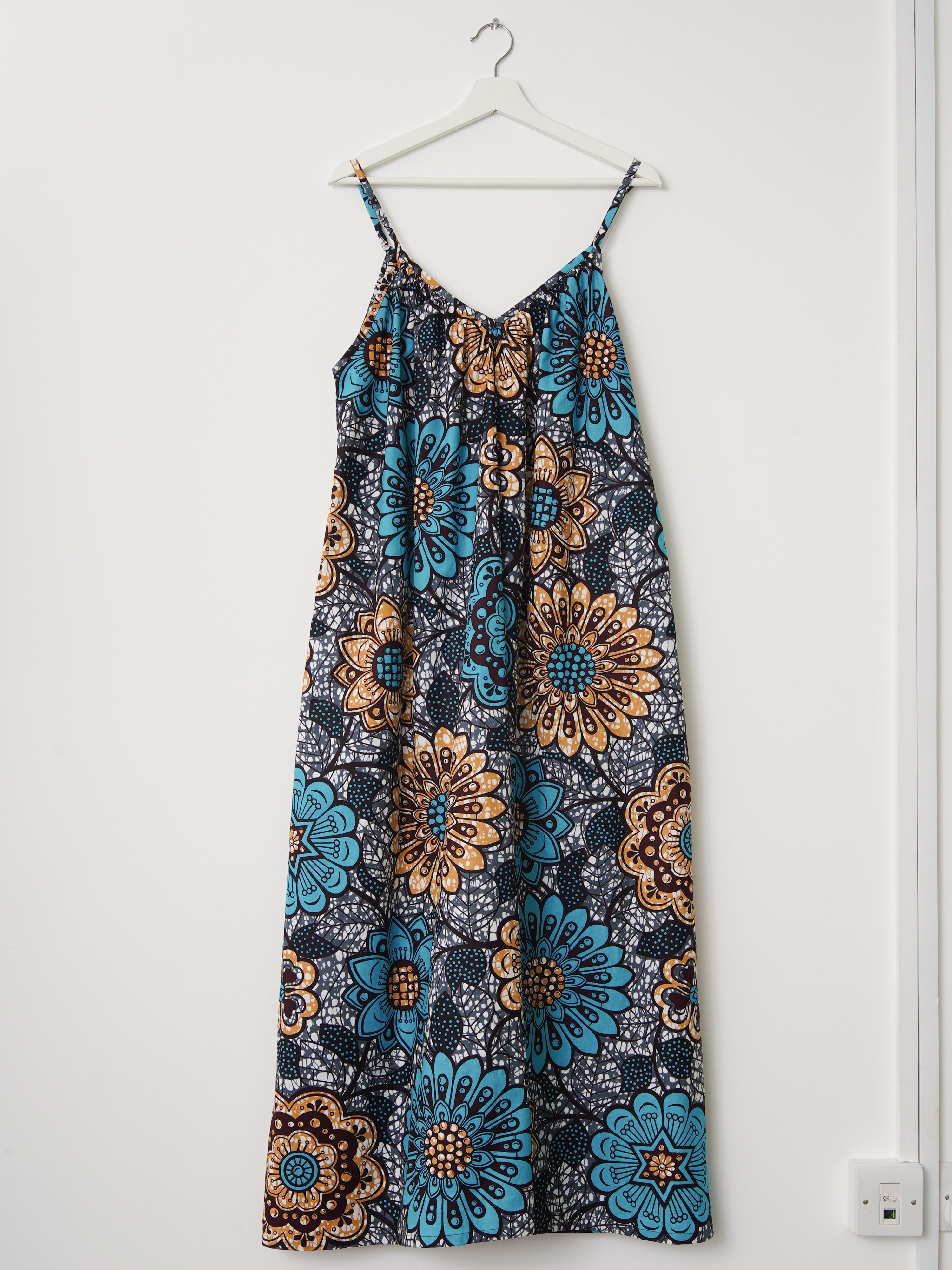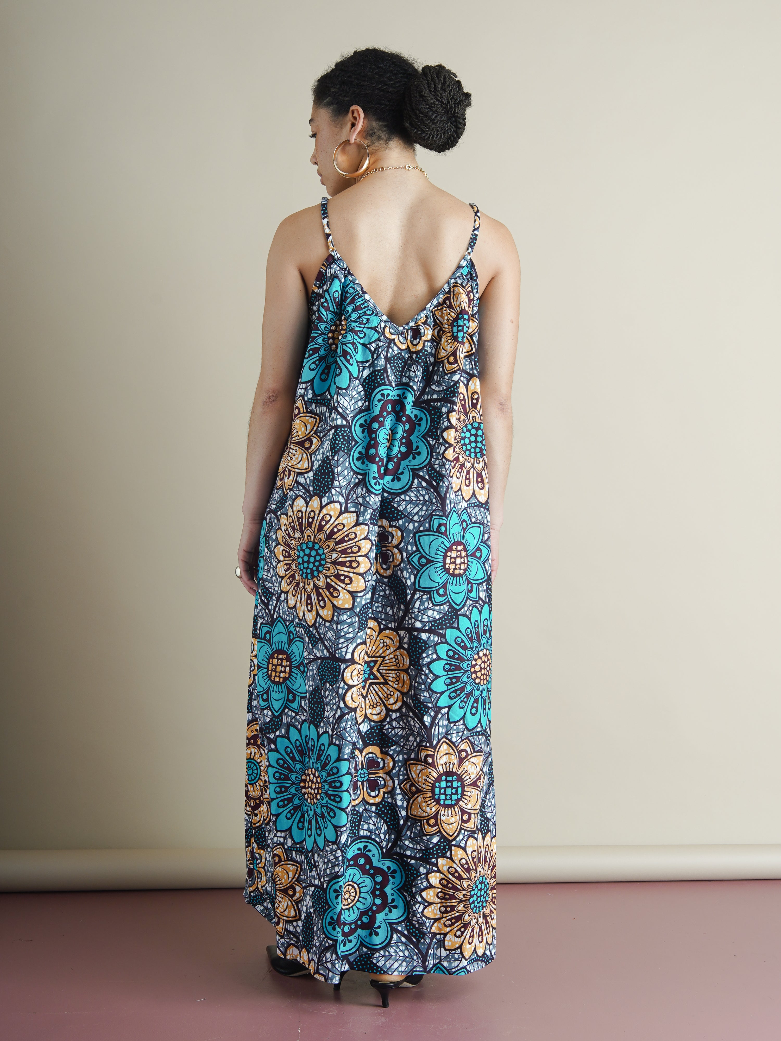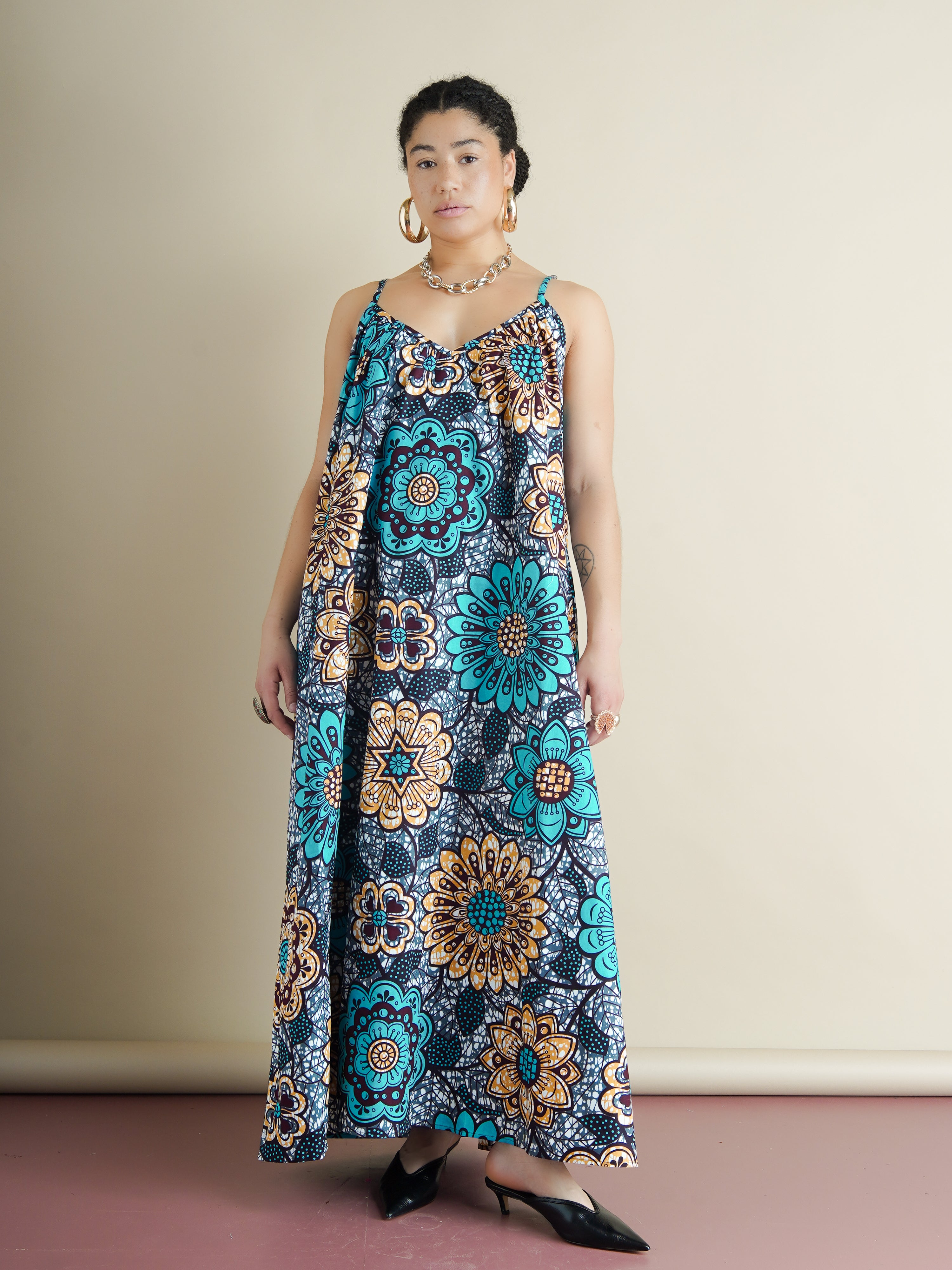 Crafted from 100% screen-printed cotton, the Ella Slip Dress is a statement in ease and bold design. Its oversized, free-flowing shape is designed to move with the body, offering all-day comfort and breathability. The vivid floral print—rendered in rich blues, warm golds, and deep black—draws from traditional African patterns while feeling entirely modern.