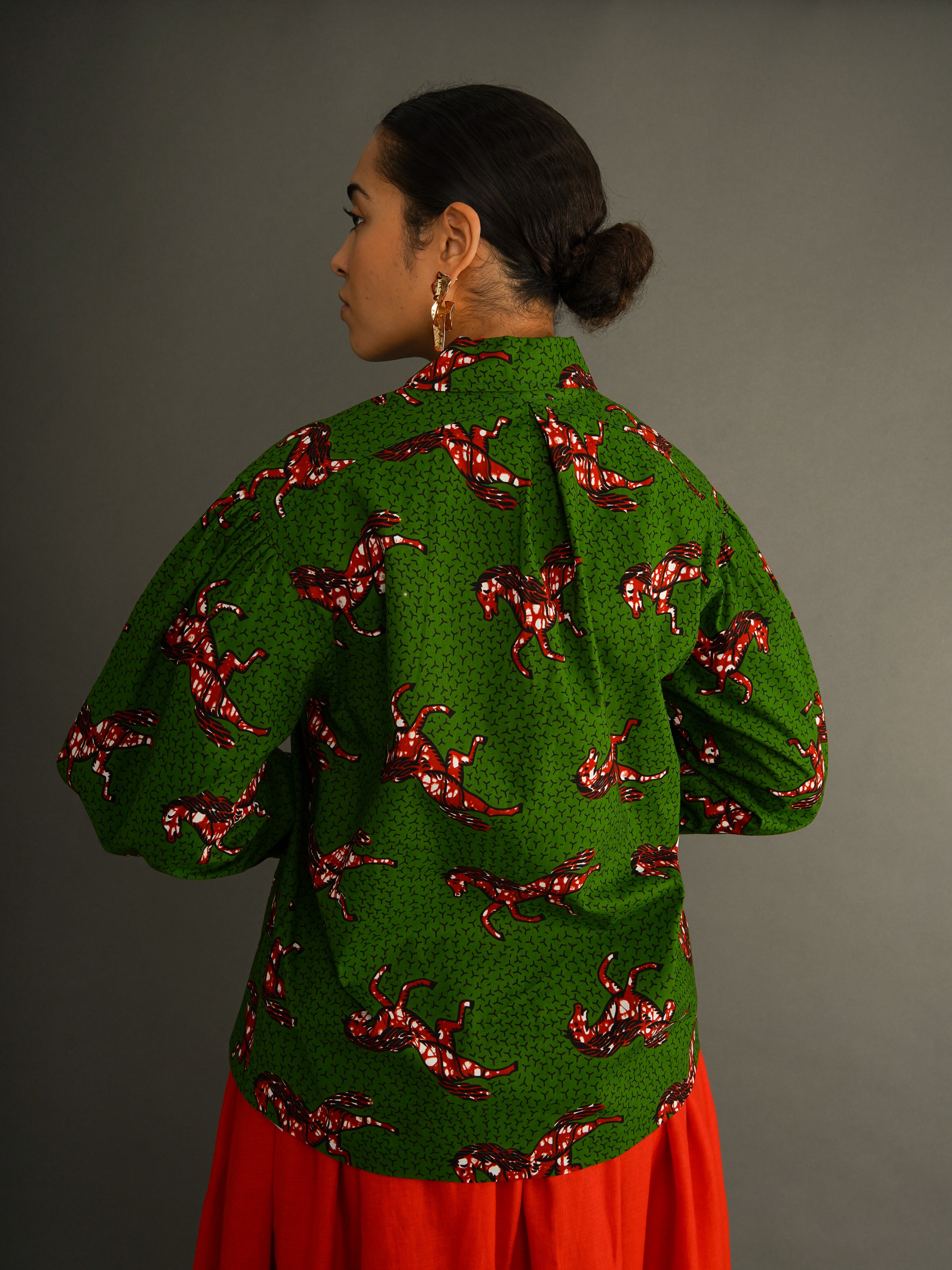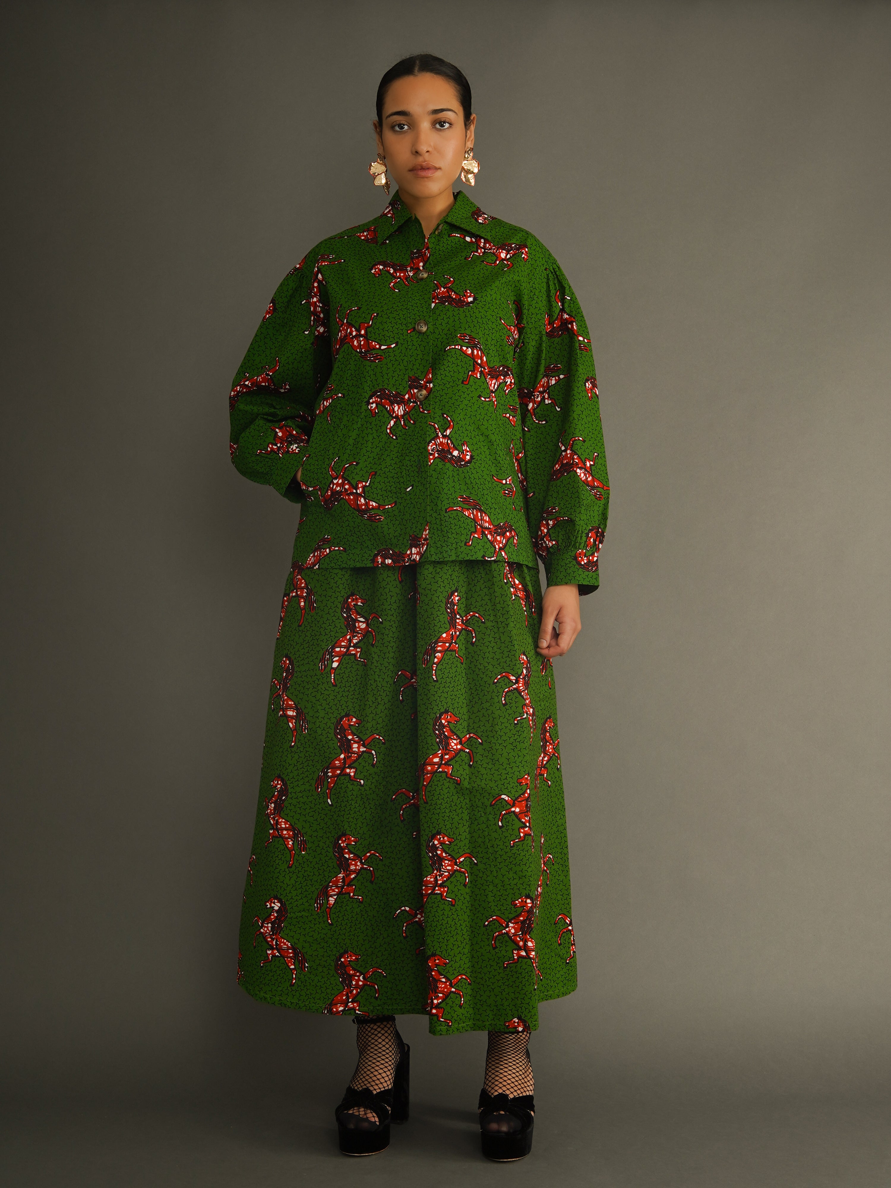 Galloping Horse Oversized Shirt is versatile as jacket or standalone. Pair with matching skirt or jeans. Essential item for any wardrobe. Layer with tank top or bodysuit in colder weather. Perfect for grabbing attention anywhere you go.