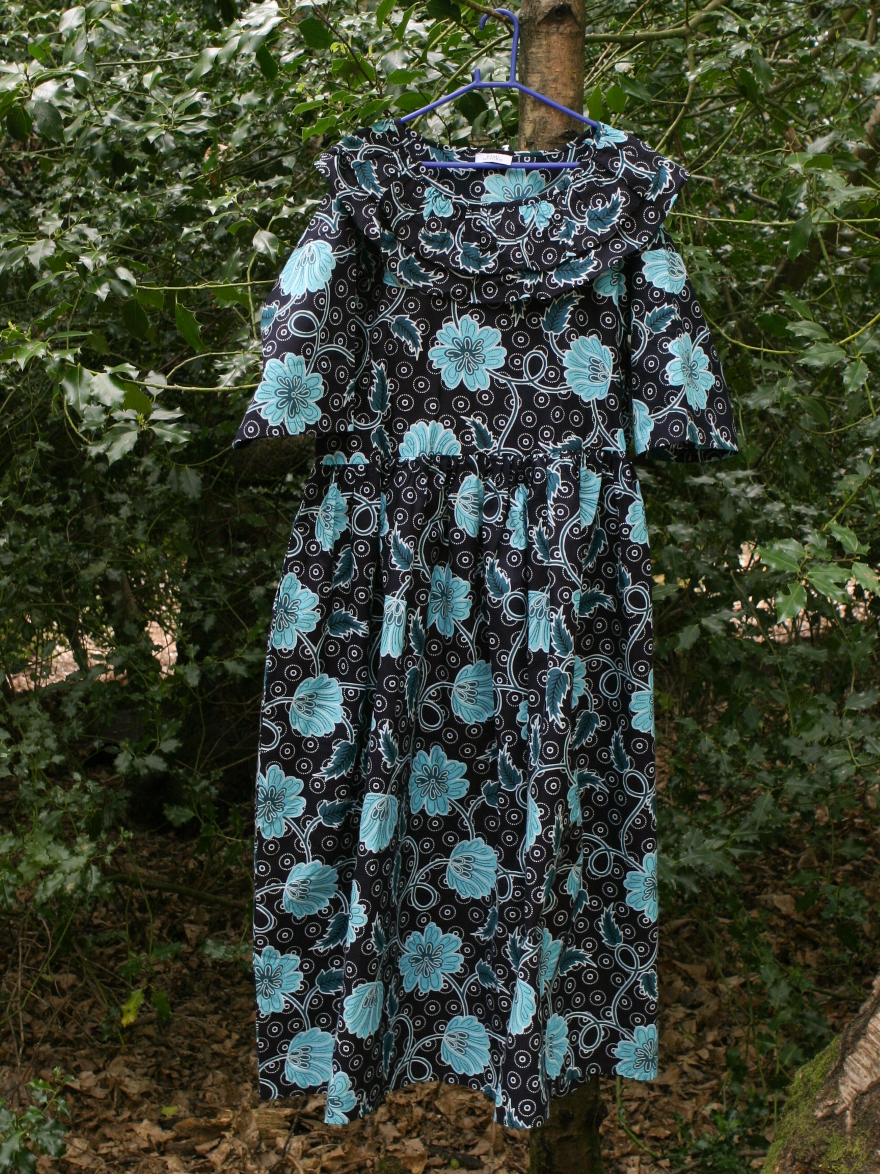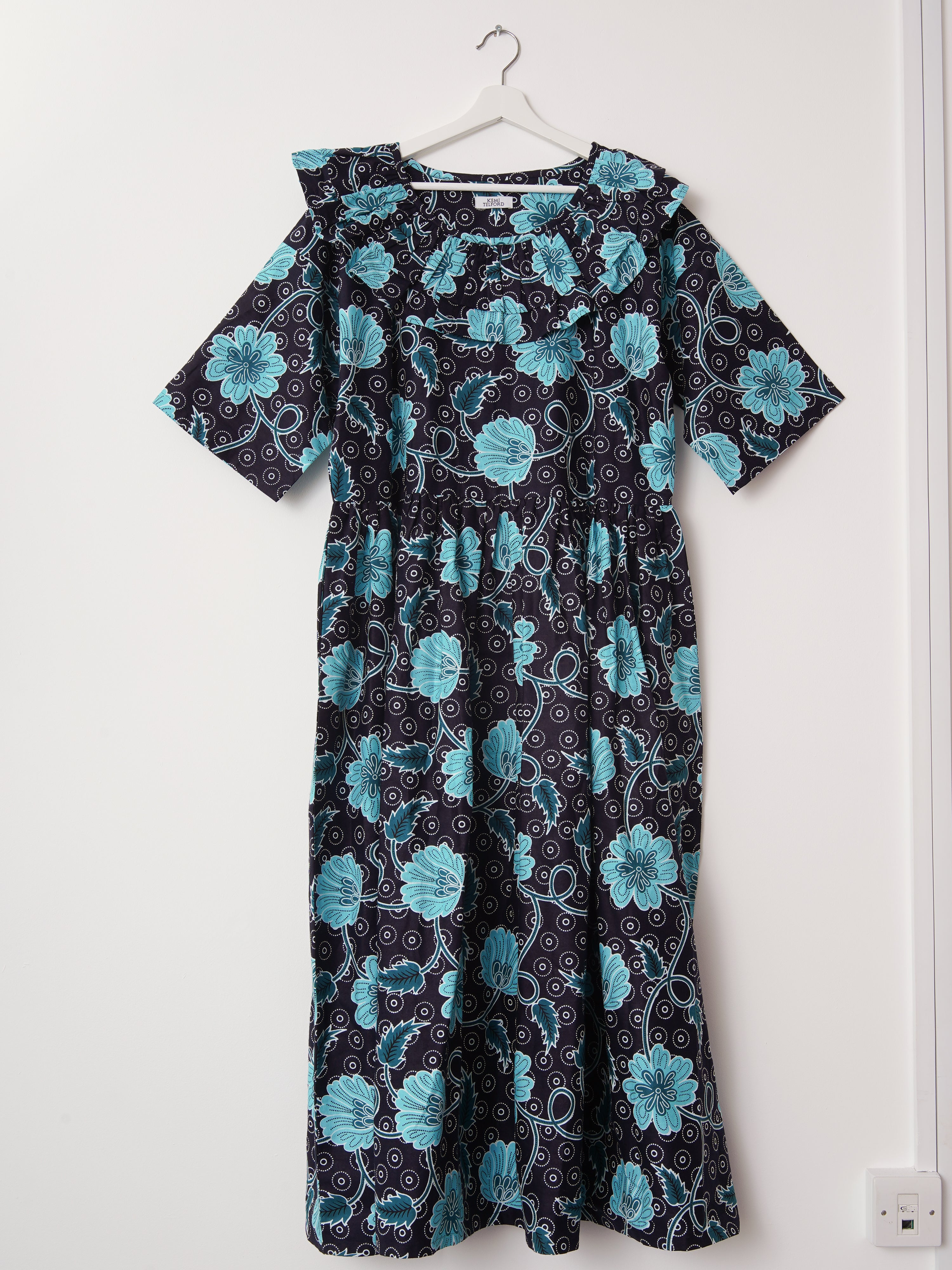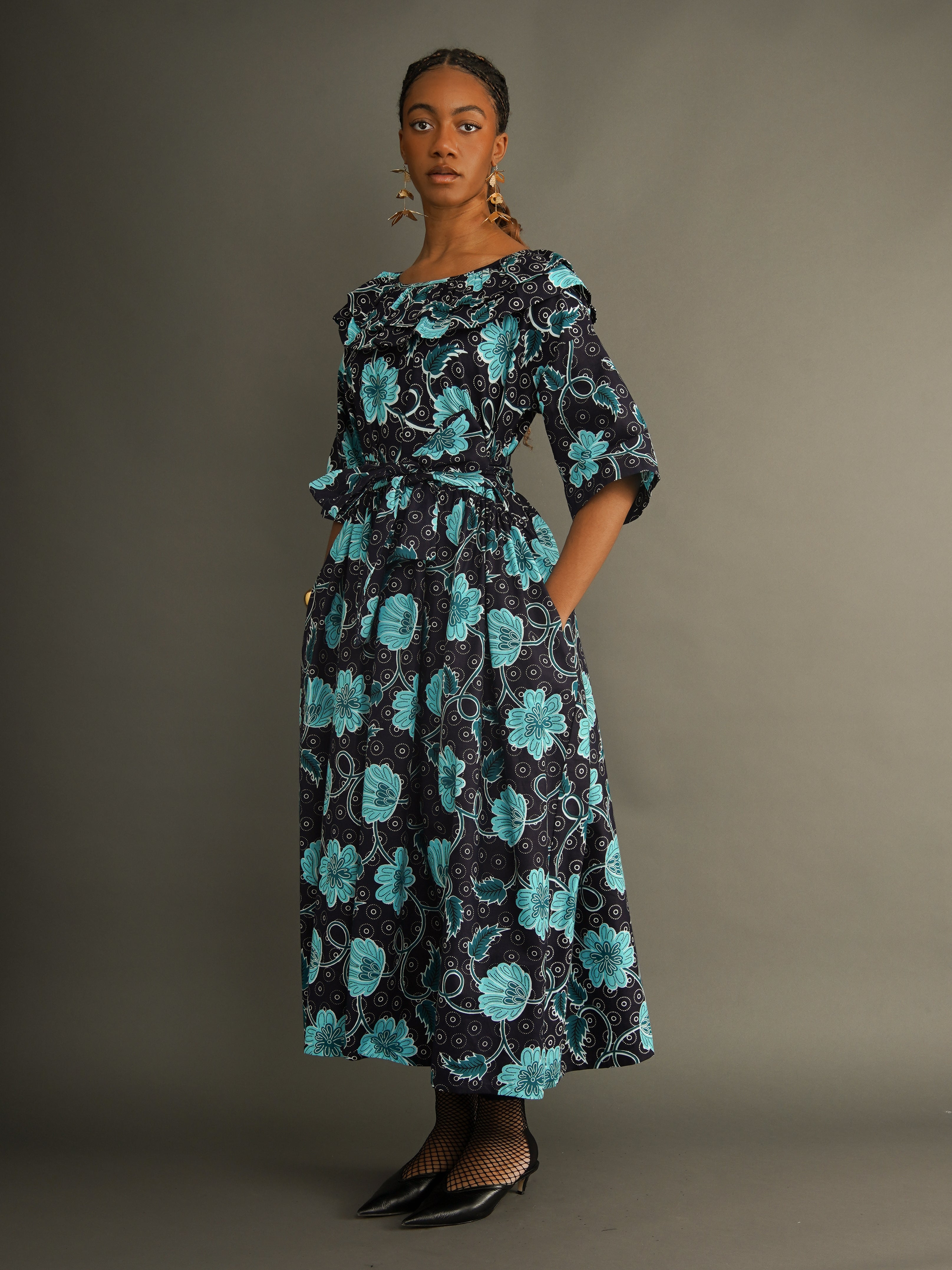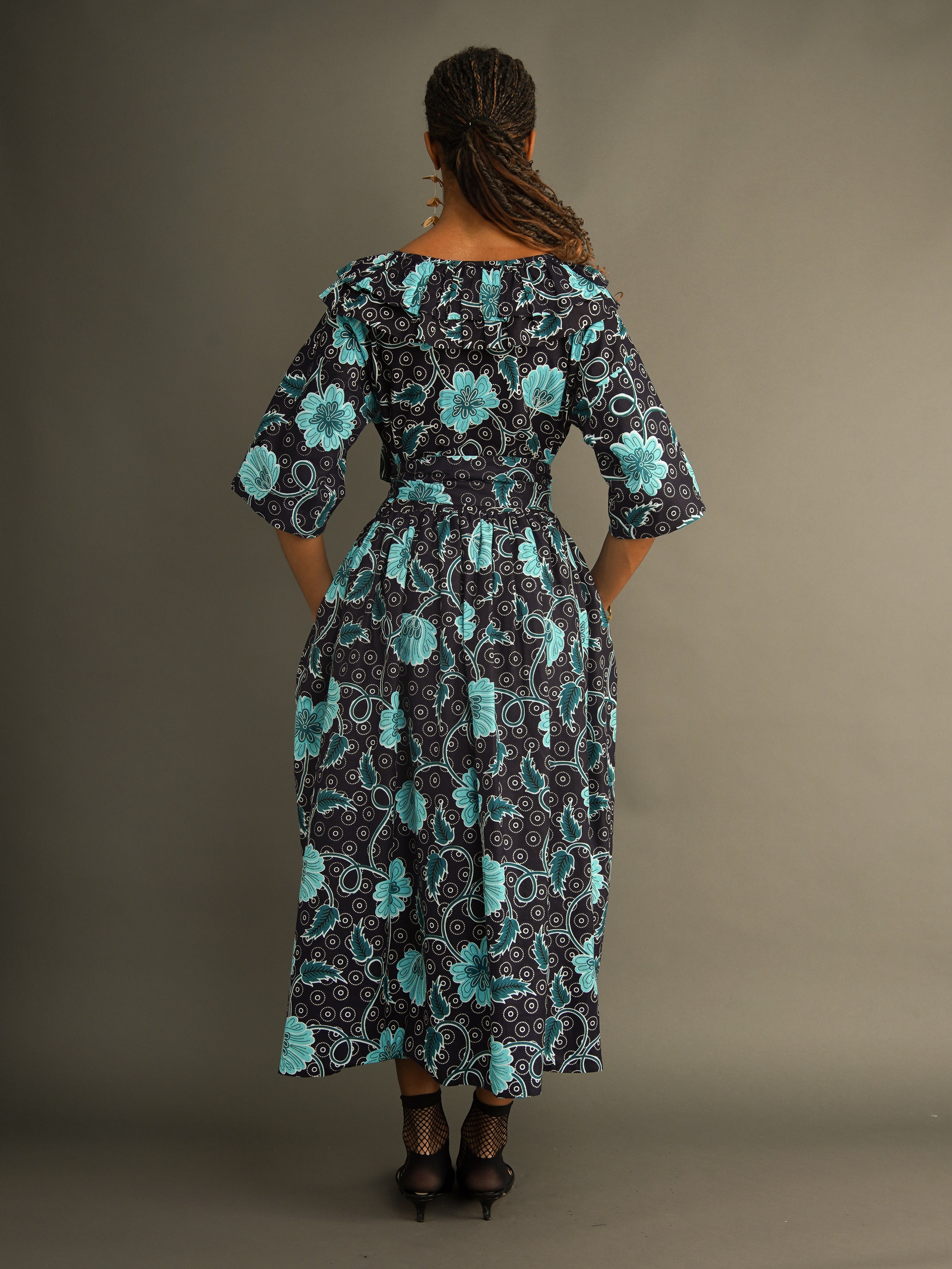 A voluminous, statement-making dress cut from structured Dutch wax cotton. The silhouette is oversized and easy, with a detachable belt to cinch at the waist if desired.