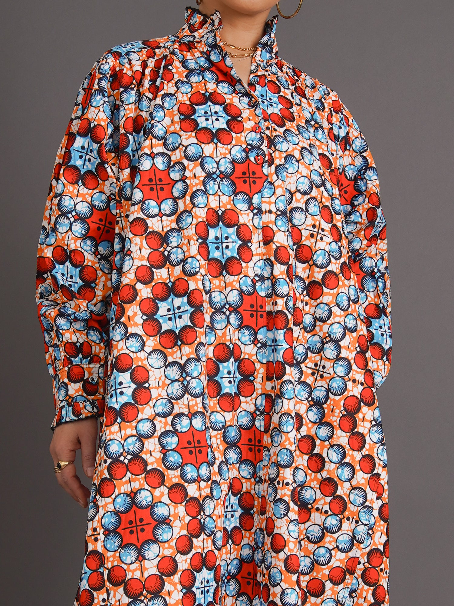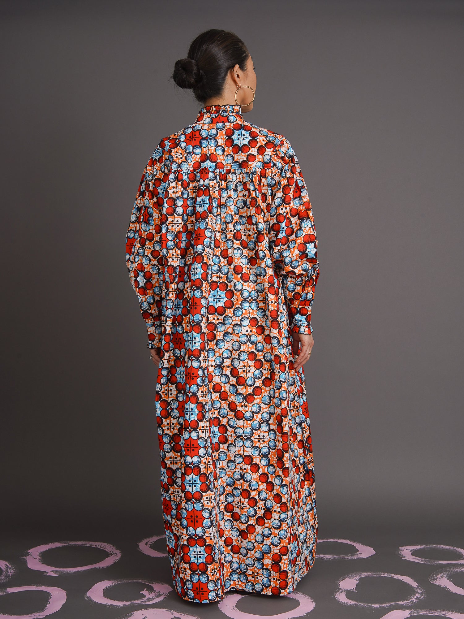 The Limited Edition Anna Balloon-Sleeved Maxi Dress is created out of 100% mid weight cotton. This relaxed and voluminous silhouette has a mandarin collar with mini ruffles, and buttons running from neck to chest. It is long sleeved with frilled button cuffs.