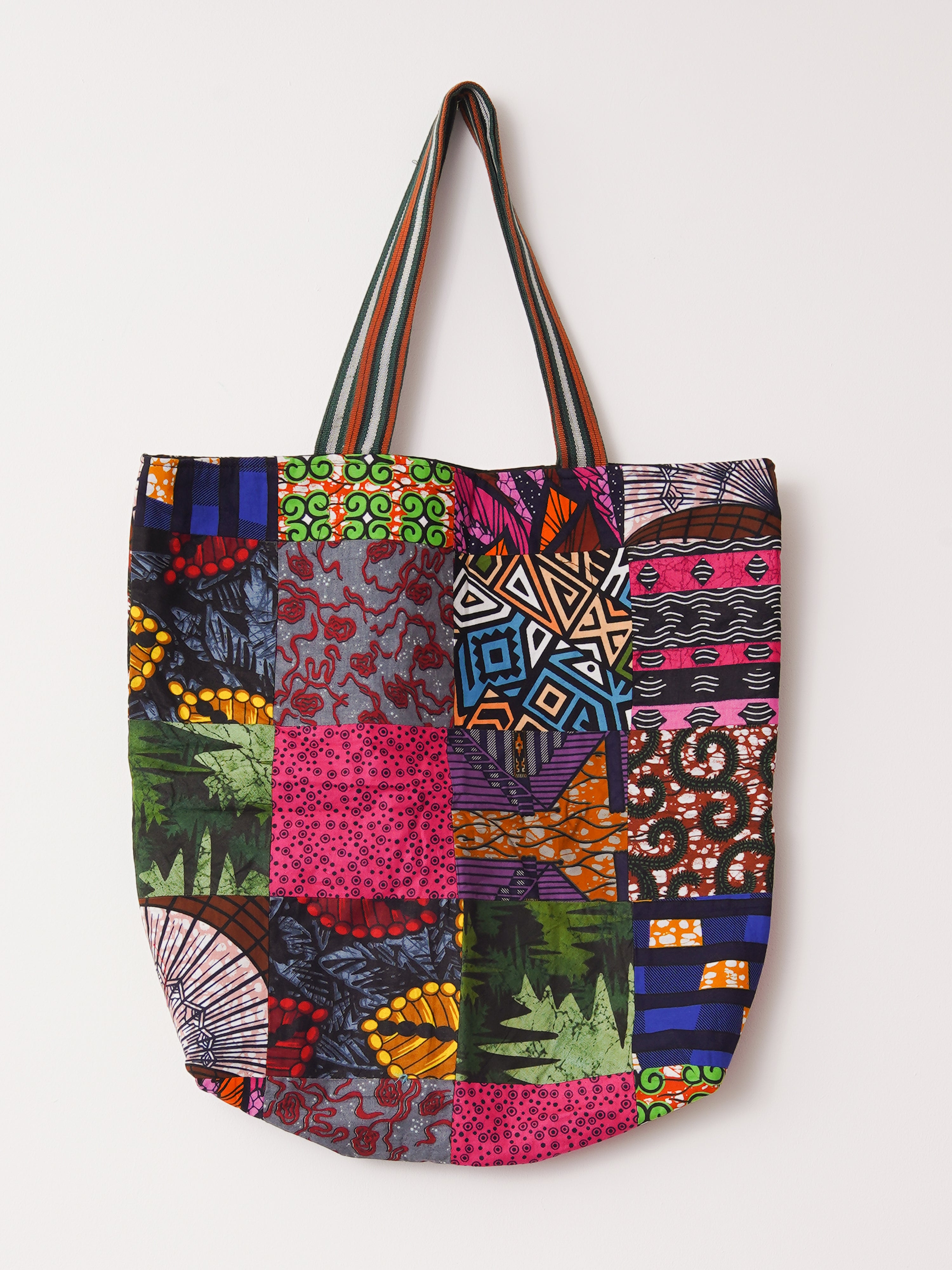 The patches on this bag were selected and hand-stitched by our skilled artisan, Helen. She spent countless hours carefully piecing together the fabric scraps to create a beautiful patchwork design that's both eye-catching and sustainable. No two bags are alike, so you can be sure that yours is a true one-of-a-kind creation.