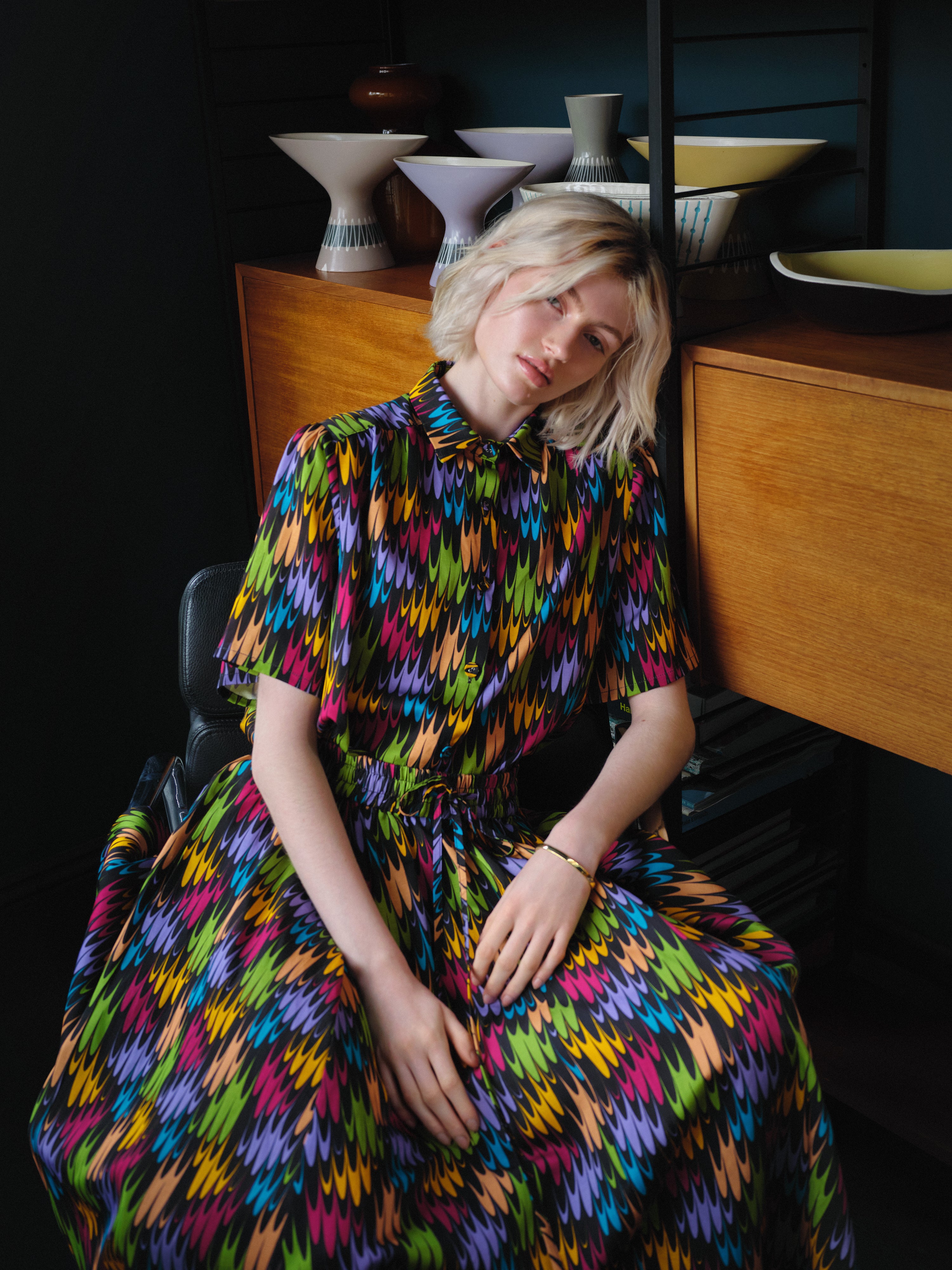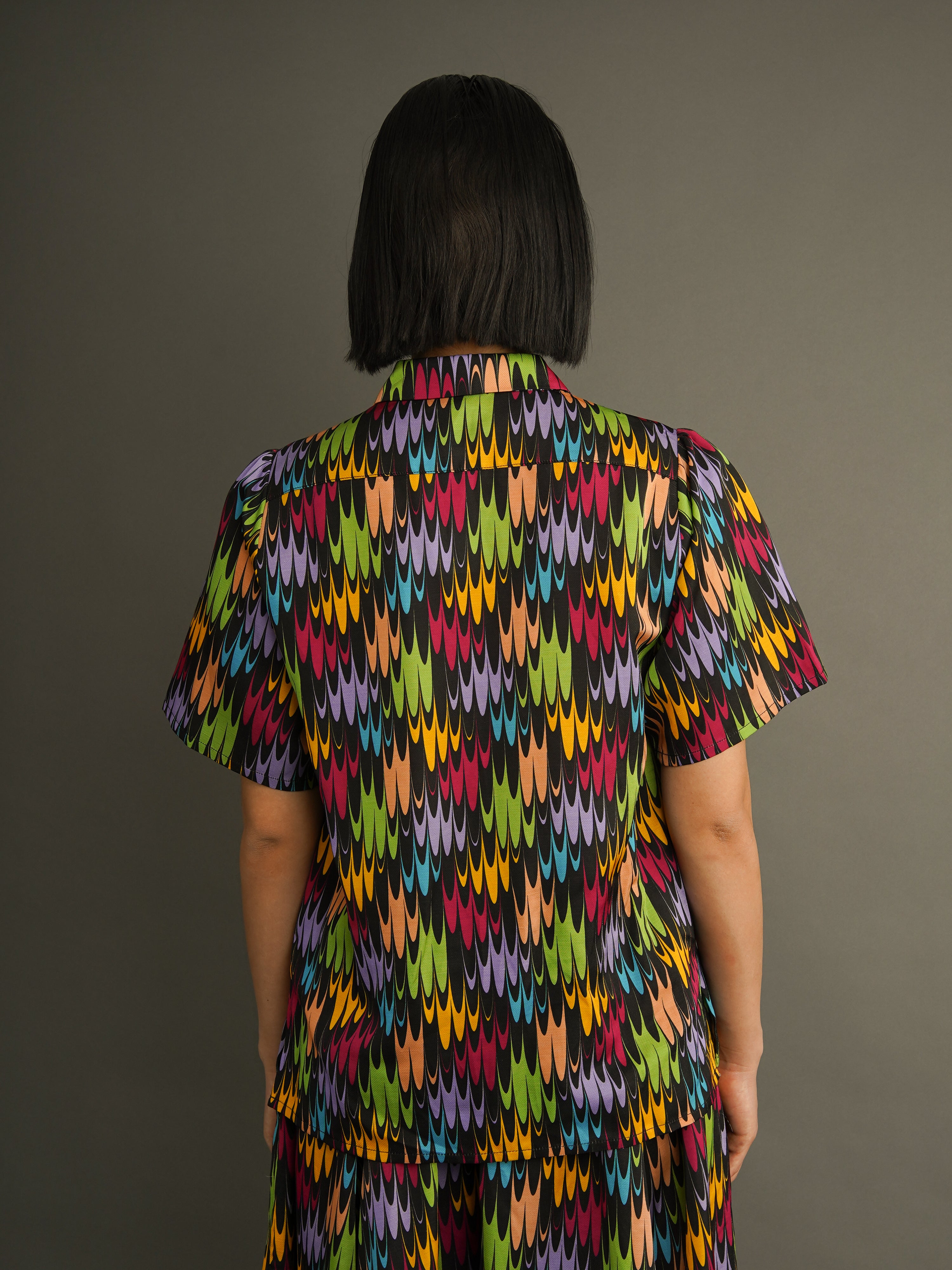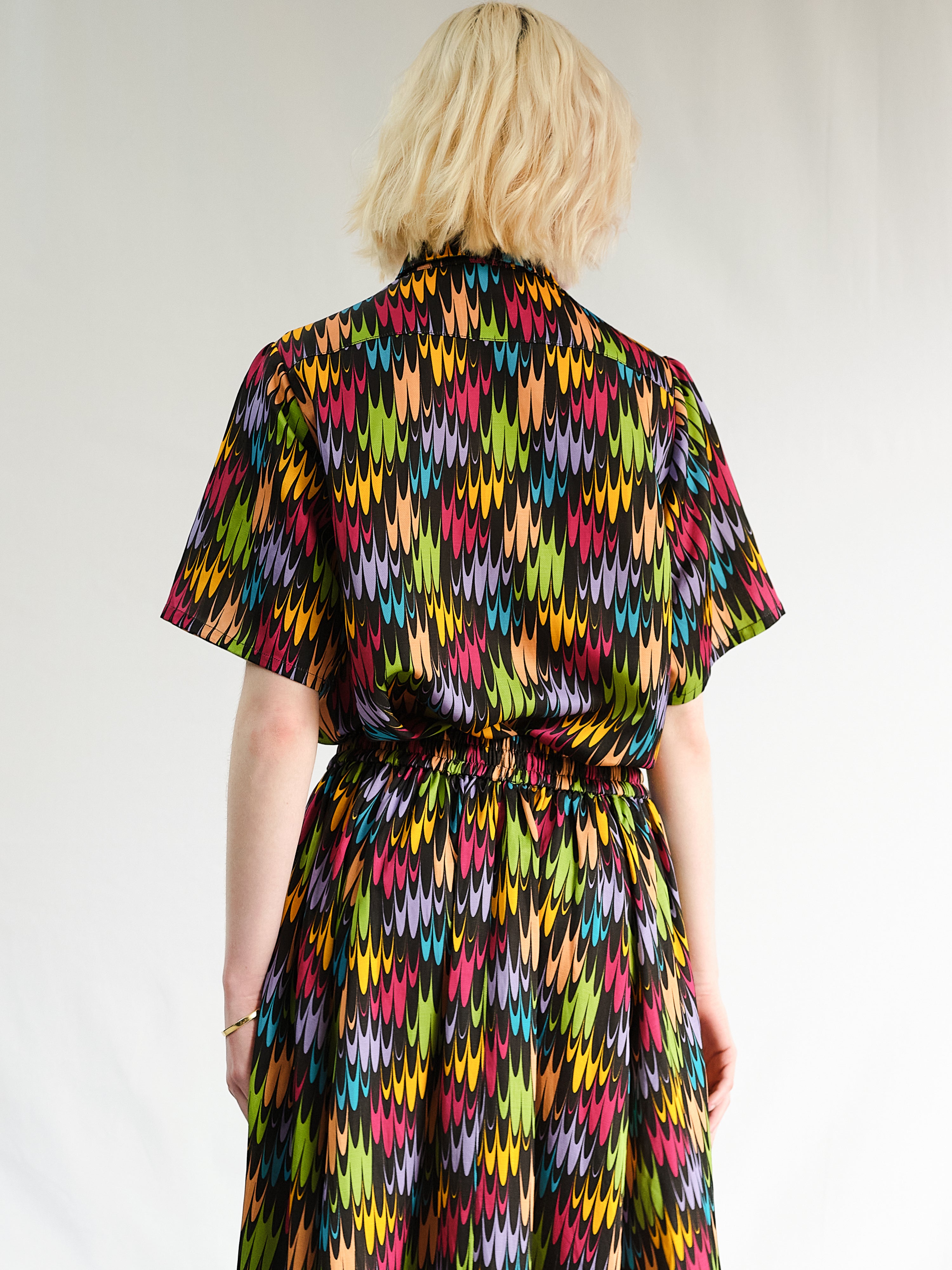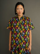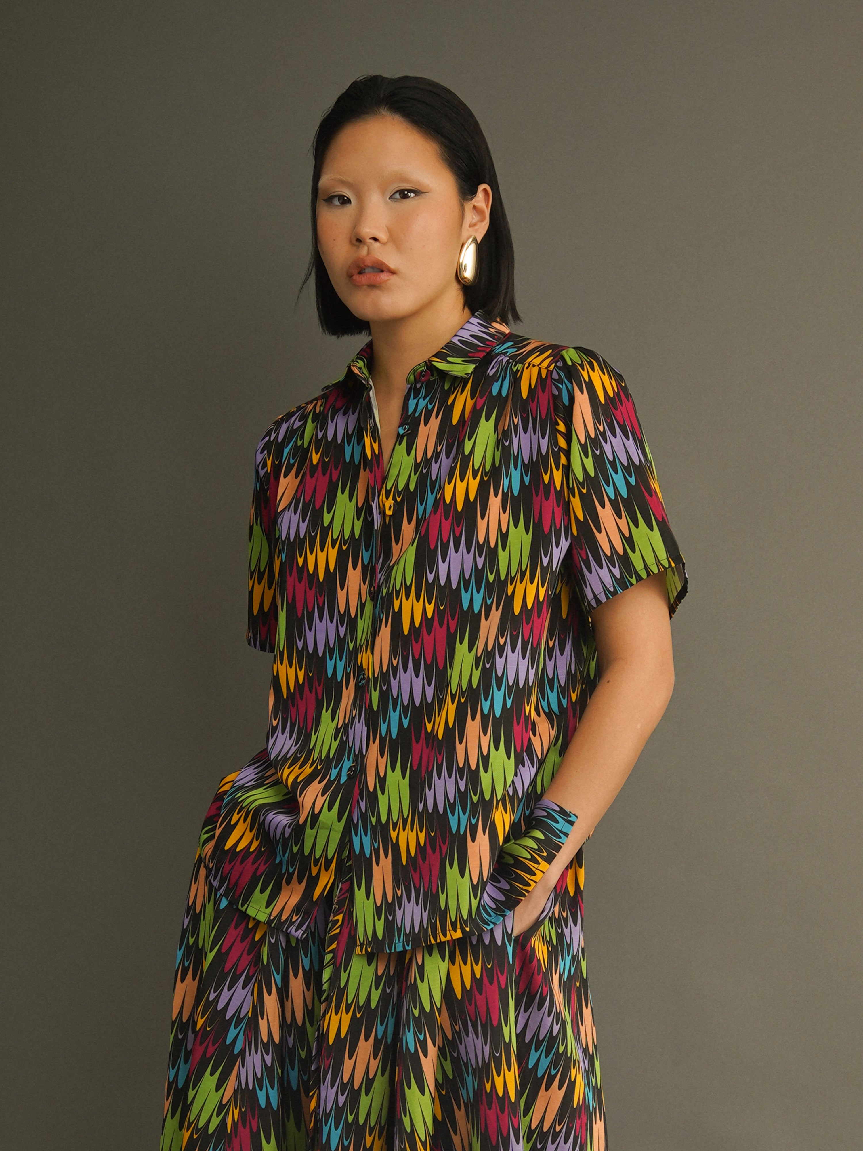 A vintage inspired shirt reimagined in a bold multicolour print. Cut from a soft, breathable blend of rayon, linen, and cotton, it drapes effortlessly with a subtle sheen. The fit is relaxed yet structured, with a pointed collar, button-up front, and tailored short sleeves. Wear it loose, tucked in, or paired with the matching skirt for full impact. Crafted in limited numbers.