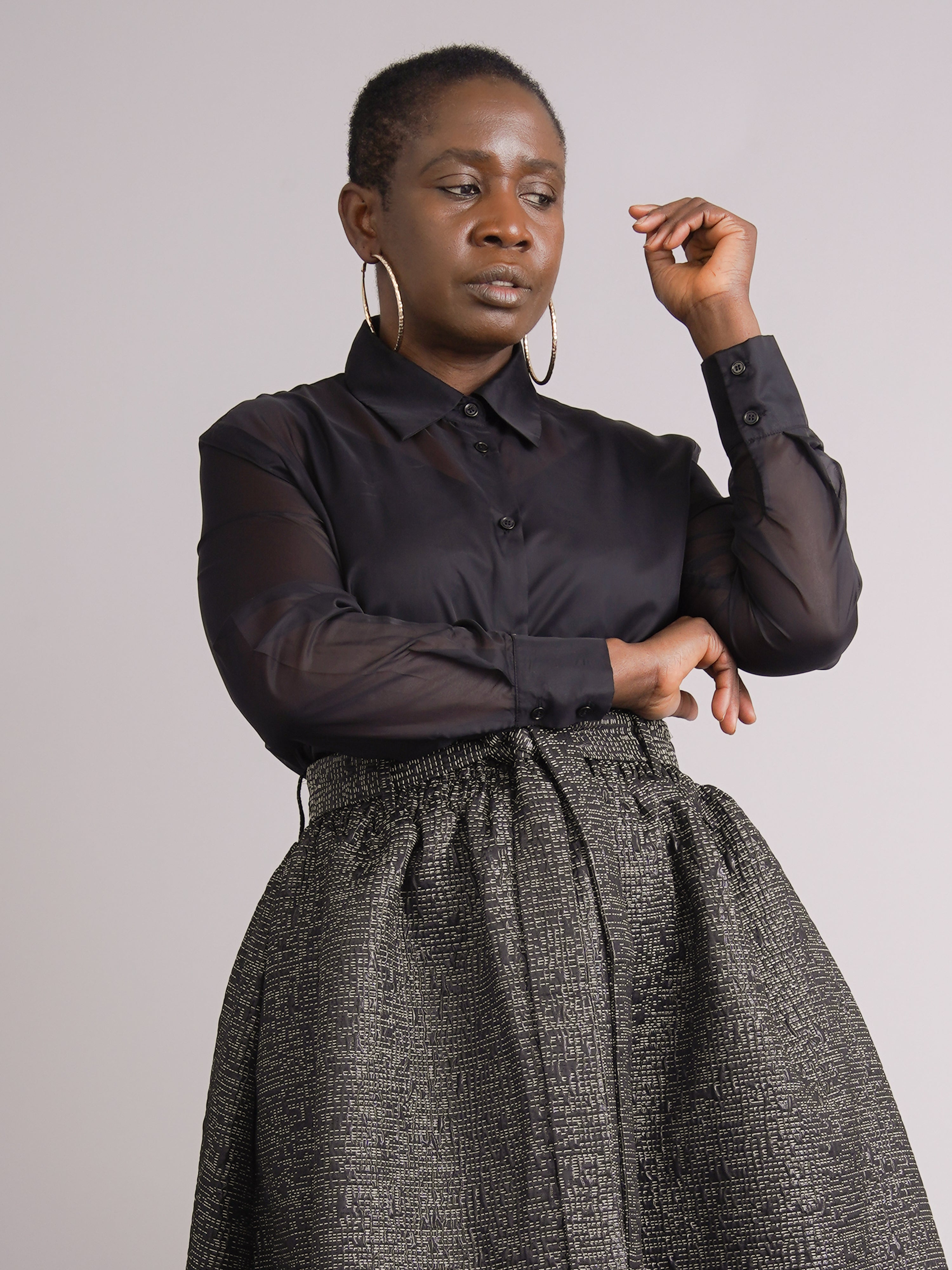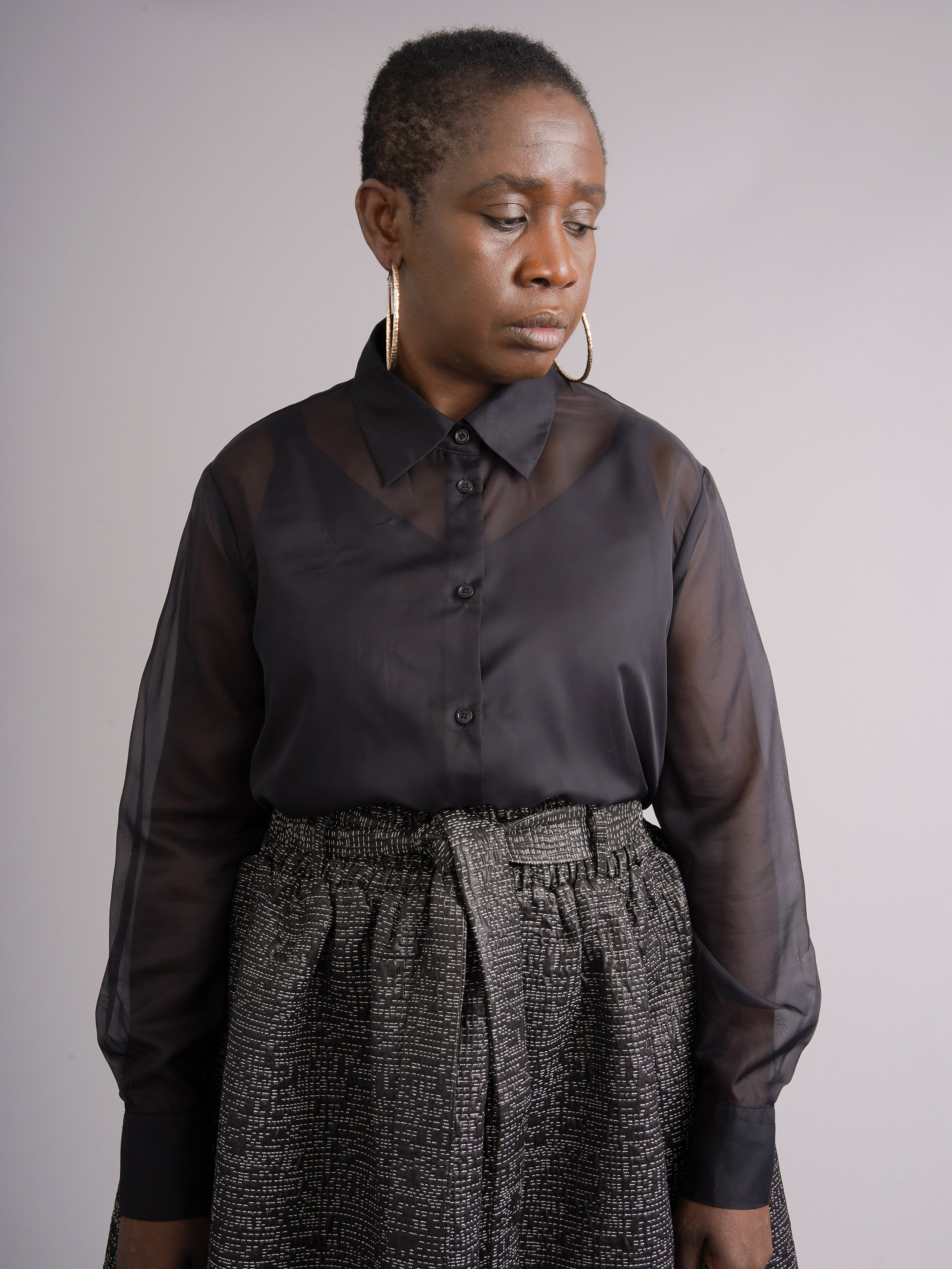 A sheer shirt cut from lightweight black chiffon. Designed with a semi-Italian collar and button front. Comes with a matching slip for coverage, finished with adjustable straps. Perfect for special occasions and everyday wear. You can style this blouse with any of our skirts or under our dresses. It also looks great with your classic blue jeans.
