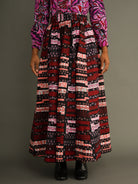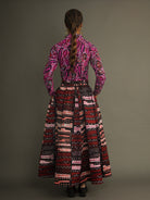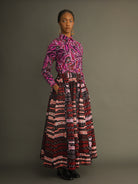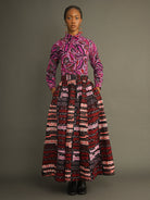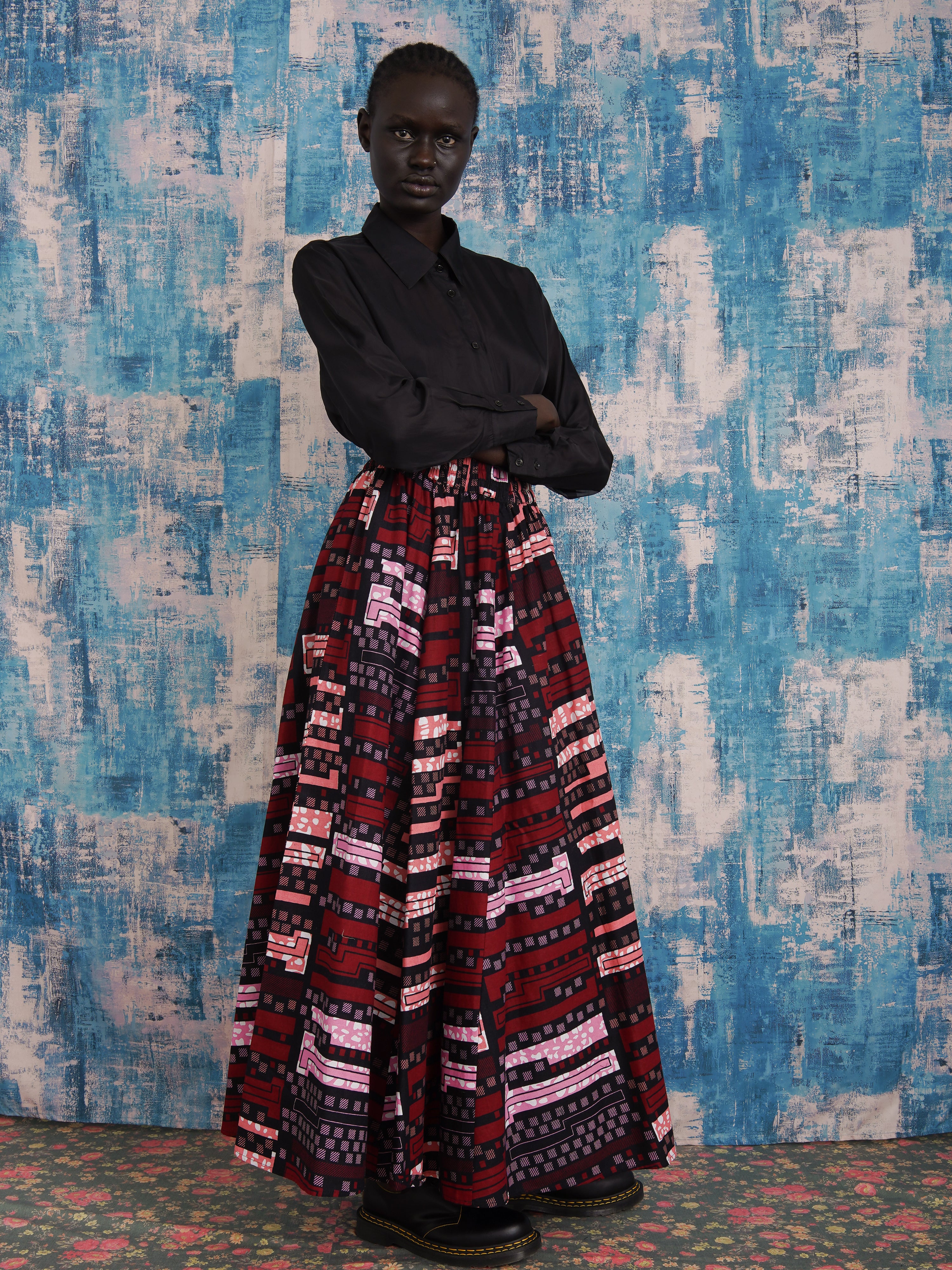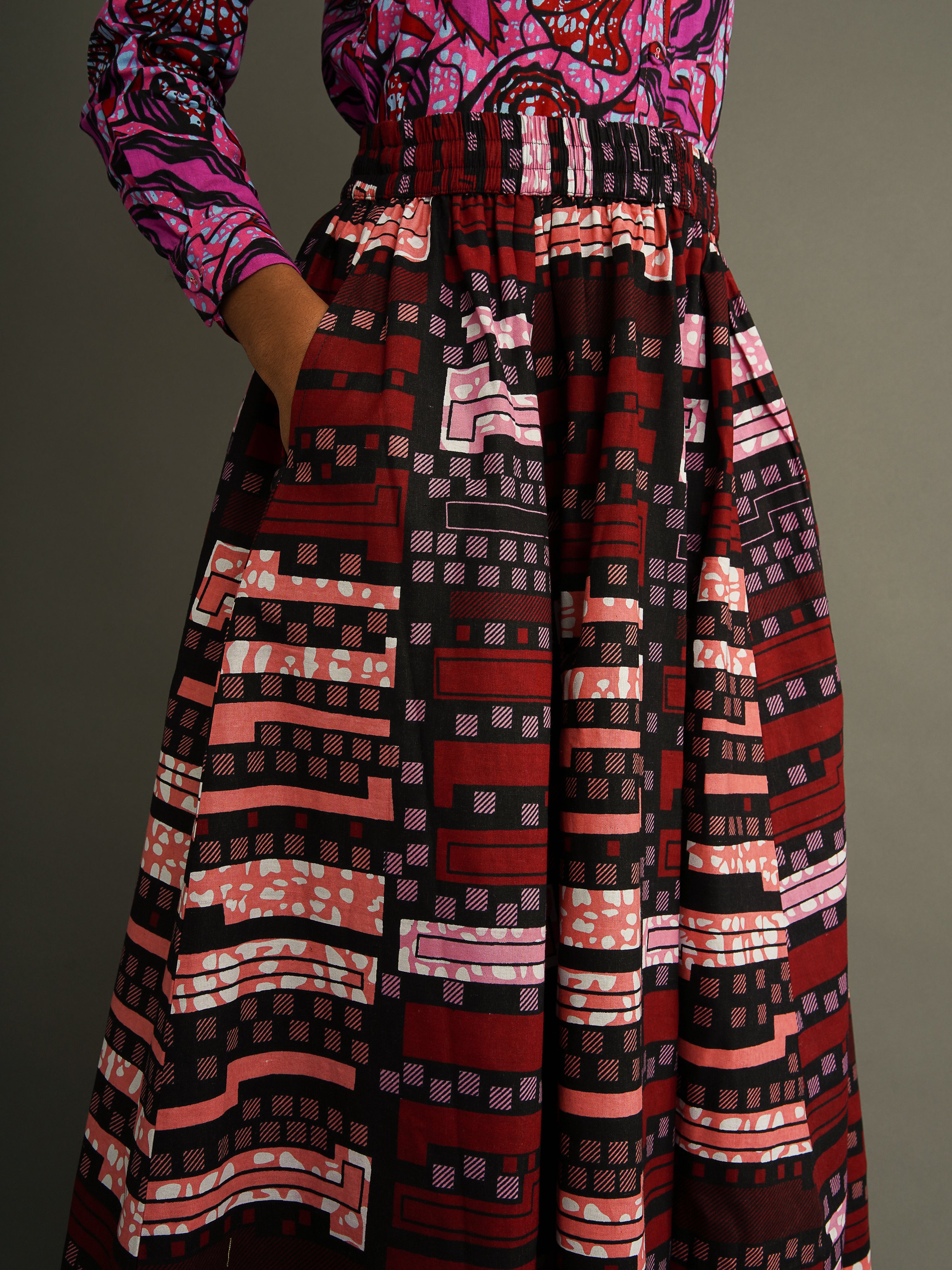 Statement maxi skirt in bold Dutch wax print. Elasticated drawstring gathered waist. Full-length, full silhouette. Panel-cut for structure and movement. Deep pockets. Cut from vibrant African-inspired print.